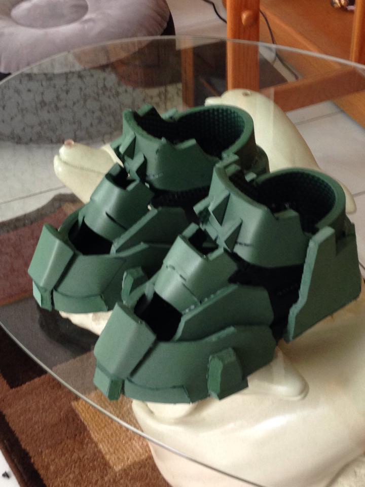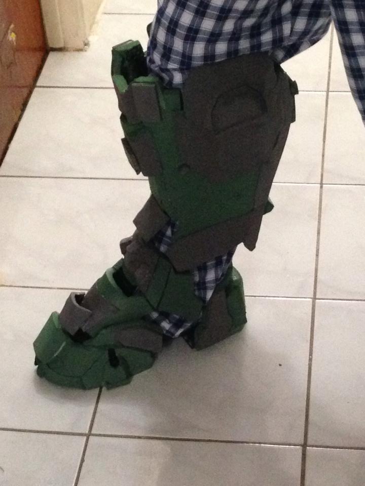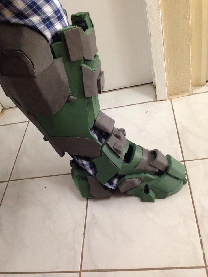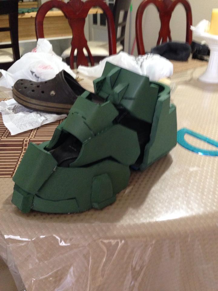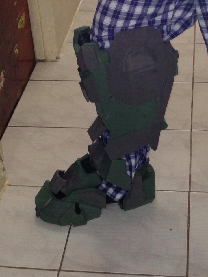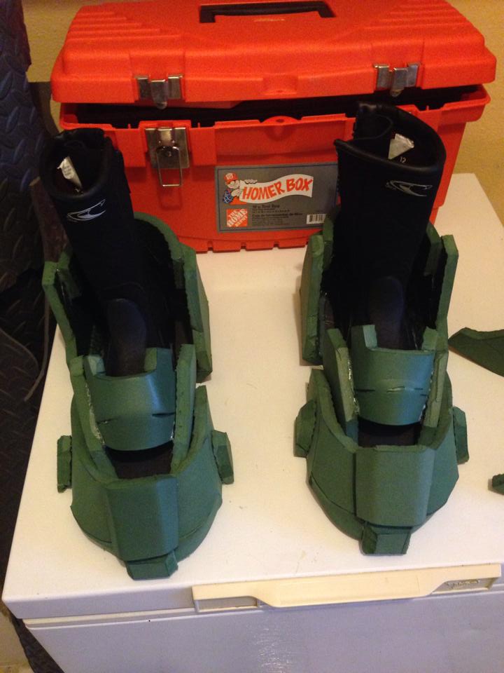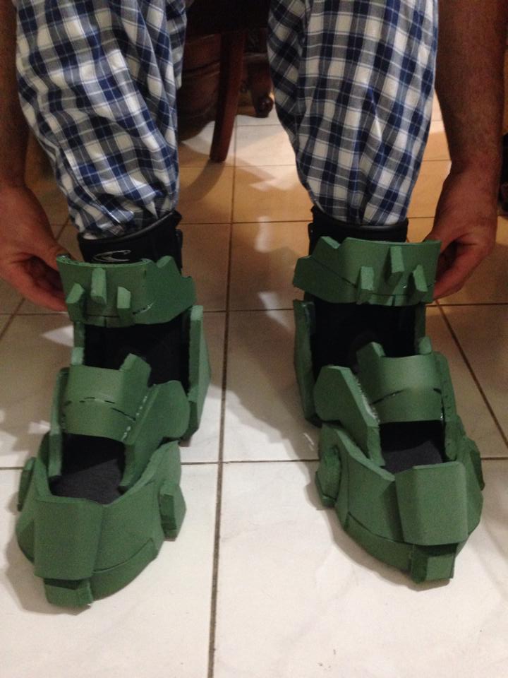 So am back again, started my armor again since i wasn't happy with the other boots i made and the foam i used was thin so they were all wobbly. So the boots , i bought some thick foam and i also bought some surf boots or wetsuit boots. Watever you want to call them, i bought them not because of their awesome details but because they are high top wetsuit boots. So i will be figuring out how to attach the top piece that has the 3 trinagle details to the wetsuit so it can look like its appart from the armored boot. Same goes for the piece that goes inside the top of the feet, i will be glueing them on the bottom of the wings ( making a foam piece so the wings stay float and can look like they are appart from the armored boot as well). Ill post a picture so you can understand better , its like an extended piece for support. the hole thing is raw soo the pictures show pieces that are like misplaced so the thing aint glued or completed yet. So hope you guys like it.