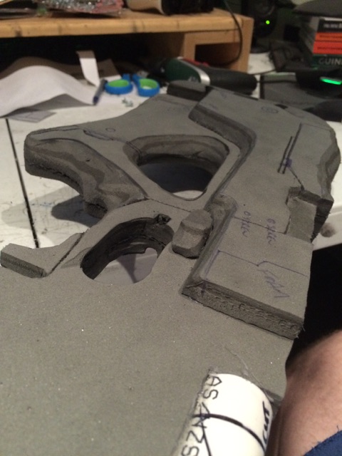 You may note that the magazine here is part of the body template. Something I noticed later in the process is that the magazine looked massively thick, and I realised why - I was raising the flat template to be three-dimensional over the entire thing, but not taking into account that the magazine is much thinner than the rest of the rifle. Take note of this if you do it yourself - it's easy enough to fix by removing the outer layer of foam, but better to do it in the first instance than later on. If you're following along, see if you can pick where I realised this, and thinned the magazine out ;-)