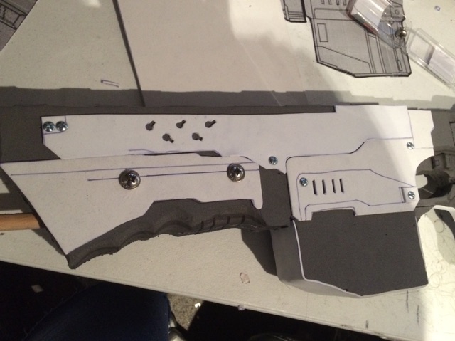 Starting from the back, I cut the blueprint up part by part into sections that needed to be added on as extra layers on top of the base two layers. For each part, I traced the paper onto the foam, cut it out, and reversed that piece onto more foam and traced/cut a reverse for the other side. The first part was the back upper stock: