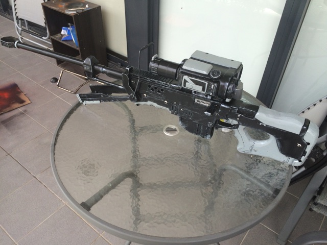 I sat the scope on the rifle to get an idea of the overall scale of the rifle. It was much heavier than I thought, but the scale looked right. I also tried it with my helmet and chest, to see the scale with my body.