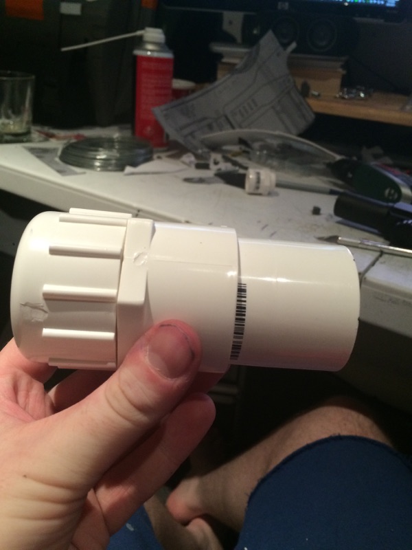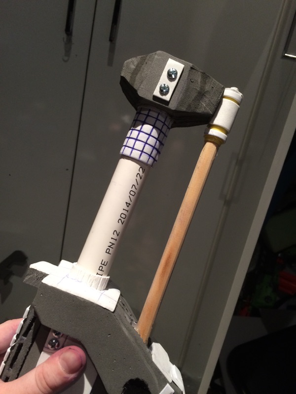 The barrel, needed to be removable, so the easiest way was using plumbing pipes. I picked an appropriate diameter pipe of a meter length and a connector, and cut it to it was extended into the body as far as it extended out from the end (50% in, 50% out). This part needed to be extremely stable, as the barrel extends a long way and needed to have reinforcement in case of knocks and able to hold up the rest of the barrel without bowing or bending.