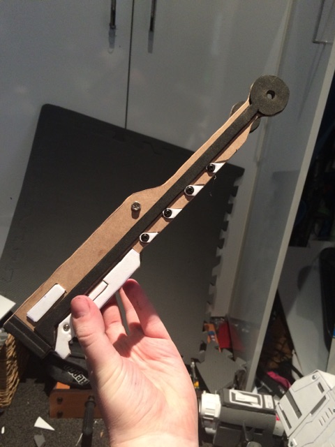 I was initially thinking of making the bipod legs from plastic or foam, but they were too bendy. I went with some spare MDF, which was stiffer and I had spare. I cut them out and sanded them, added detail with craft foam and screws. I found that they wouldn't support the full weight by themselves, but by affixing a joining screw in between the end of the legs, they stood a much better chance of standing up.