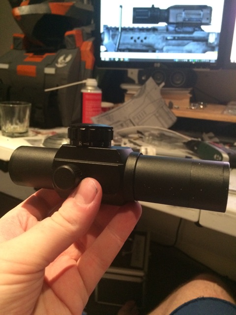 The (first) scope I made was based on the idea of wanting to be able to actually look through it. So, I decided to base it around an *actual* scope, a $20 metal airsoft scope I bought online.
