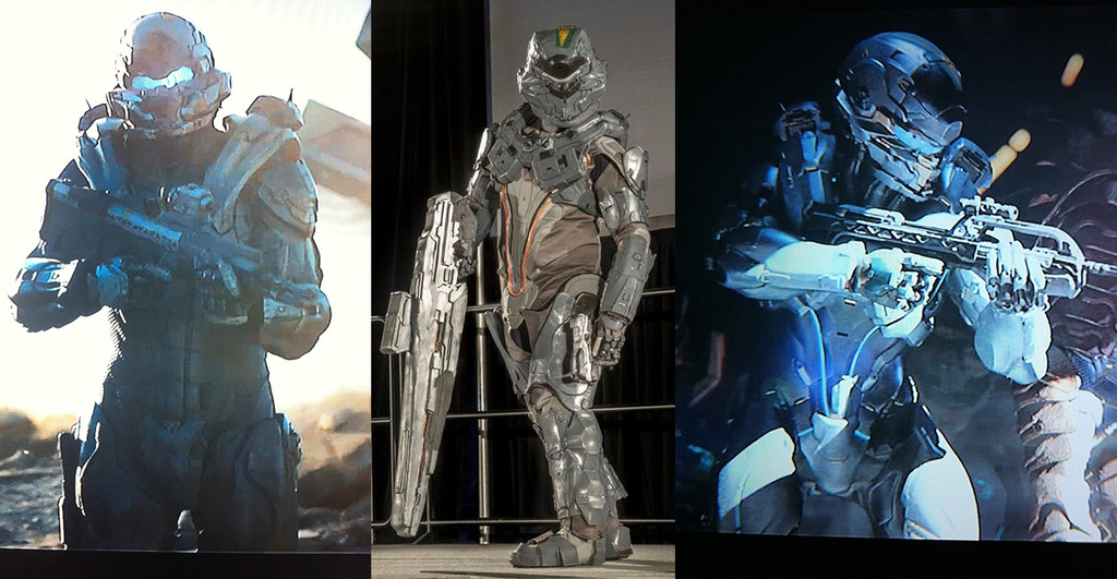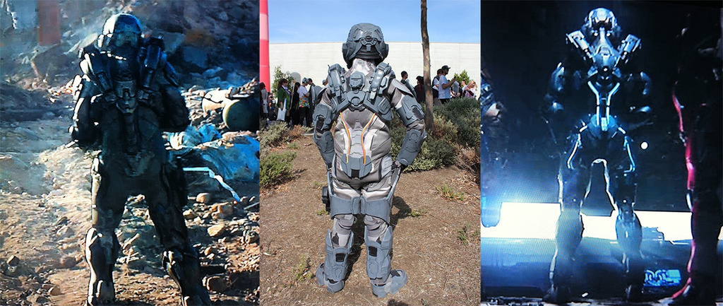 Here are some pictures of the suit side by side with my 2 main references. On the left the live action trailer suit and on the right the in-game suit. When making mine I used both of these designs and merged them into my own take on it.