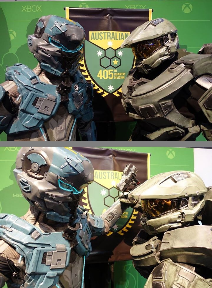 Here are some pictures of the suit side by side with my 2 main references. On the left the live action trailer suit and on the right the in-game suit. When making mine I used both of these designs and merged them into my own take on it.