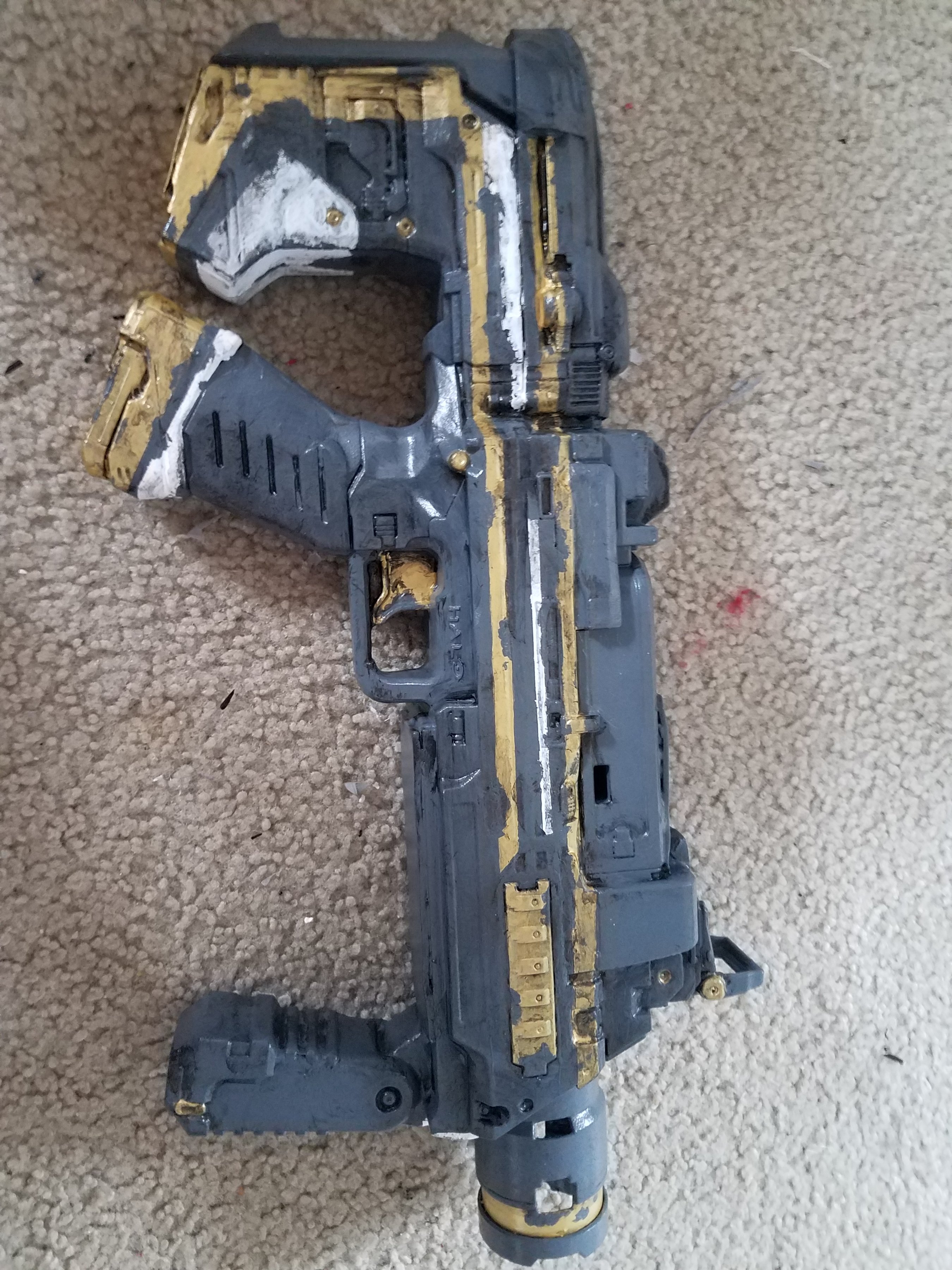 Here are my painted guns! I didn't have time to make them so I ordered the boom halo guns and blocked off the holes and primed and painted it. I used the gold standard skin from halo 5 as reference and I weathered it since I thought that it wouldn't make sense if my armor was all beat up and my guns looked brand new. And then I tried to paint on the 'UNSC' on them but I did not like how it was turning out so I just didn't put that. And yes I know vale's choice is the plasma pistol before the magnum, but I like the magnum more so I did that, but maybe later I will do the plasma too.