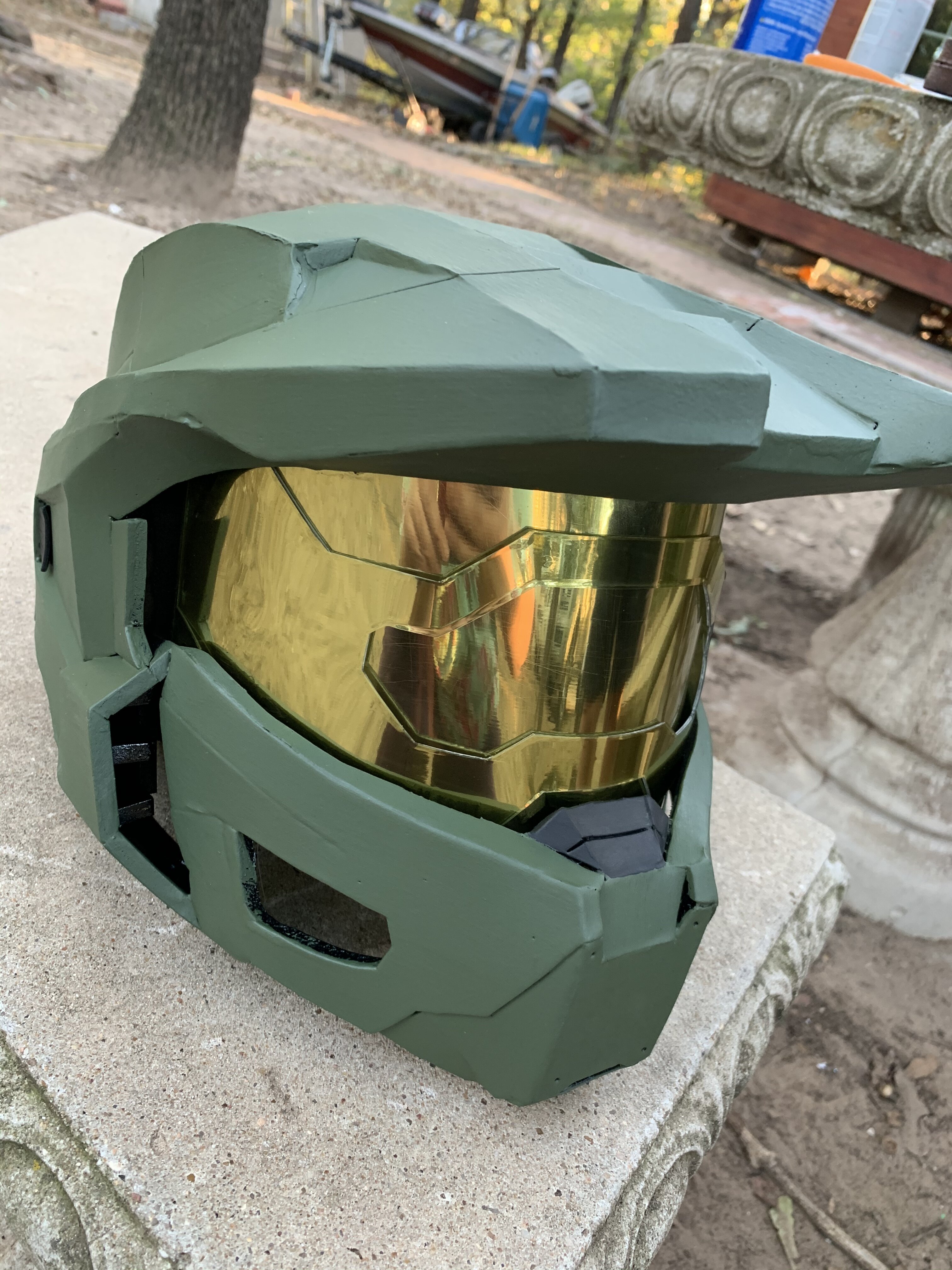 The lights were made with cheap finger lights that fit into slots so I can change them out in the future. Also something funny happened at the end of making this helmet. I was spraying some matte clear coat onto the helmet to protect the paint, but I forgot to cover the visor. I was so scared. I thought I had ruined my helmet. And I did... for only five minutes. I learned that I could scratch it off the visor, so I used it to my advantage. I scratched most of it off leaving some of it behind to make a grime on the visor. This made it look even better. I am so happy with this helmet. All that's left now is to paint the rest of the suit, and make some tweaks to make it all more comfortable.