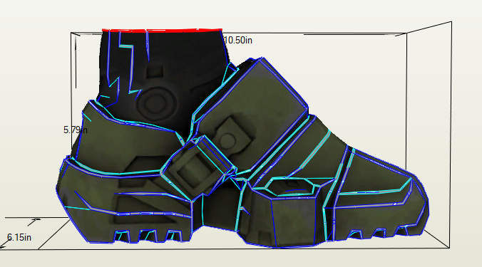 Making the boot was a tricky task. I used 5mm foam to give me as much space as possible. The shoe itself is built on top of a half-inch piece of plywood for the heel and sole of the boot. I bought a cheap tennis shoe and screwed it onto those wood pieces and had to cut off the tip in order for it to fit inside. I also took out the foam sole so my foot could fit. If you're measuring upwards, I'd start a half inch from the bottom.