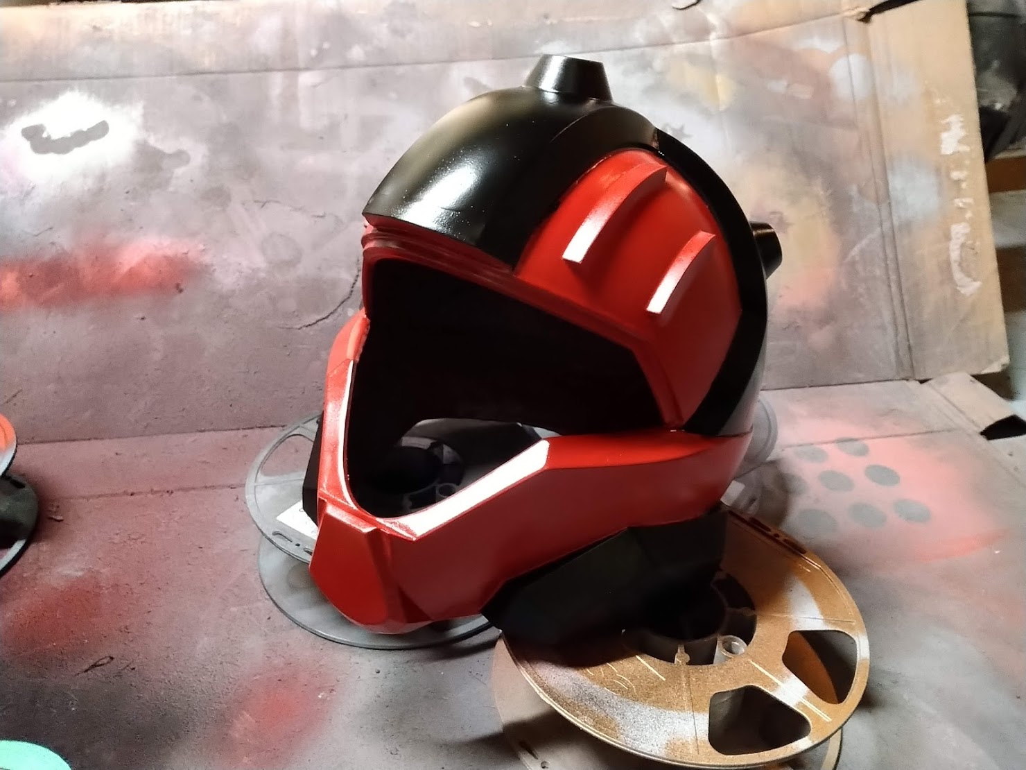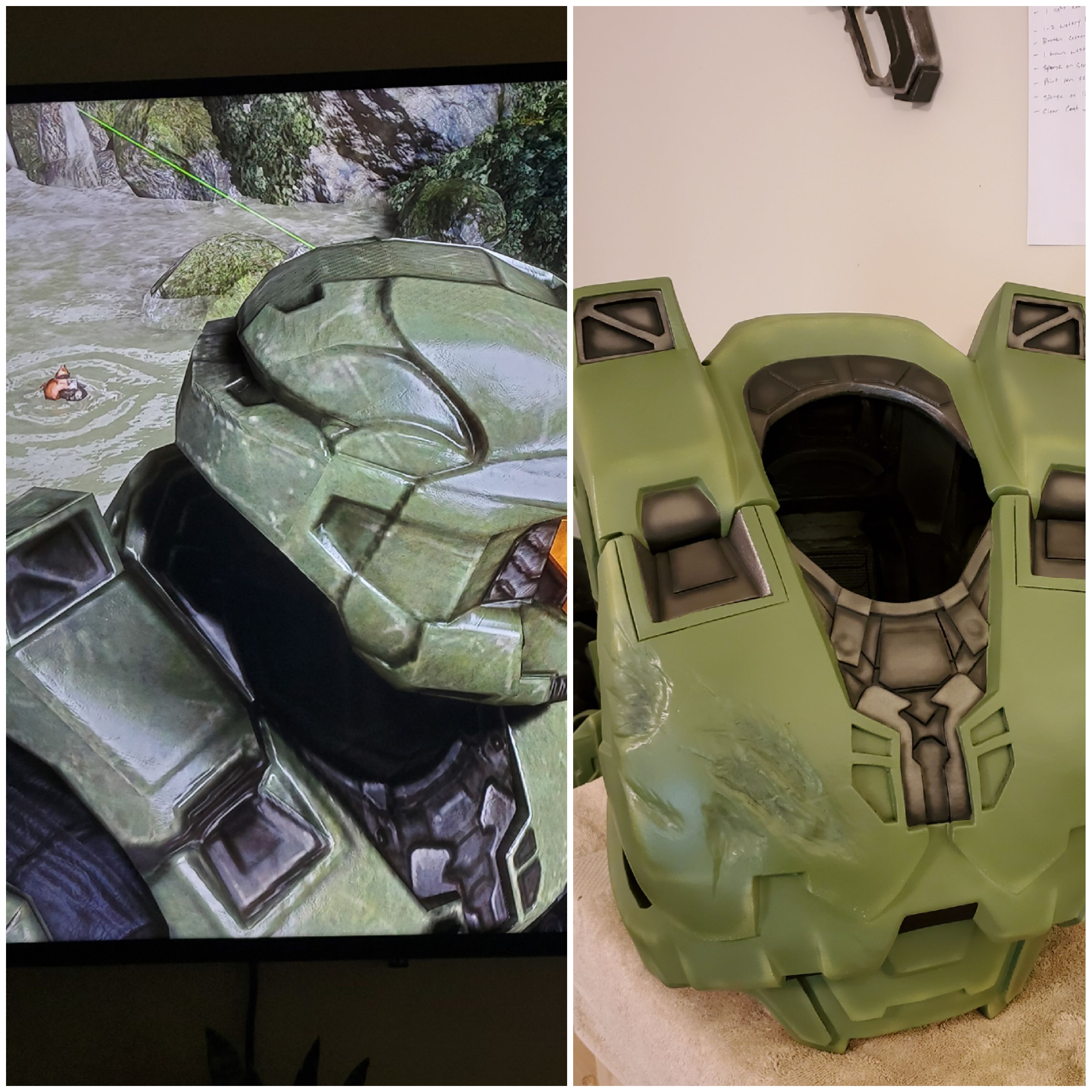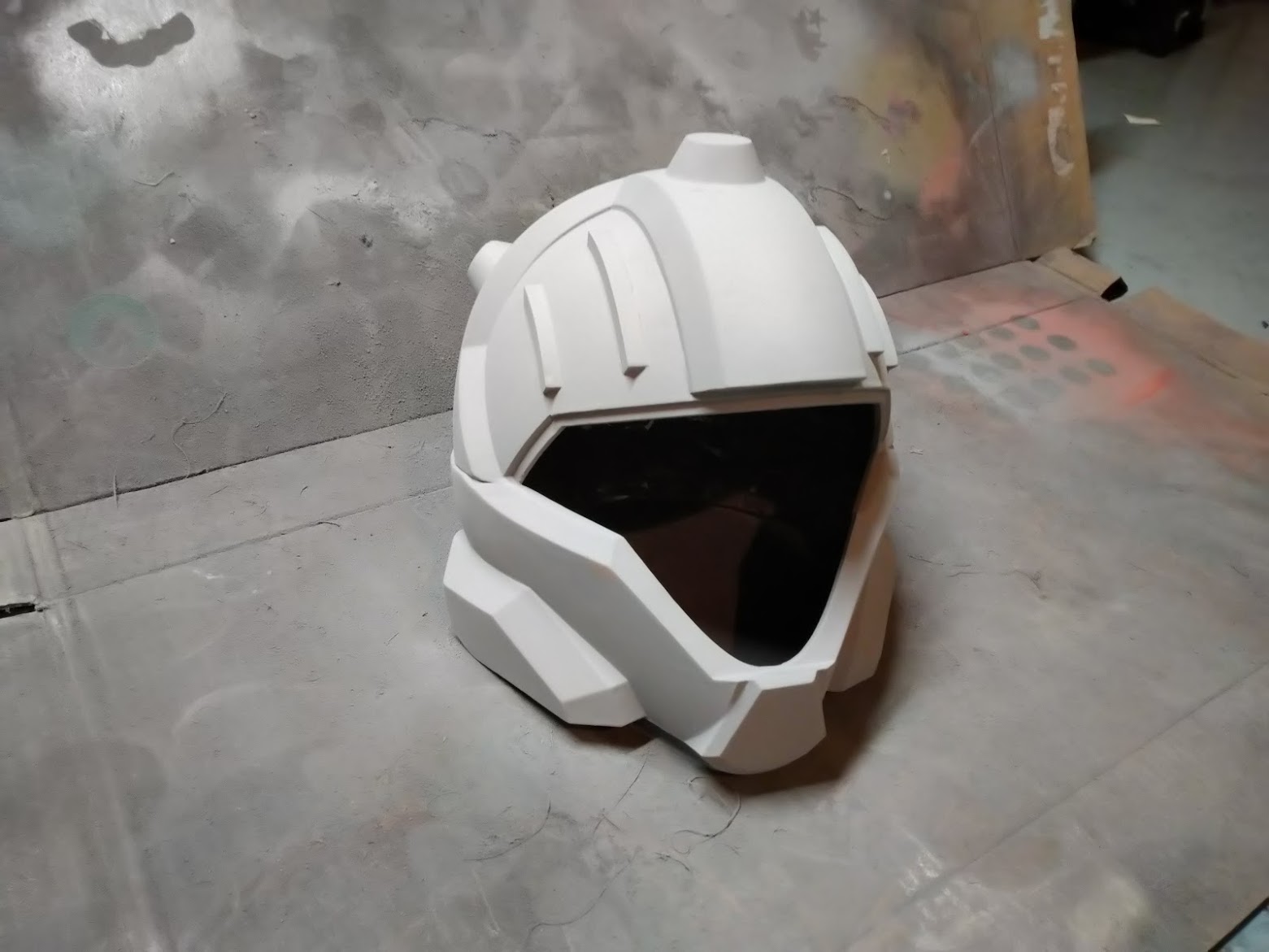 Fast forward to November when I had some downtime on my large format printers and redid the helmet at a slightly larger scale to help with comfort. Over the past two weeks I finally found the gumption to assemble, sand, prime, sand, fill, sand and prime some more until we got to here. A nice smooth helmet.