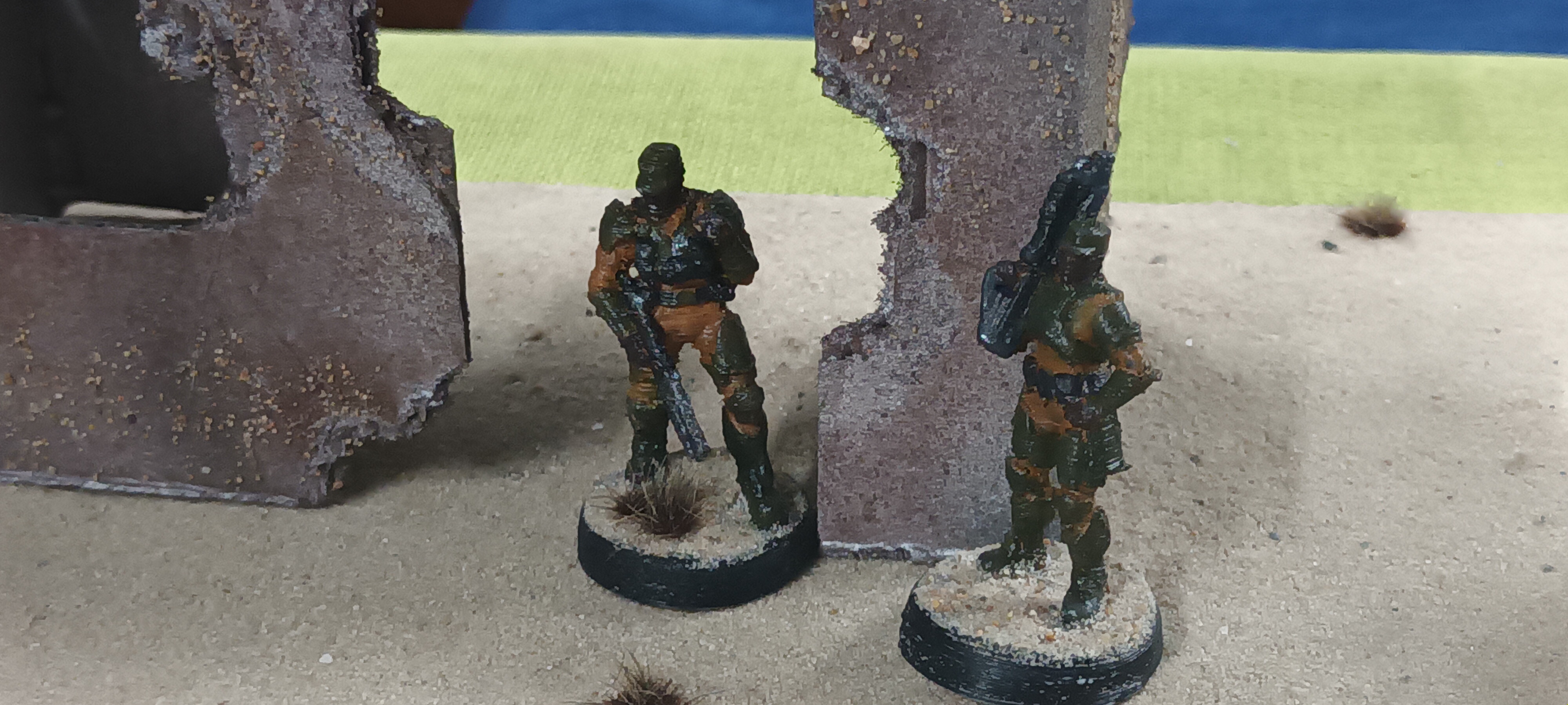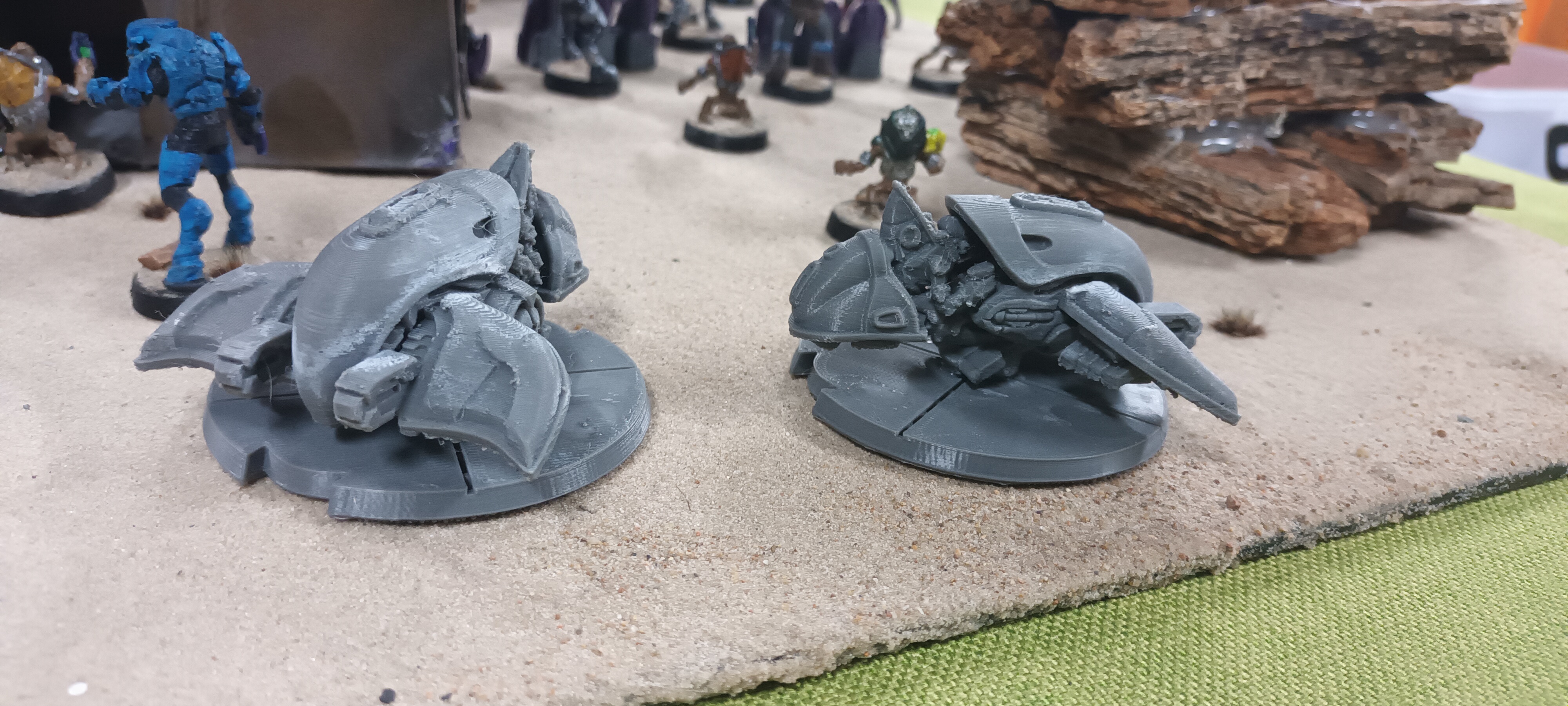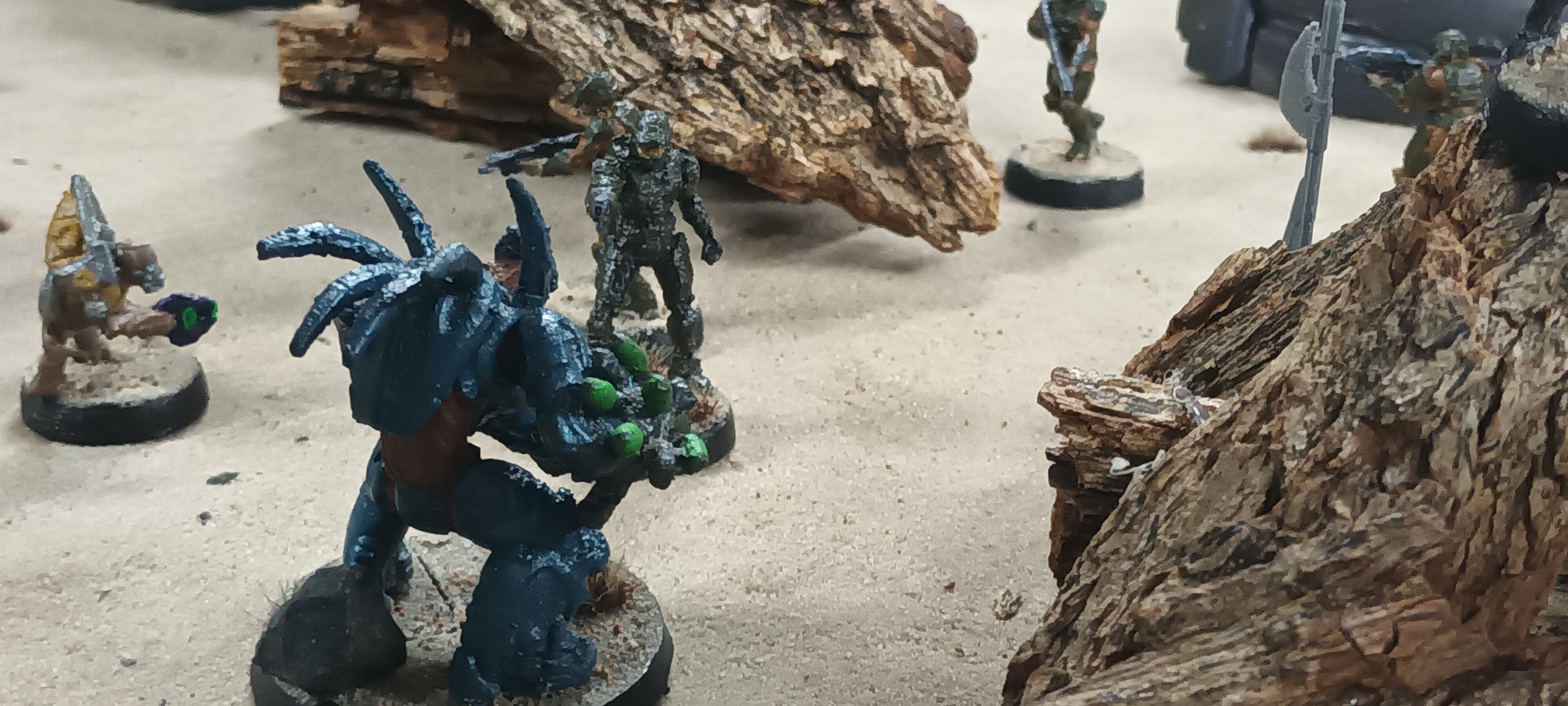 For a while now I've been working on making Halo UNSC and Covenant Armies to play in a board game called Star wars Legion. 2 of my brother's each own a different starter set copy and a few bonus sets so I thought I'd transfer the game components into a much cooler franchise. Most of the rules/army units were made by other people, so I just adjusted them to better suit the characters. Then I made a couple of my own army units for each side. My little brother made the large "rock formations" from hot gluing tree bark and they look pretty good on the sand board so I included them when setting up this little diorama.
