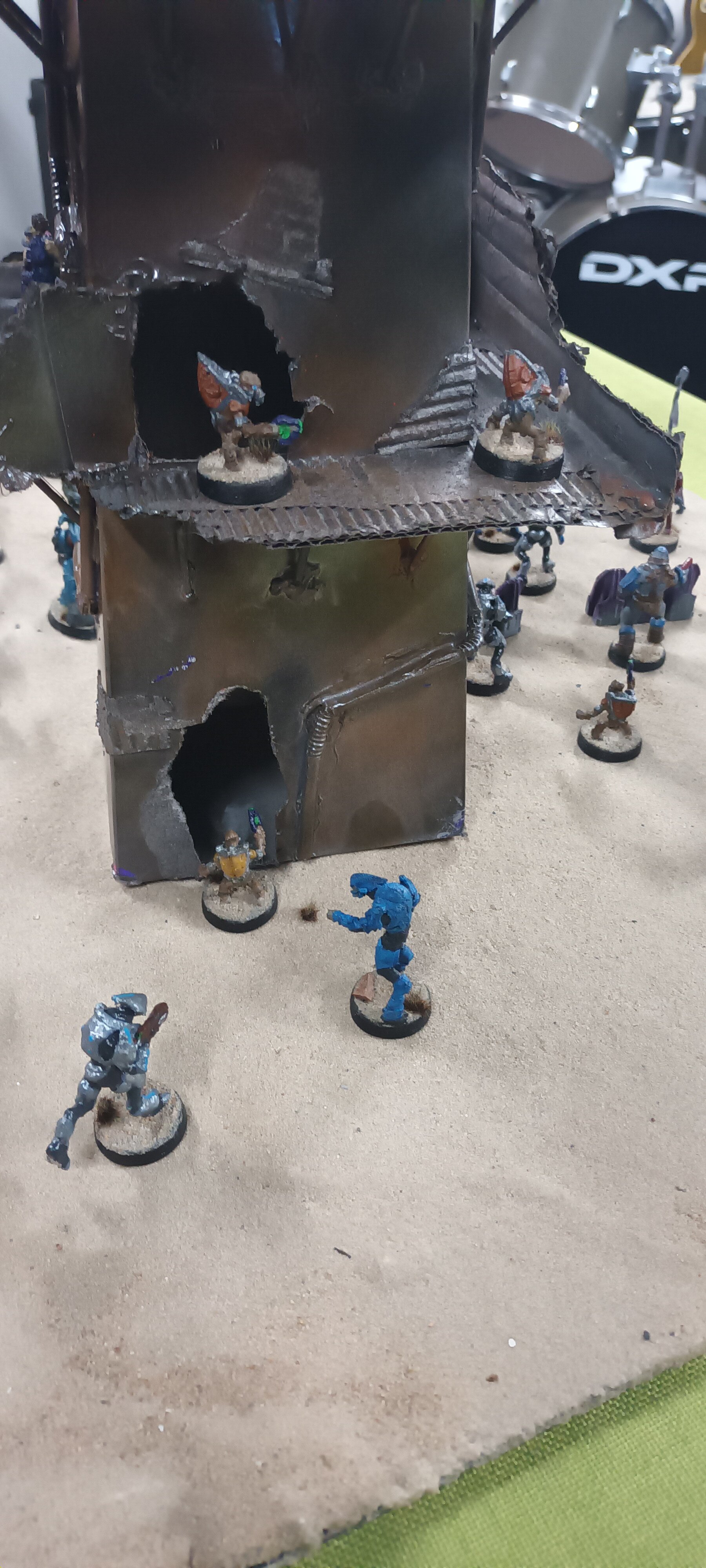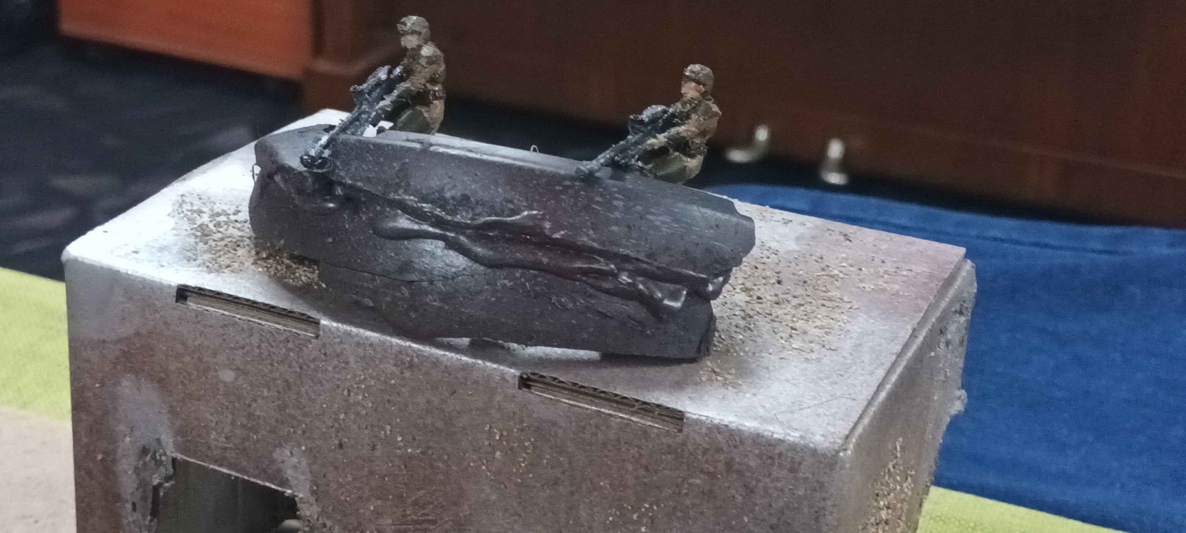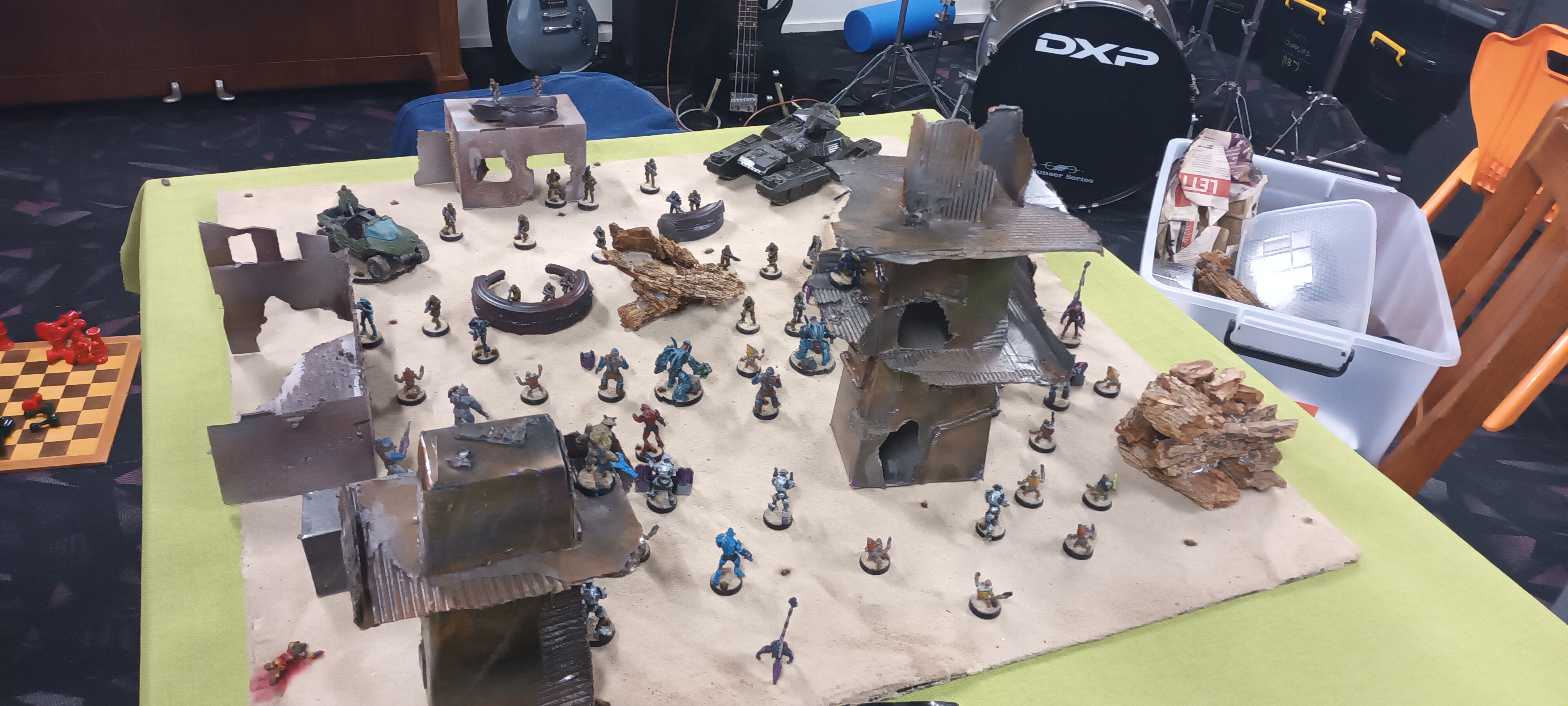 For a while now I've been working on making Halo UNSC and Covenant Armies to play in a board game called Star wars Legion. 2 of my brother's each own a different starter set copy and a few bonus sets so I thought I'd transfer the game components into a much cooler franchise. Most of the rules/army units were made by other people, so I just adjusted them to better suit the characters. Then I made a couple of my own army units for each side. My little brother made the large "rock formations" from hot gluing tree bark and they look pretty good on the sand board so I included them when setting up this little diorama.