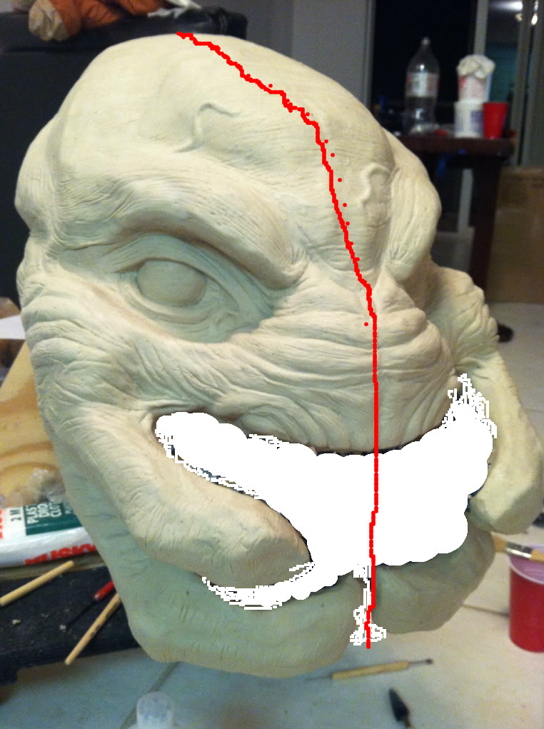 The white area indicates where I intend to close the mouth off, I will do the same underneath. The red line is where Intend to part this beast both on the silicone and the hard jacket. The jacket might be 4 parts, two for the left and two for the right, to avoid mold lock.