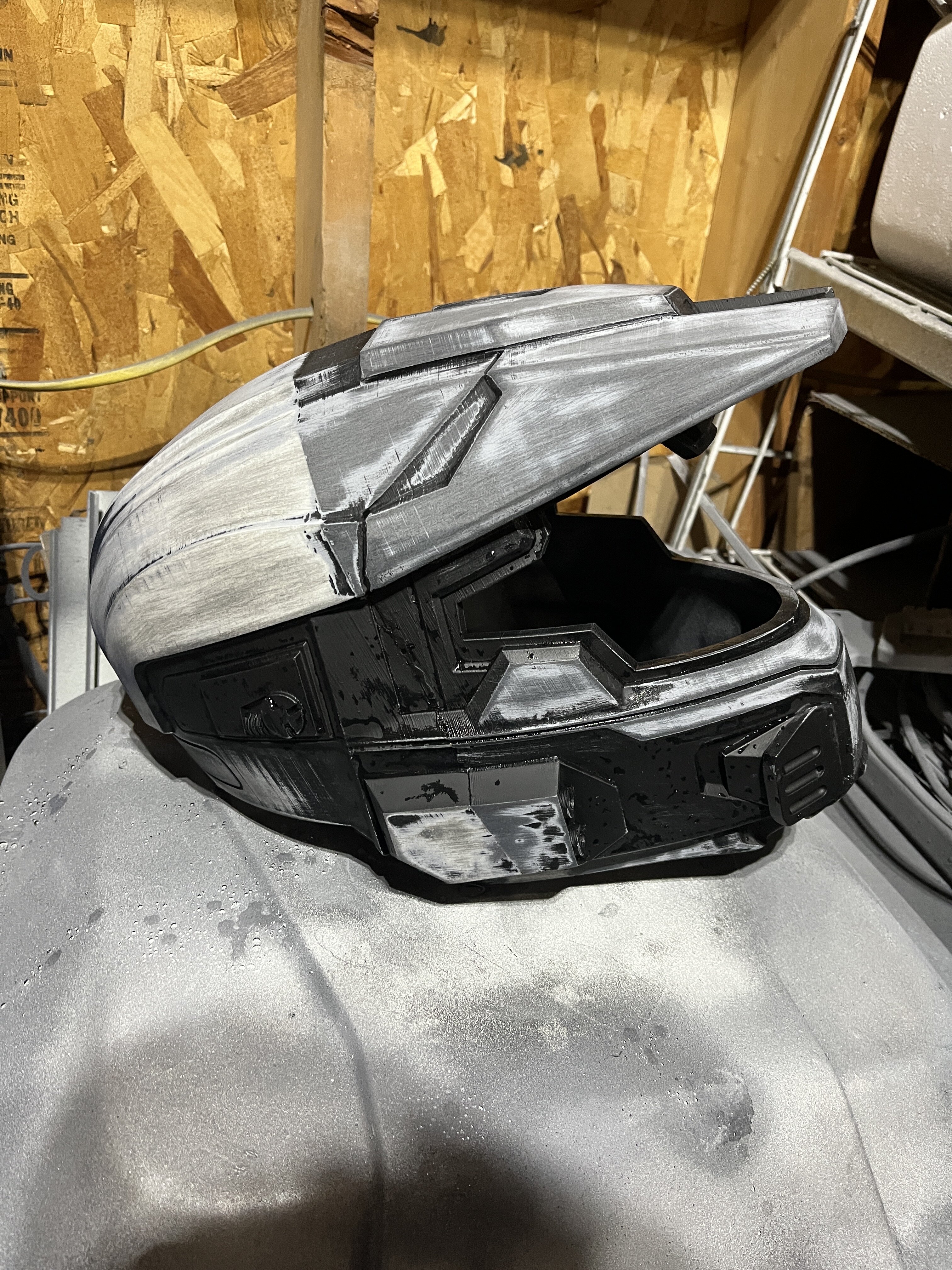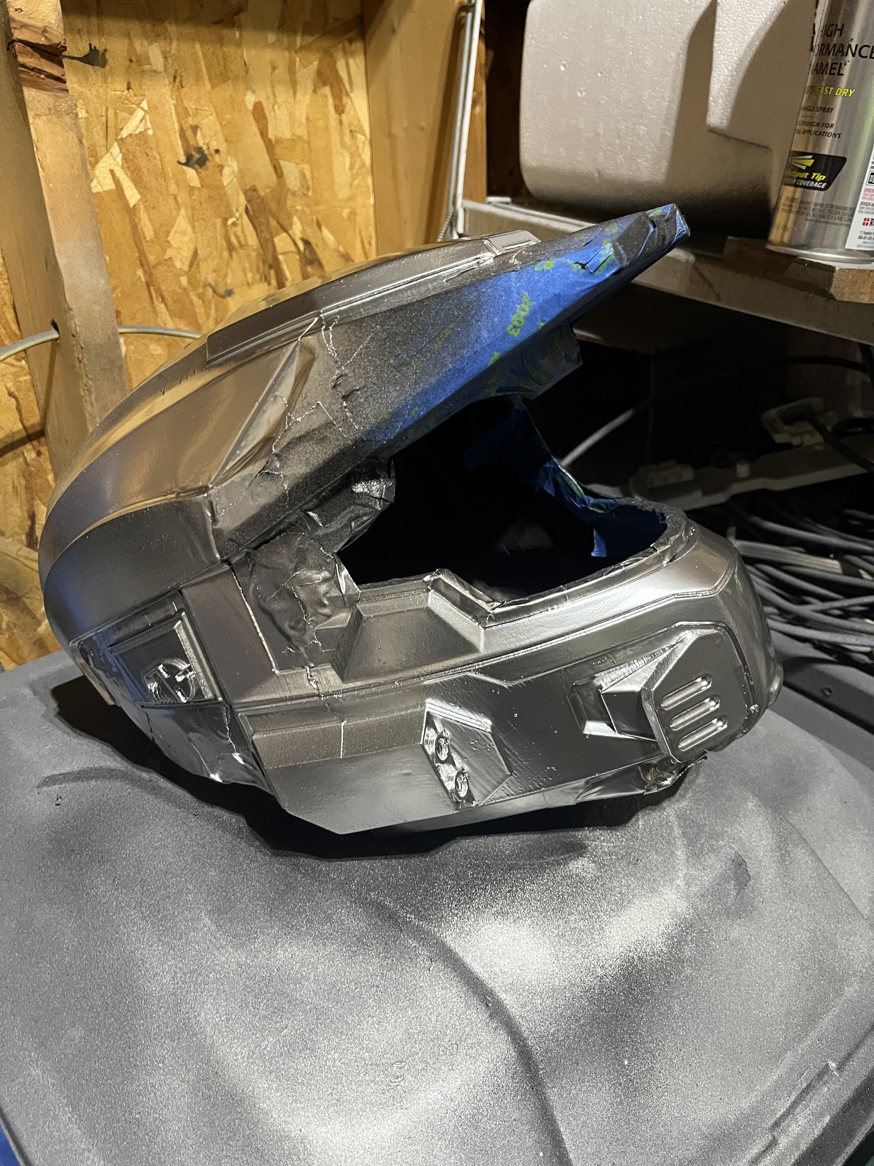 As I finished that up I moved onto painting, hitting the helmet with some black and masking off the sort of composite looking parts. Then some silver and toothpaste for paint chipping, and finally a nice gray for the base coat!