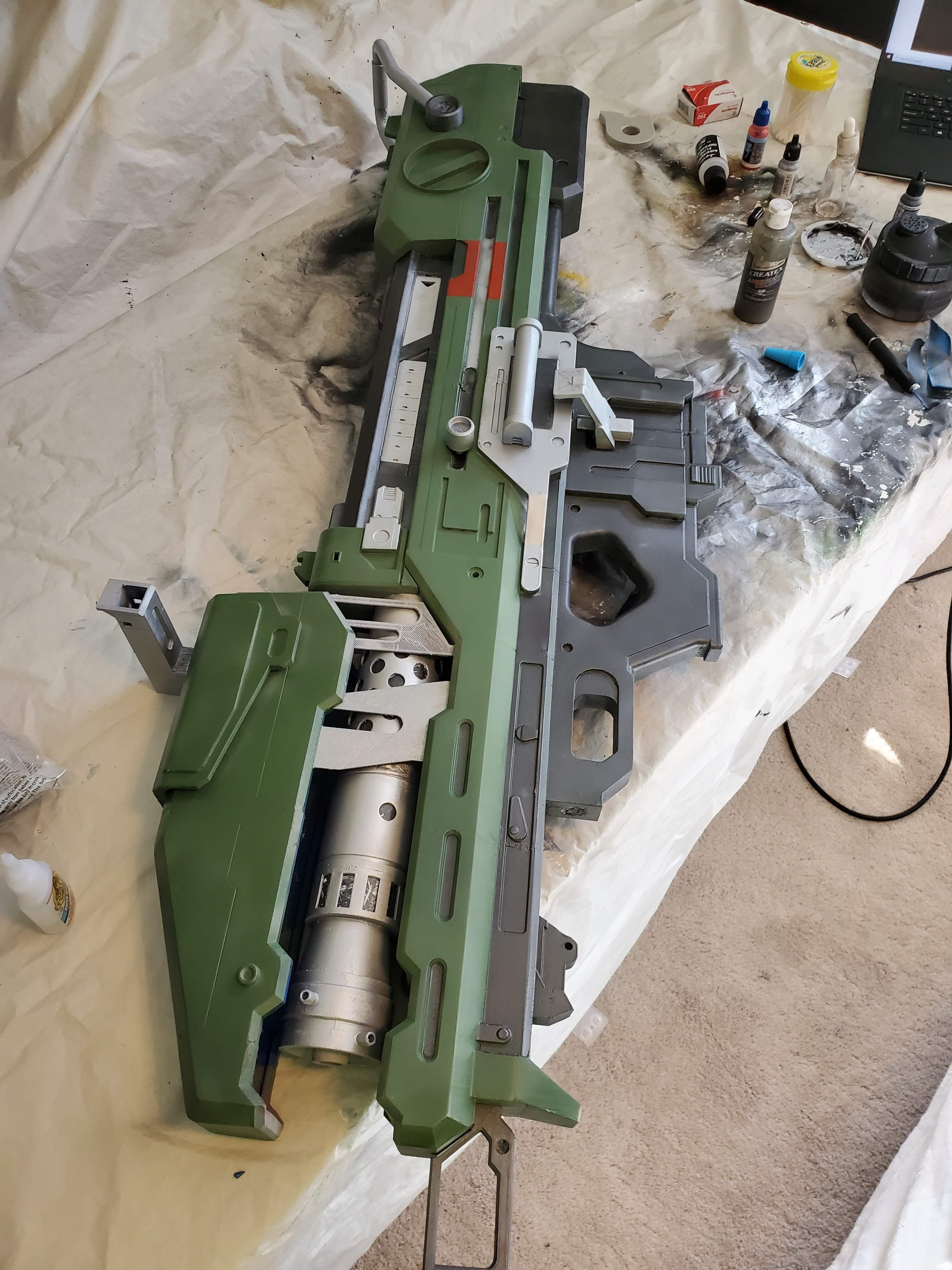 sanding sanding sanding sanding (and more sanding). I sanded this while my Reach suit was drying in between paint coats and still took over a day to prep for painting. An electric sander is a necessity when doing larger projects like this (especially if you like your arms). Used the same shade of green that I used on my Brohammer build (Rustoleum olive) for the base.