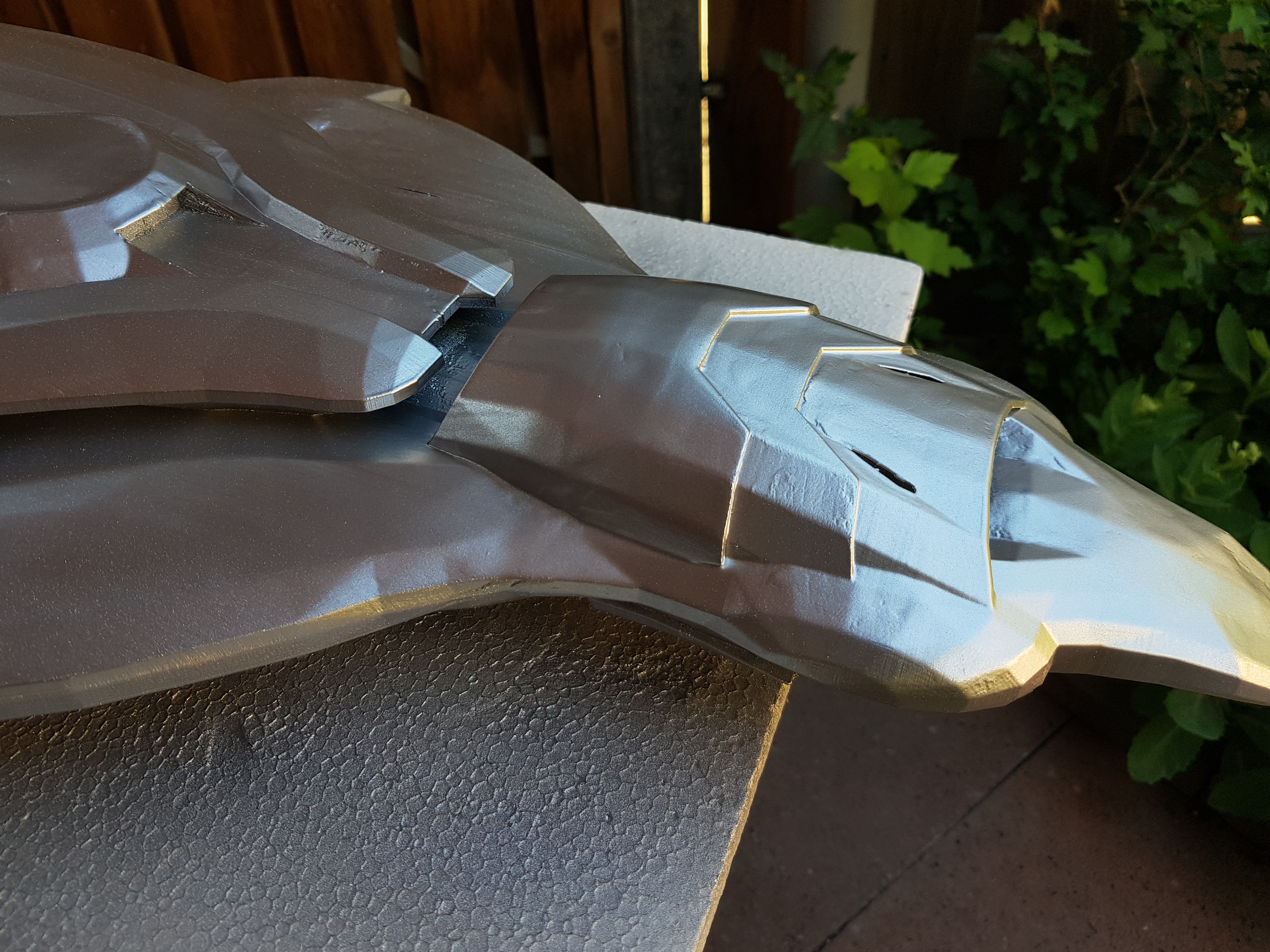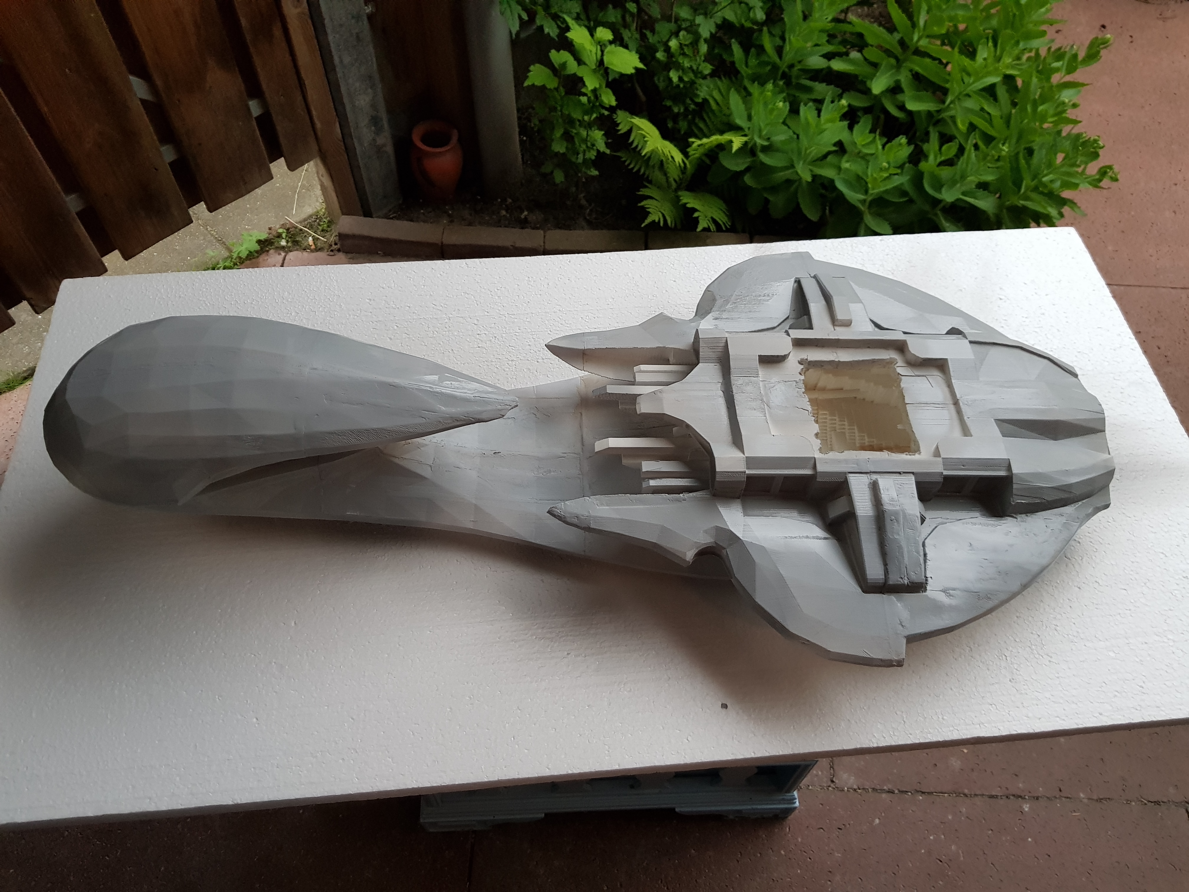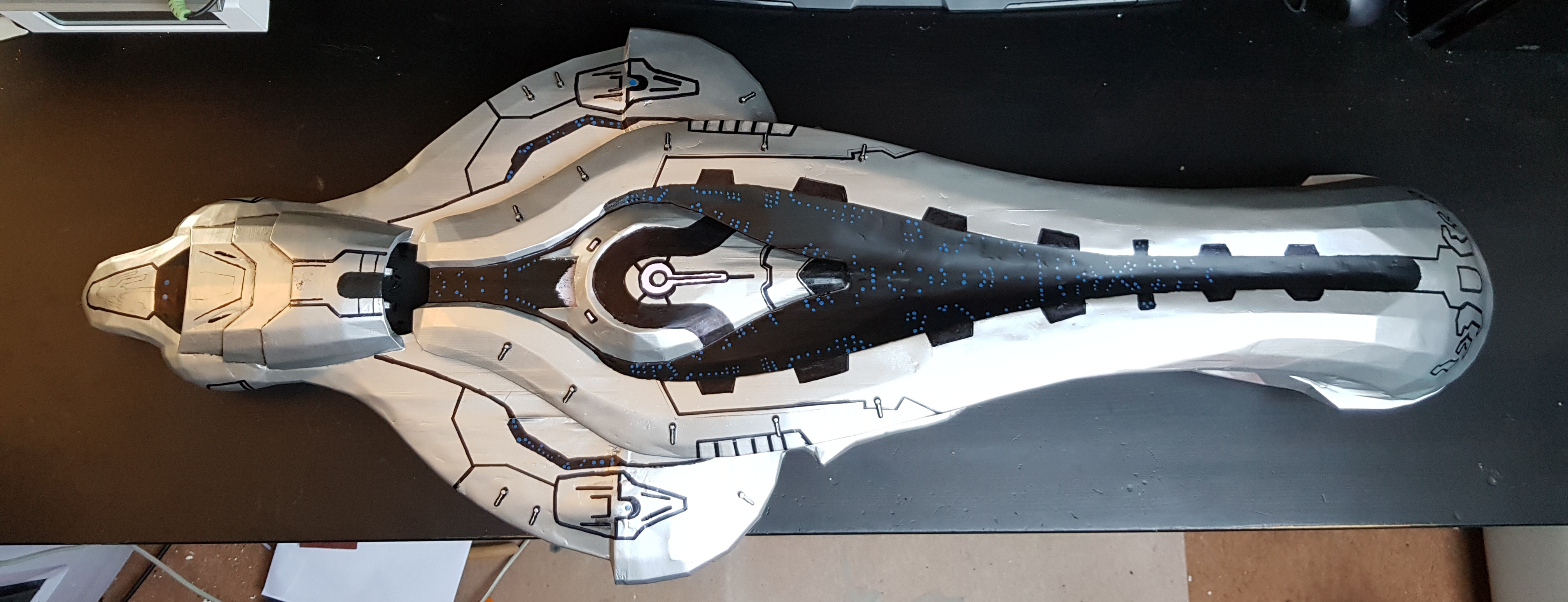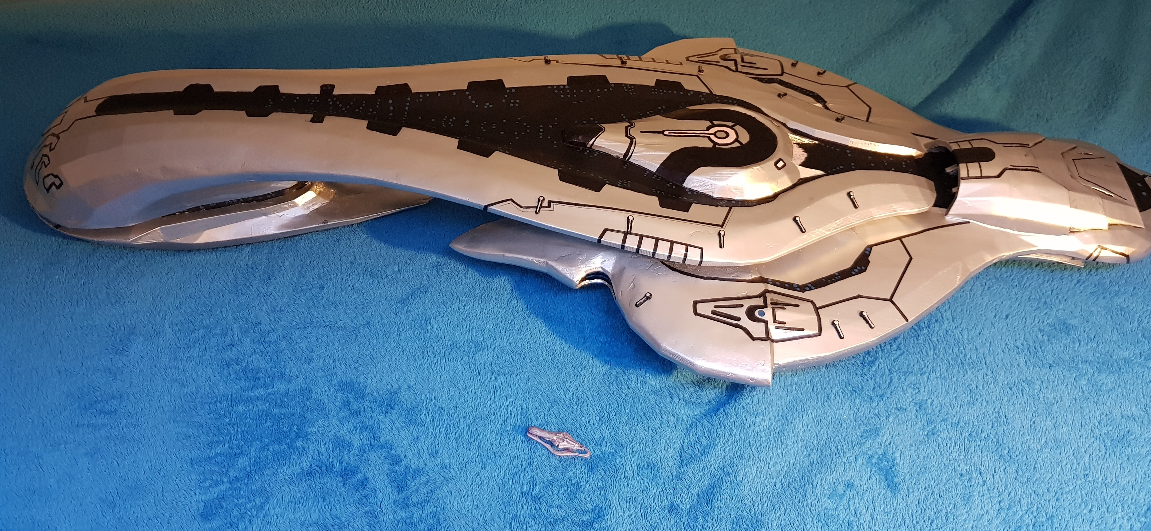 At the moment the ship is about 95% finished. The parts have all been assembled and seams have been filled up. The model has been sanded, painted with primer and painted in its livery according to a combination between the Halo 3, and Halo fleet battles version.
