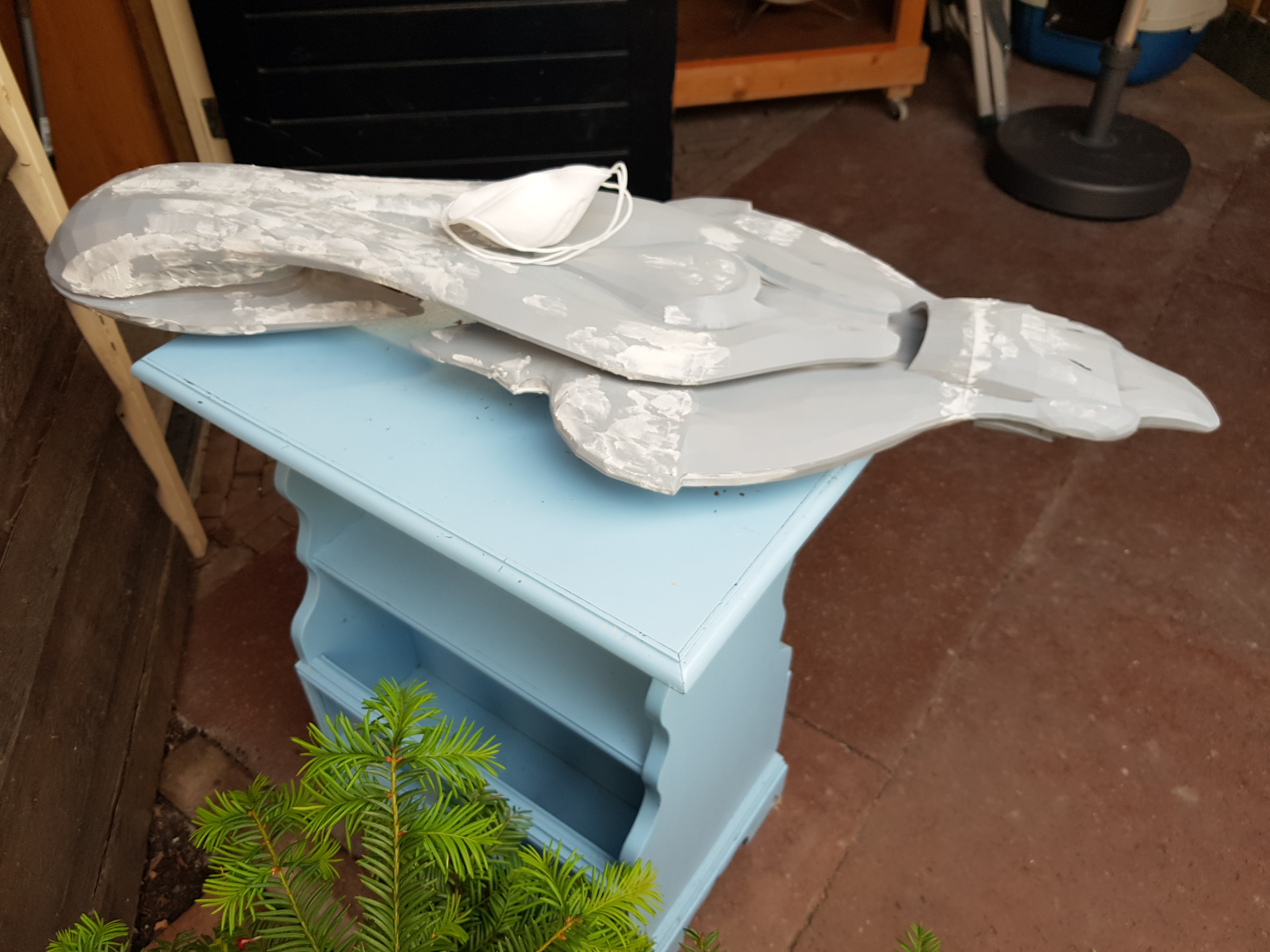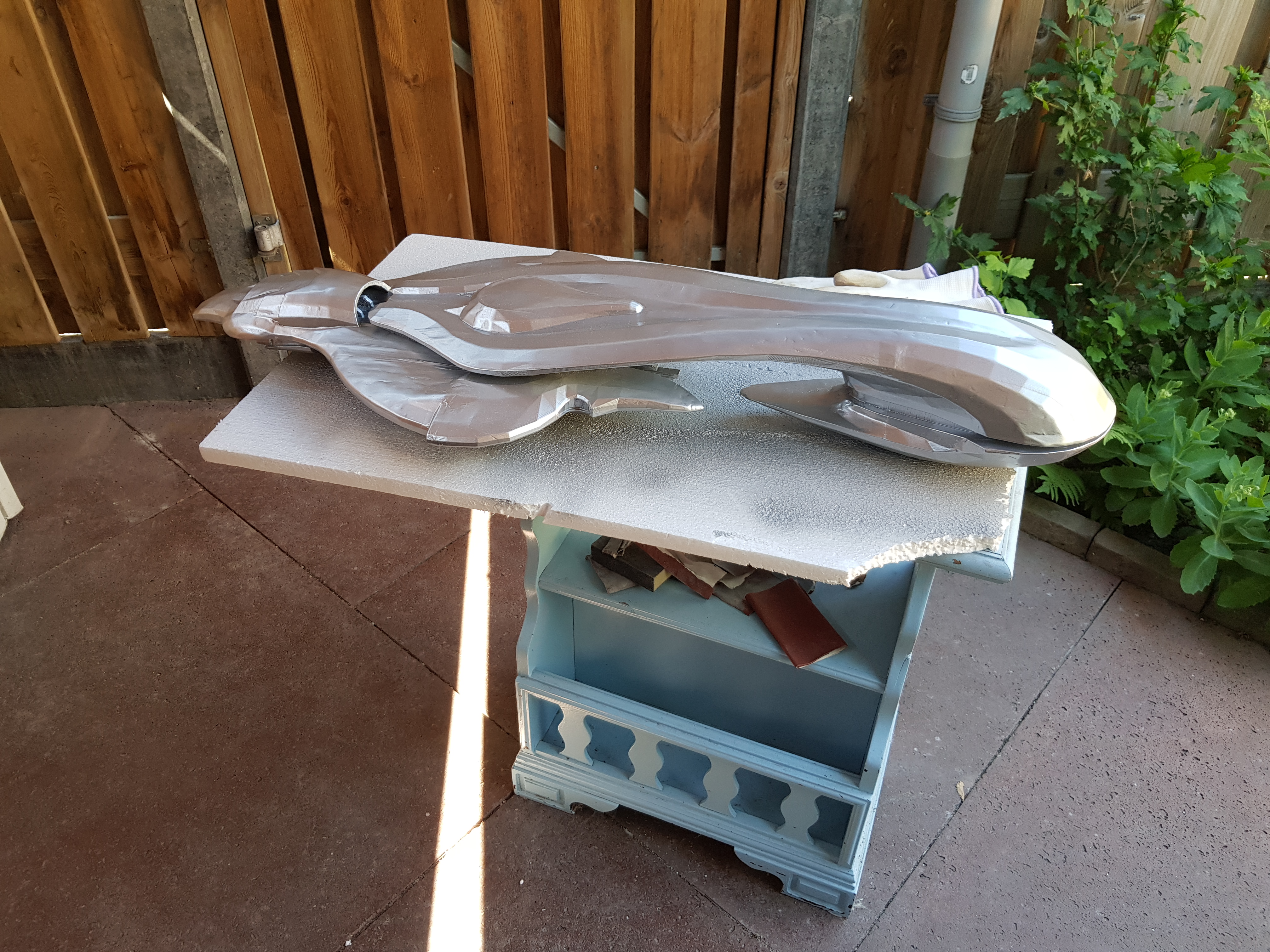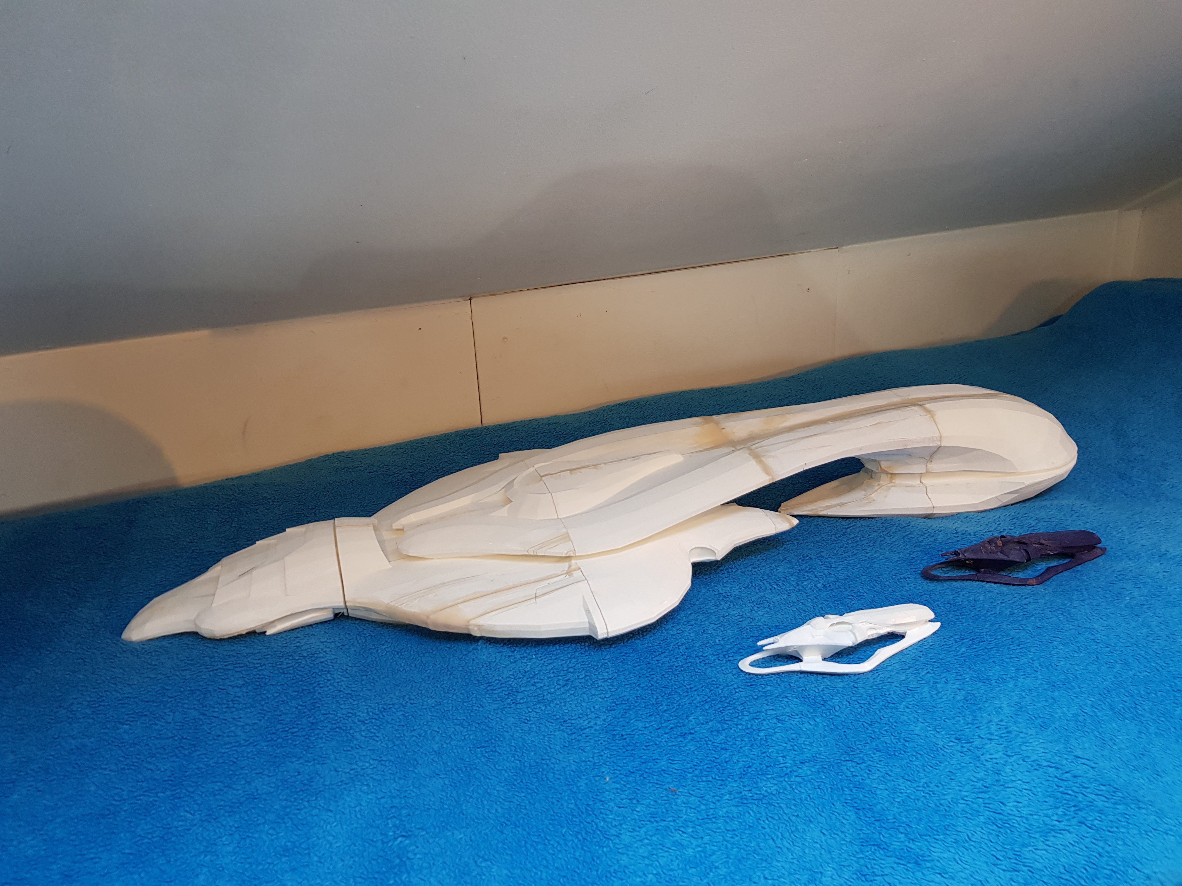 At the moment the ship is about 95% finished. The parts have all been assembled and seams have been filled up. The model has been sanded, painted with primer and painted in its livery according to a combination between the Halo 3, and Halo fleet battles version.