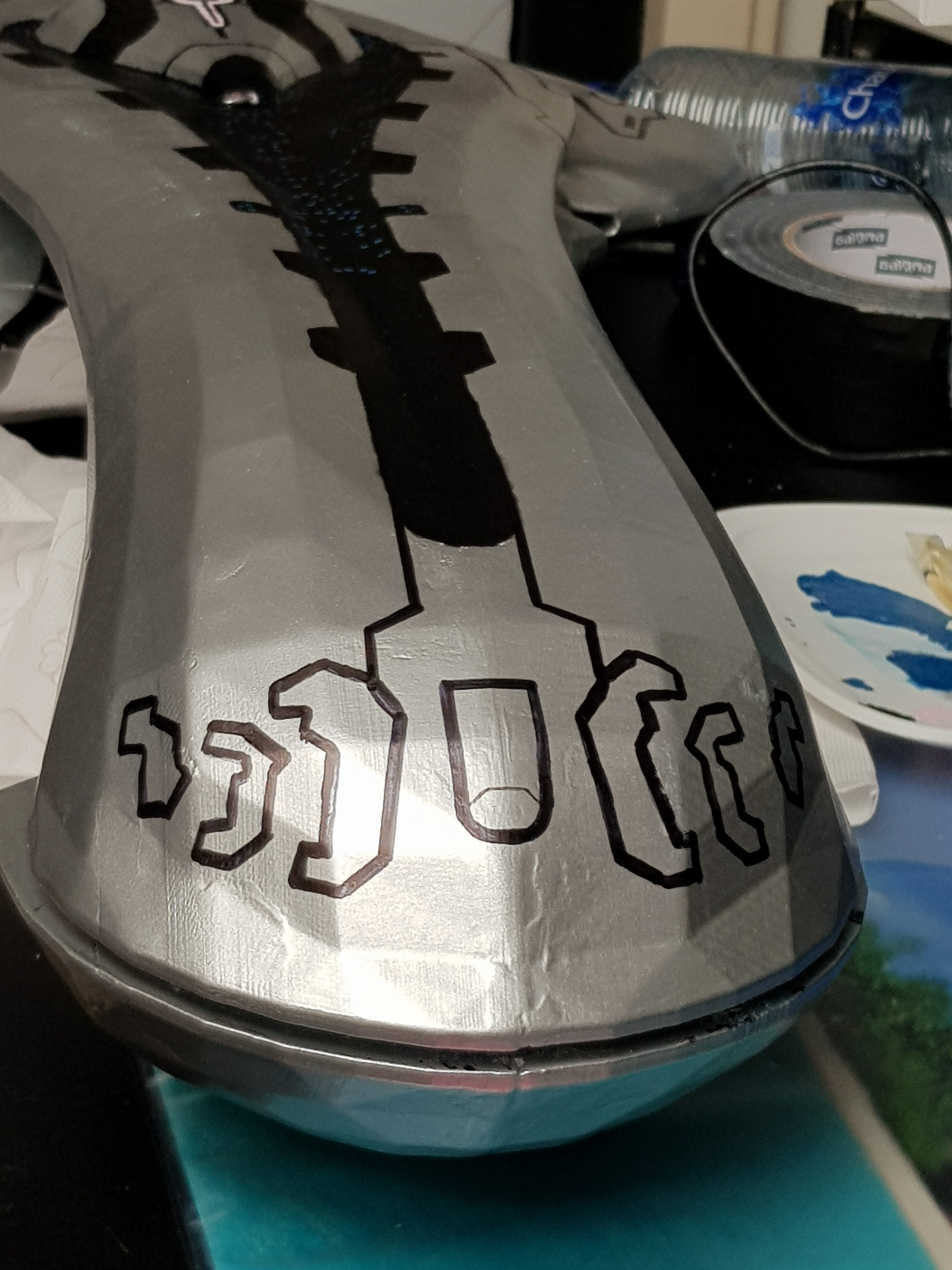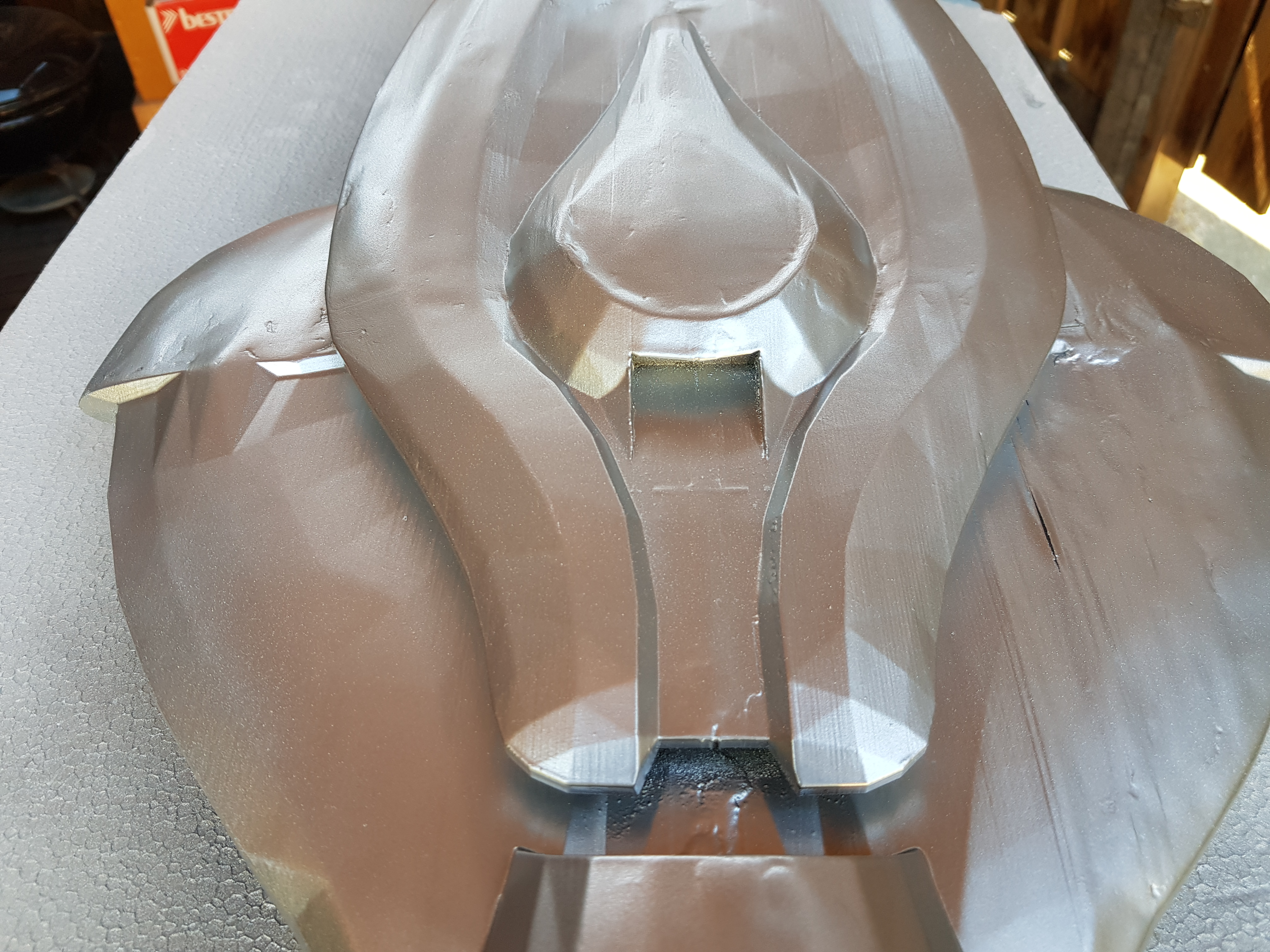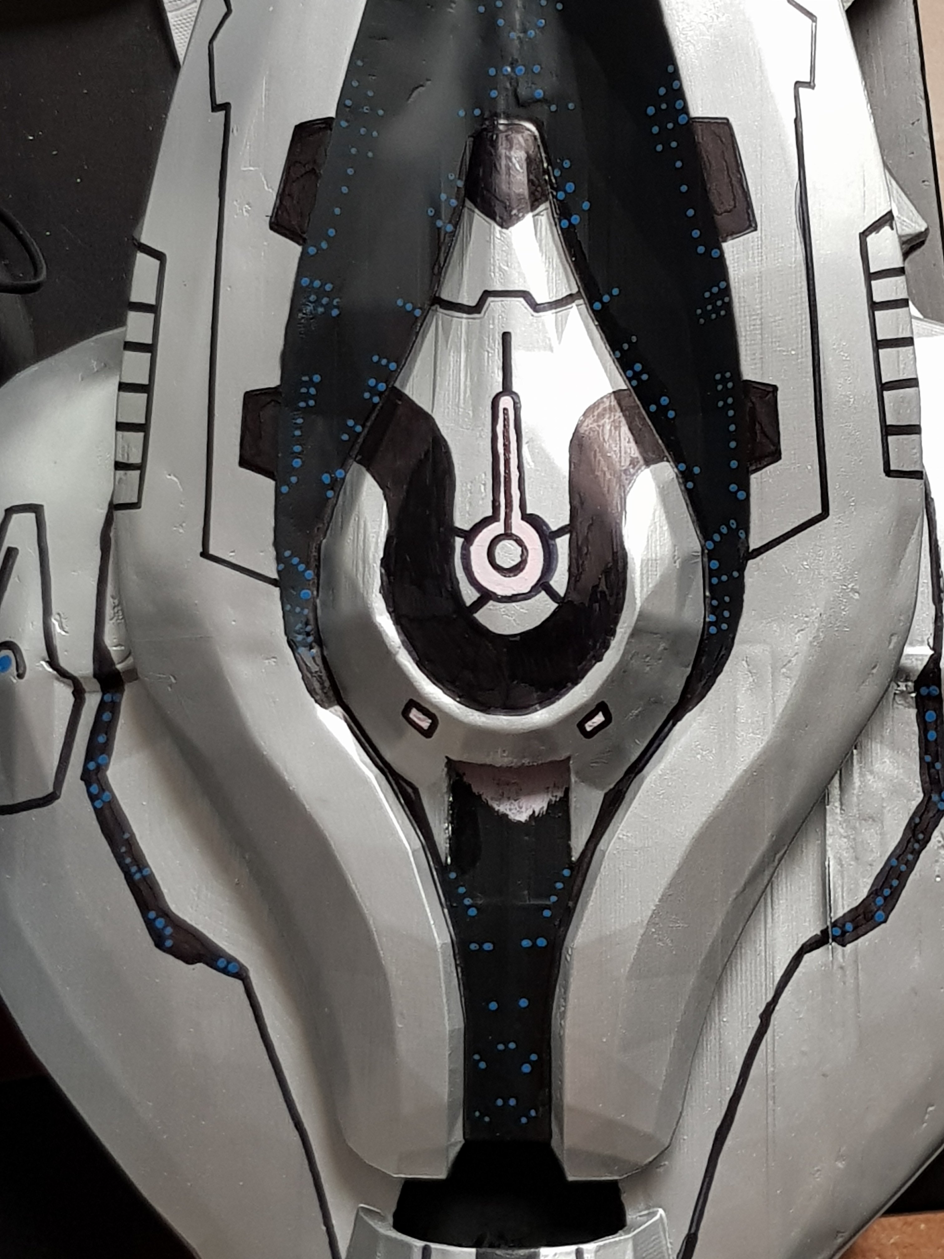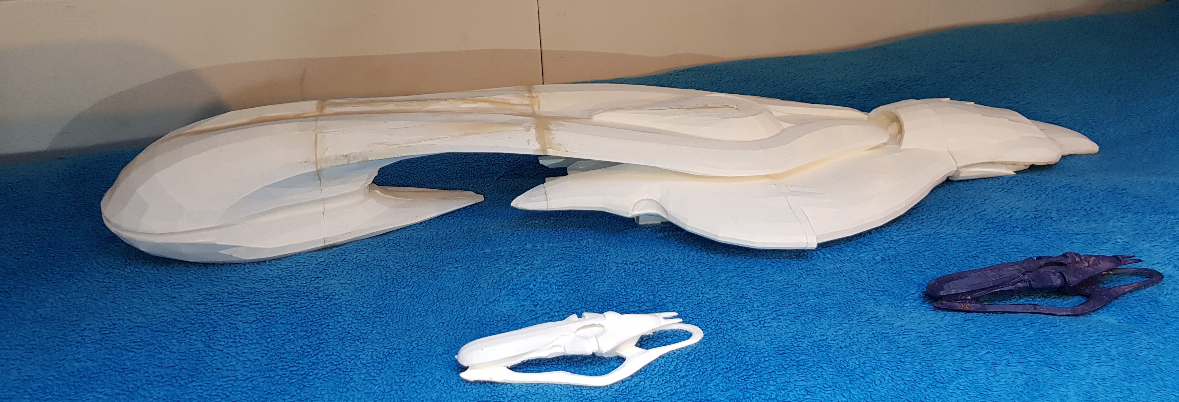 At the moment the ship is about 95% finished. The parts have all been assembled and seams have been filled up. The model has been sanded, painted with primer and painted in its livery according to a combination between the Halo 3, and Halo fleet battles version.
