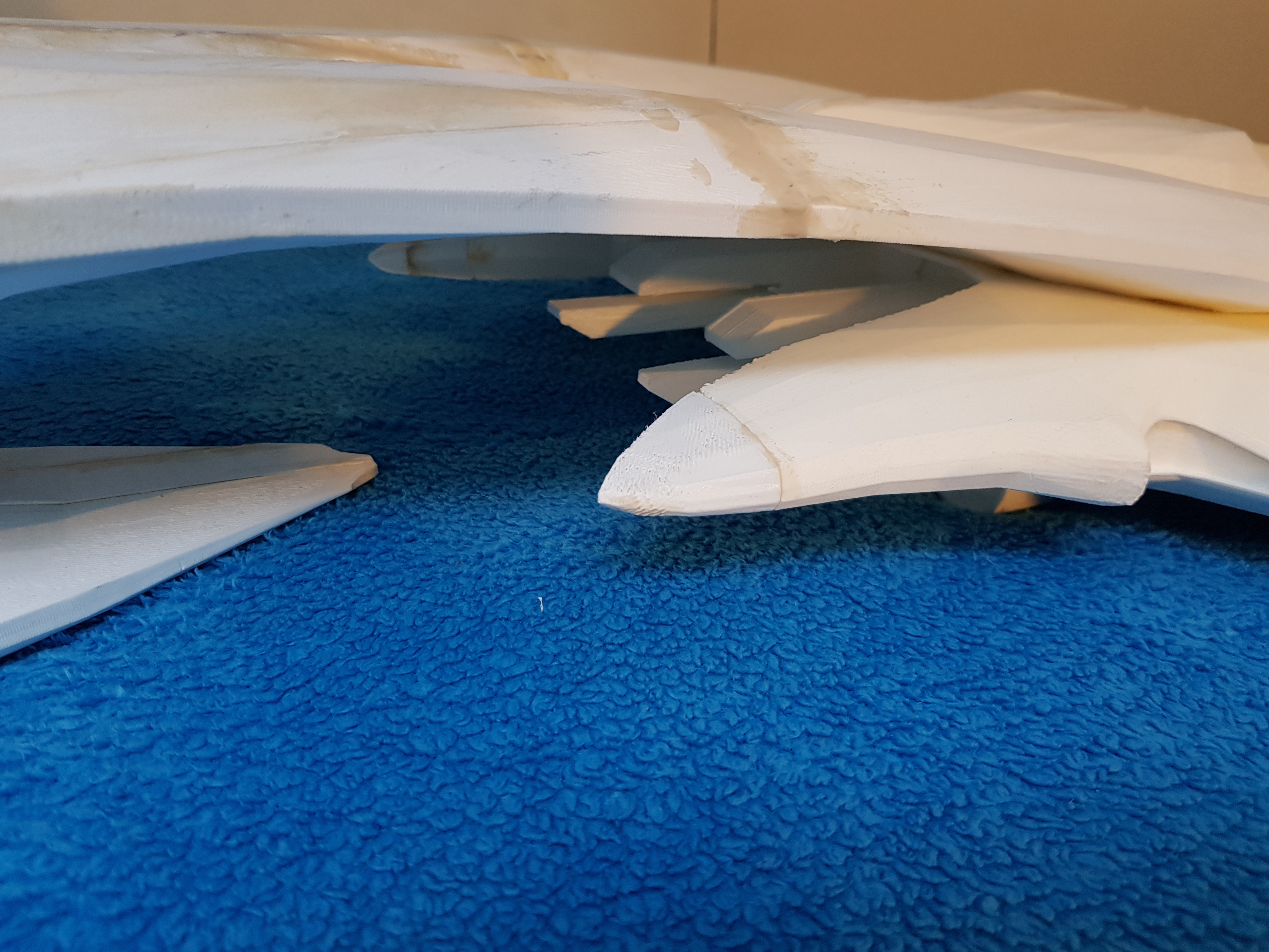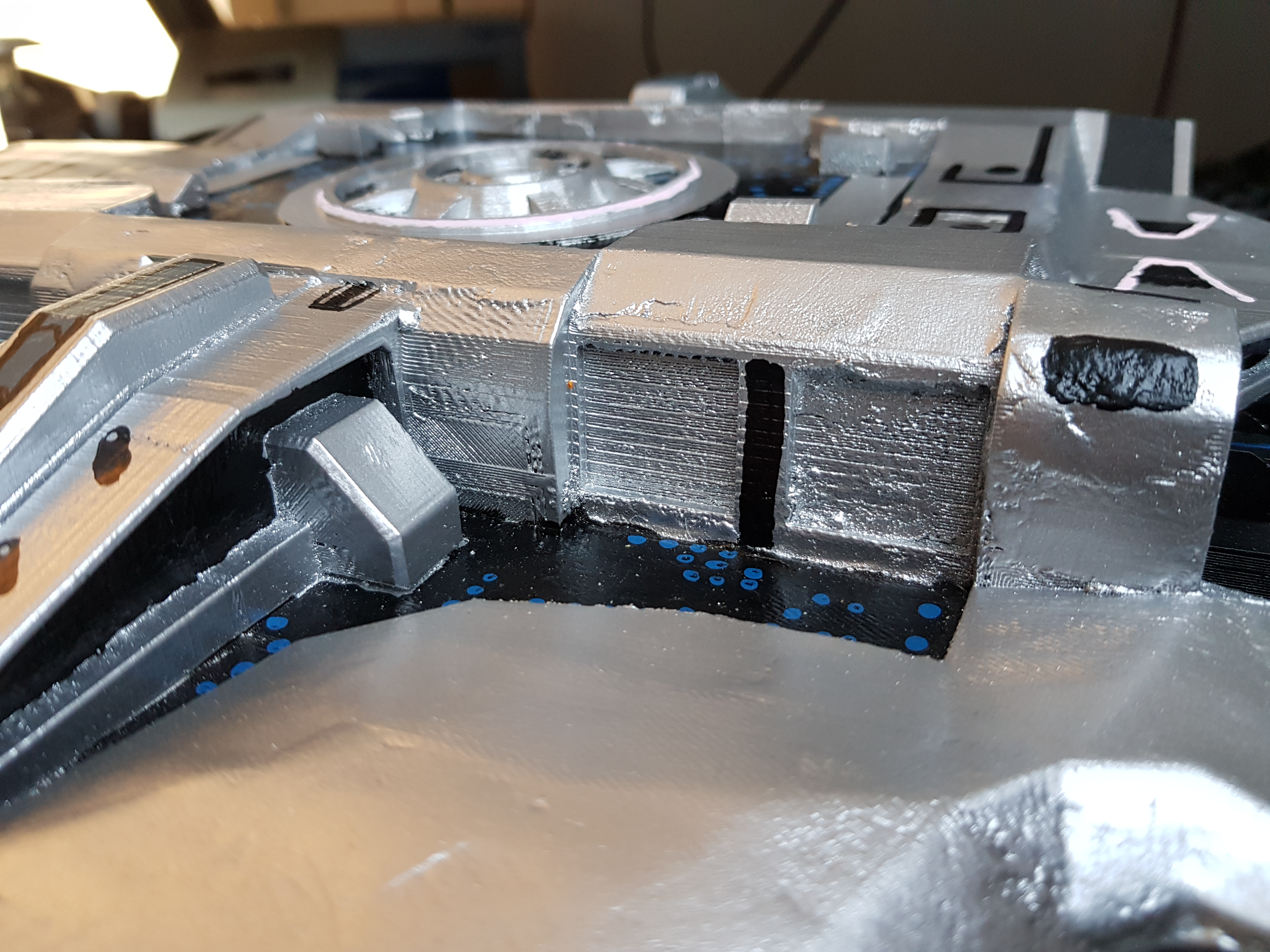 I had started to develop an electrical system which would light up certain parts of the CAS 3.0. However due to under extrusion in the model this led to massive problems with light distribution. Due to the under extrusion I had to fill this up with filler which led to darker spots on the supposed to be lighted parts(Some photo`s will illustrate the problem). Because this is a problem that occurs inside the entire ship I have decided to scrap lighting plans for now but leave enough space for when I change my mind. Although this looks like a step back it offers me more time to do more surface detailing.