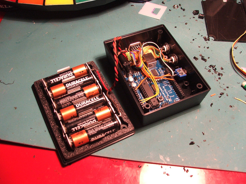 Control box finished. Arduino as well as the power supply lives in here. 6 AA batteries should give it 2-4 hours of life, depending on which LED effect patterns are used. The two potentiometers on the side control pattern and speed of the visor LEDs, while the switch turns the whole thing on and off. A DB9 connector supplies the helmet with 5V power for the ICs, 9V for the LEDs, and signal.