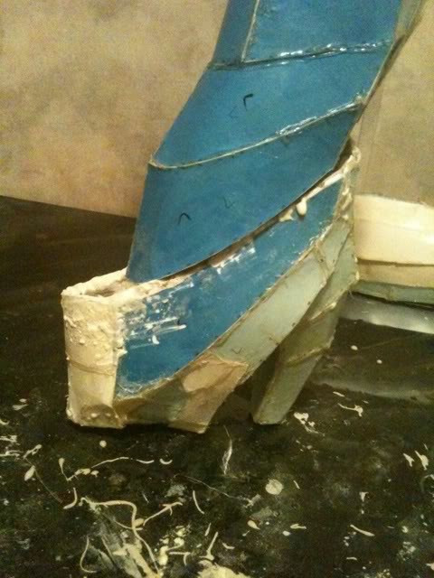 Mostly had problems with the right 'foot', the shoe didn't go in as easily as in the left one so I had to cut and foam more of it than I wanted. As of right now they're not pretty or anything, but they fit my feet and I don't think I'll die from walking in them for several hours. I'm thinking I can connect the lower leg piece to the 'foot' giving me less to have to fuss with as far as putting the whole thing on. I can slide my leg through it so that's not the issue, you can see from the picture that I have to widen add a bit to it to connect the pieces (because I wasn't paying attention and thought of this after I'd fiberglassed the pieces).