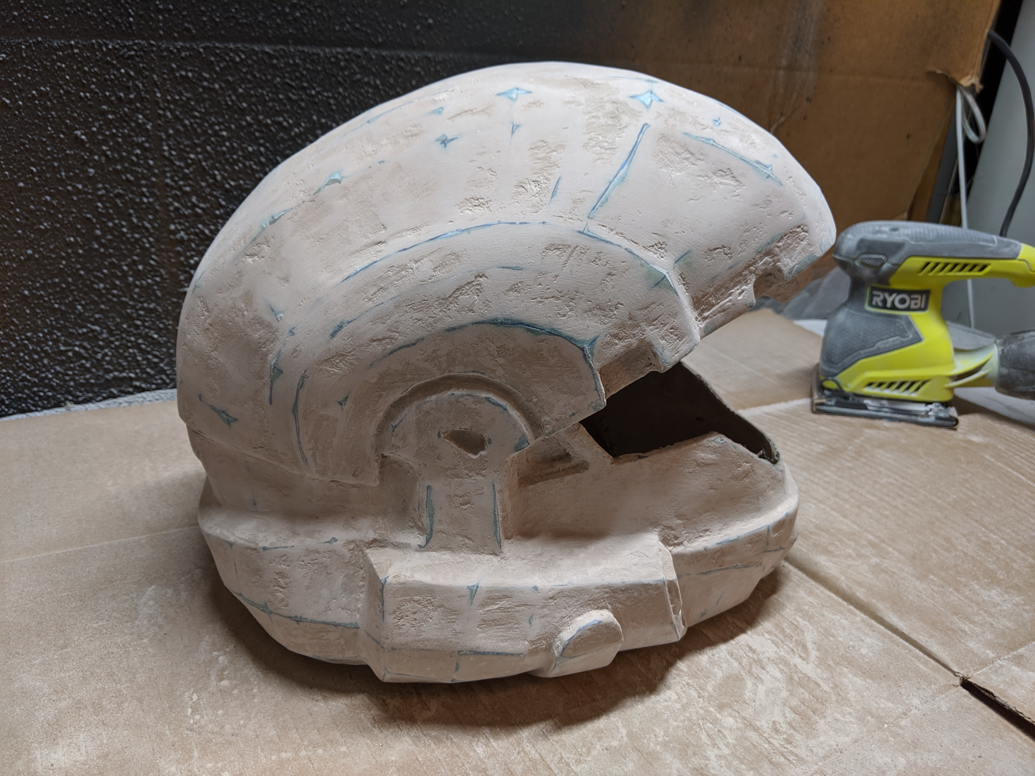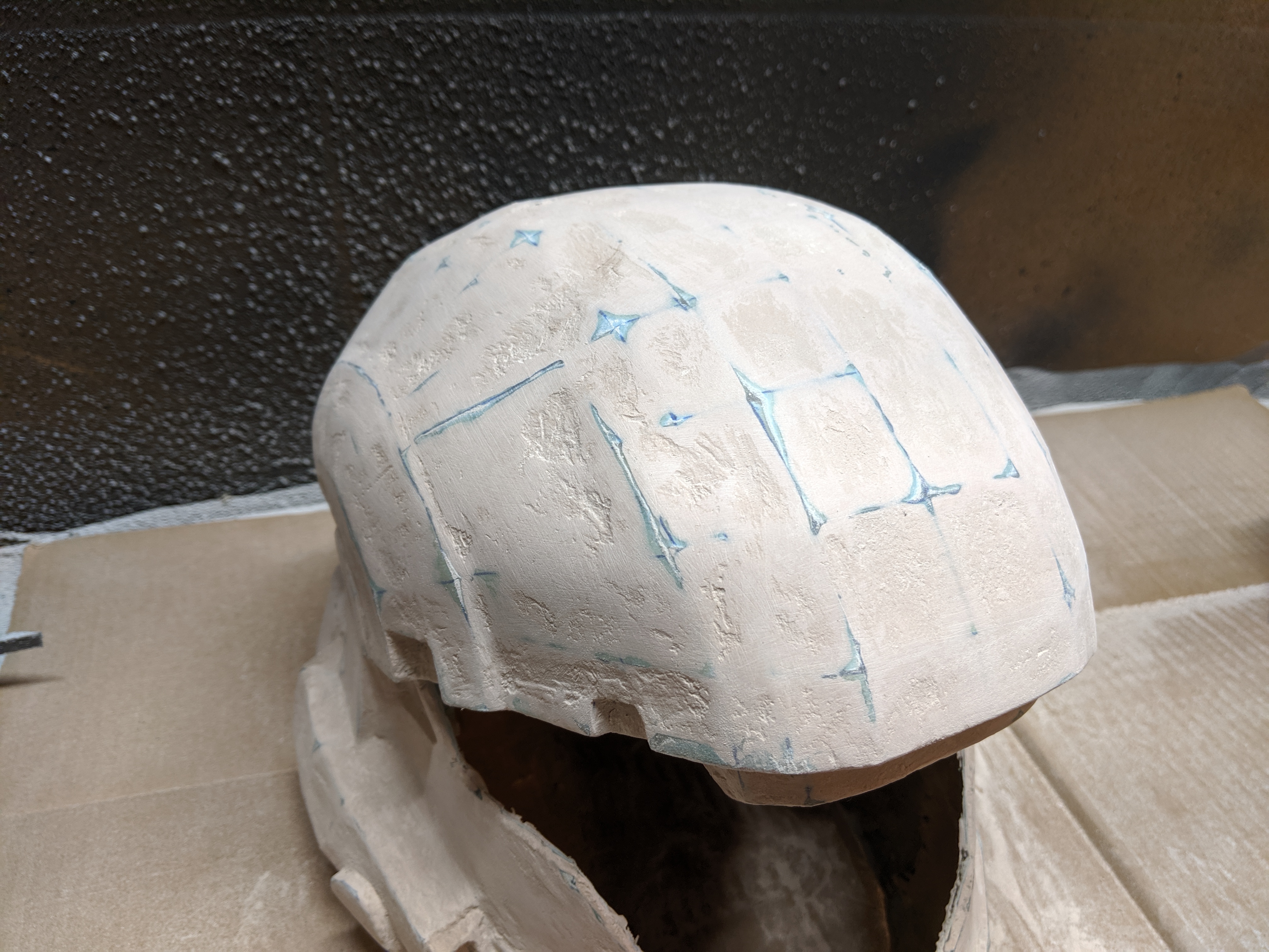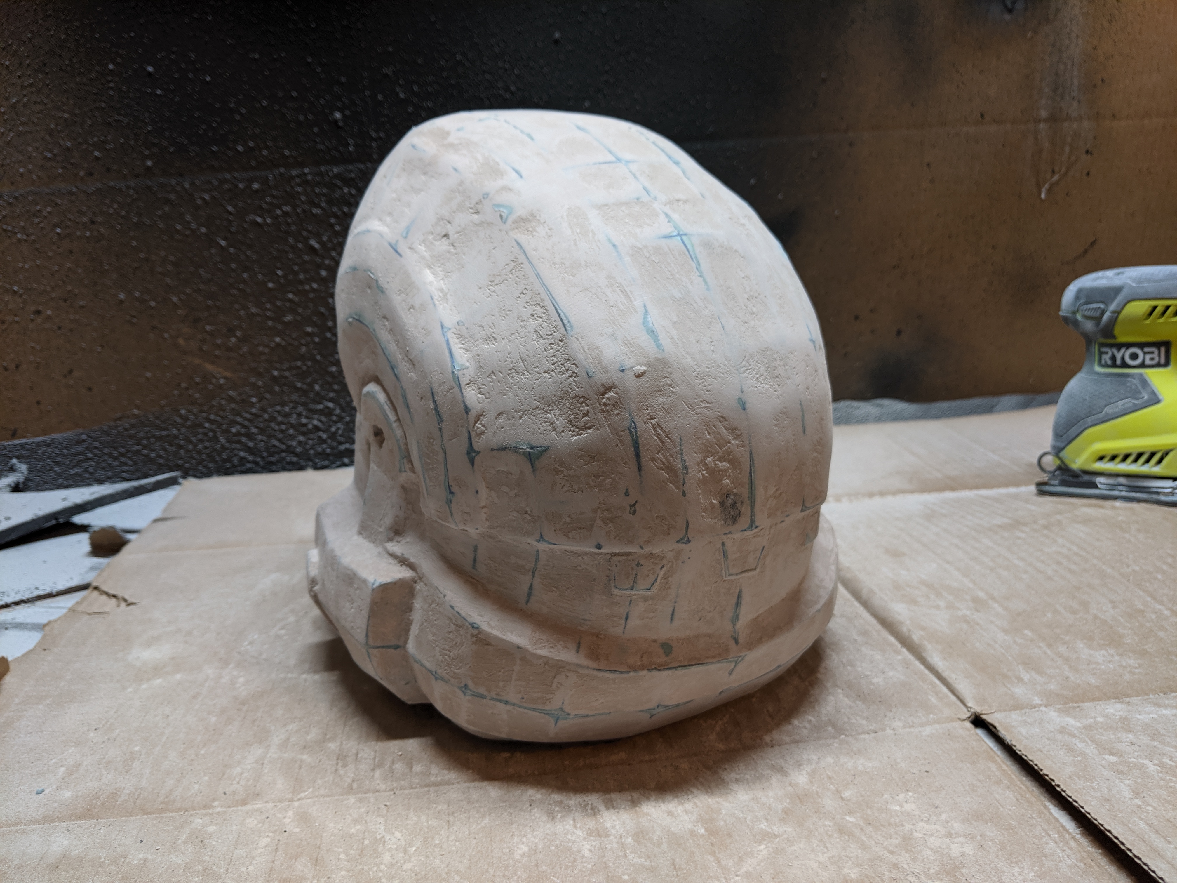 Just because that is how it works, you may end up needing more than one coat. I reccomend while the bondo is still curing, sculpt it as much as you can to get the shape you want, but still keep the layers thin so you dont have to do extra sanding. Try and just fill inside the pepakura lines on the top and keep the edges as they are. This will smooth it out the bestSo apparently I went too light on my first Bondo layer which is fine, I'll have to give it another layer of Bondo to fill the negatives and sand again