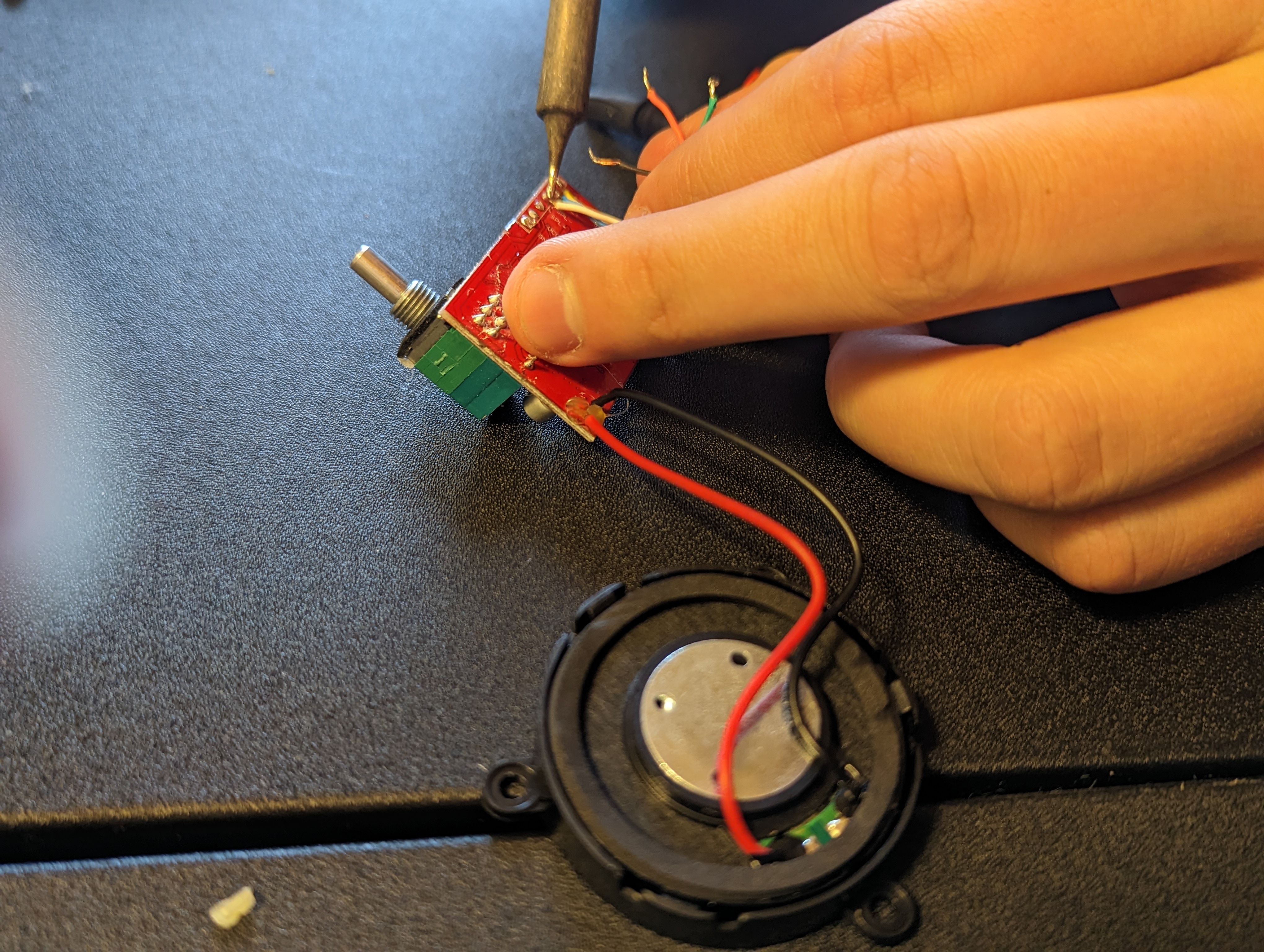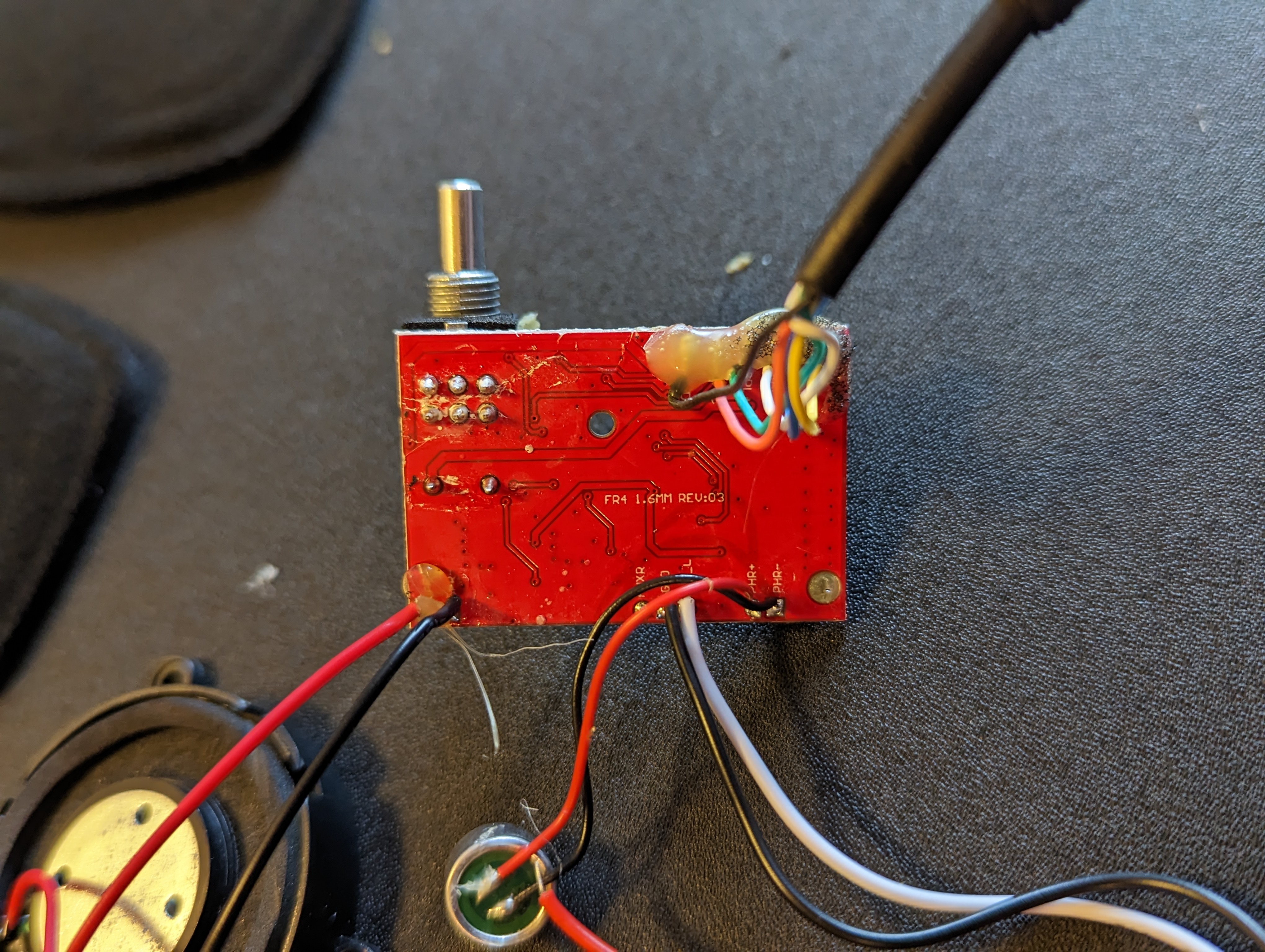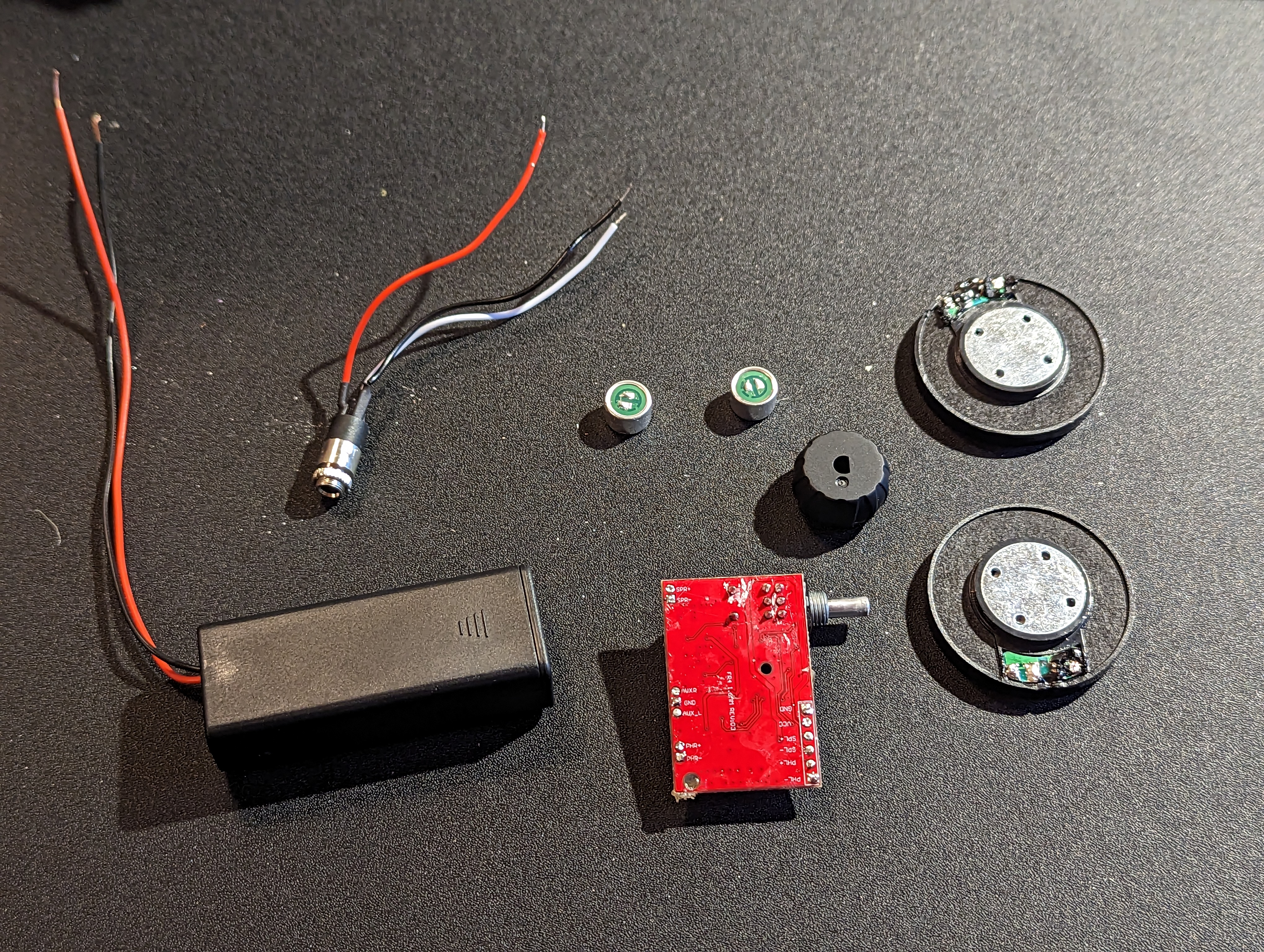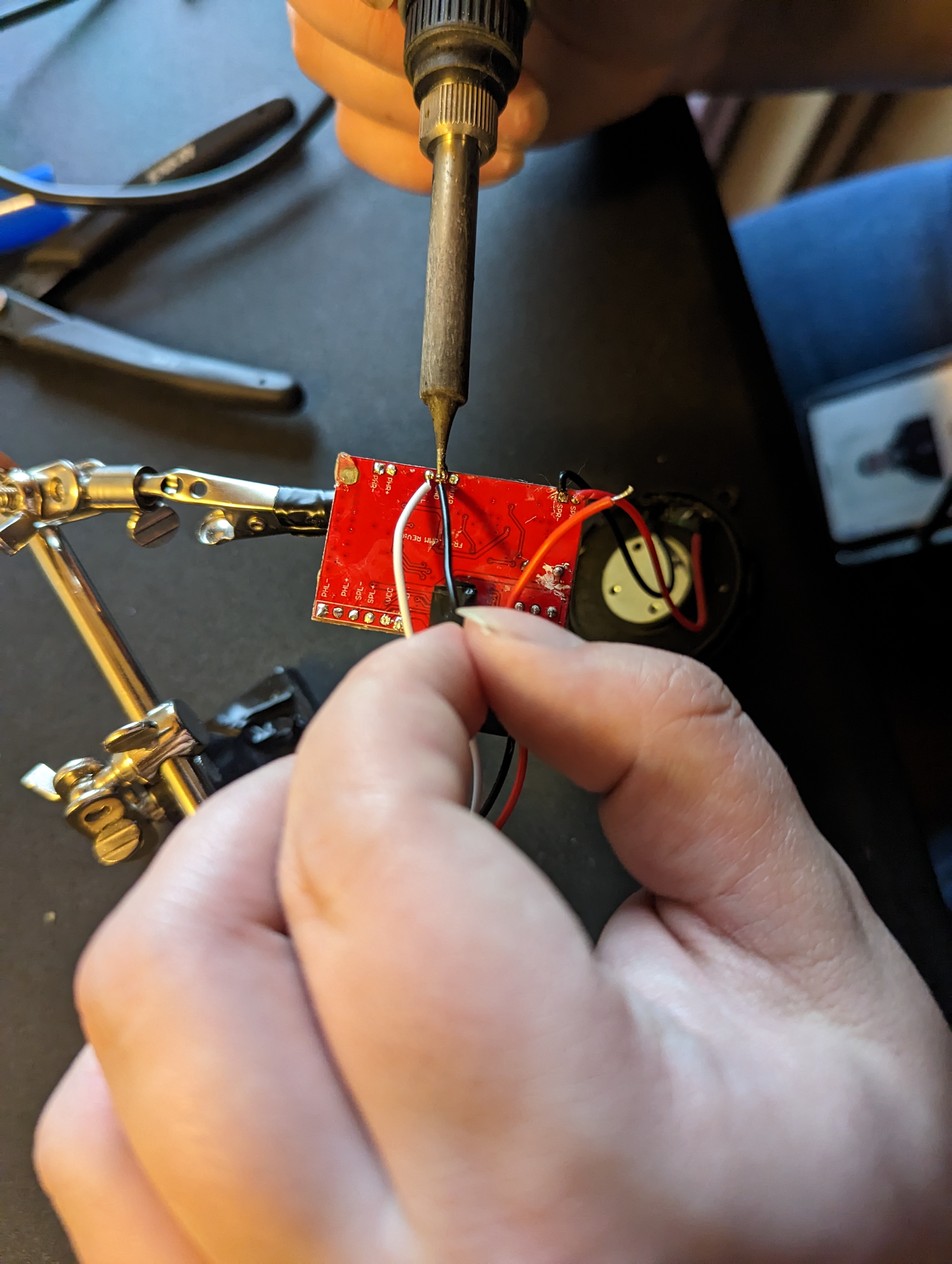 You should now have the following components: PCB, battery holder, 3.5mm jack, 2 microphones, and two speakers. Using a soldering iron and solder sucker (and soldering wick or whatever desoldering tools you prefer, clear out the holes in the PCB where the wiring was attached. This will allow you to pass the wire through before soldering, giving you a sturdier connection than the factory wiring.