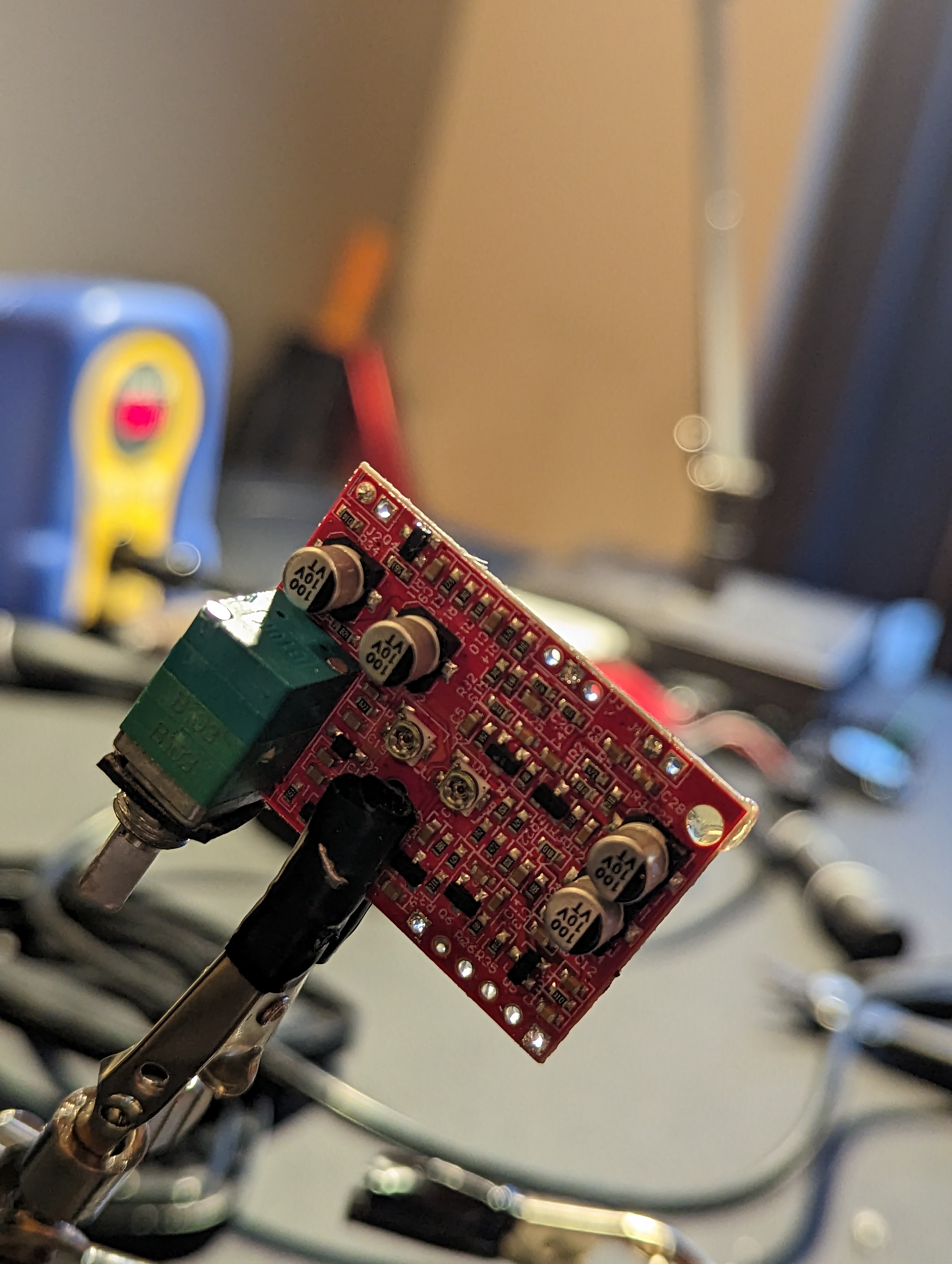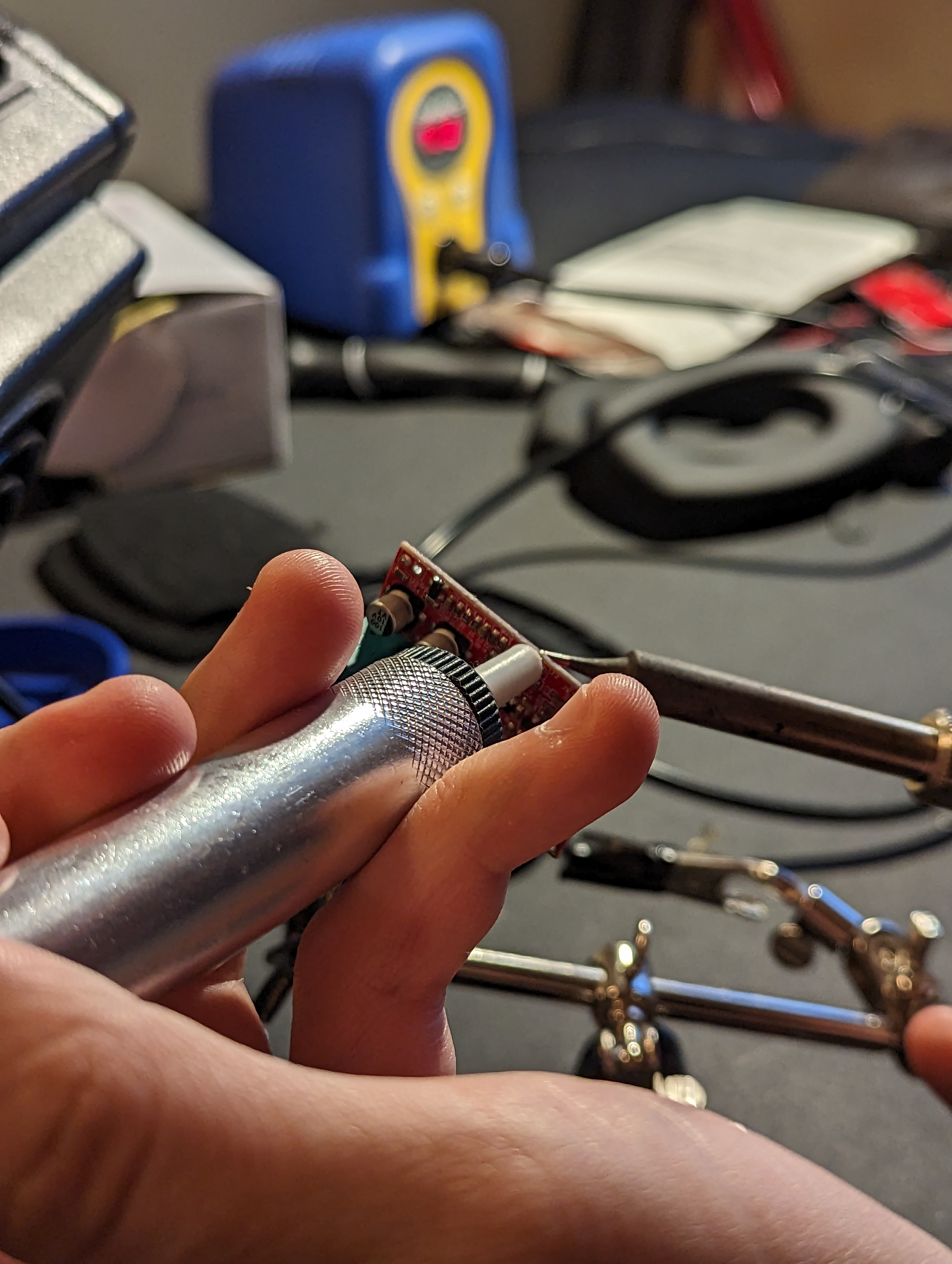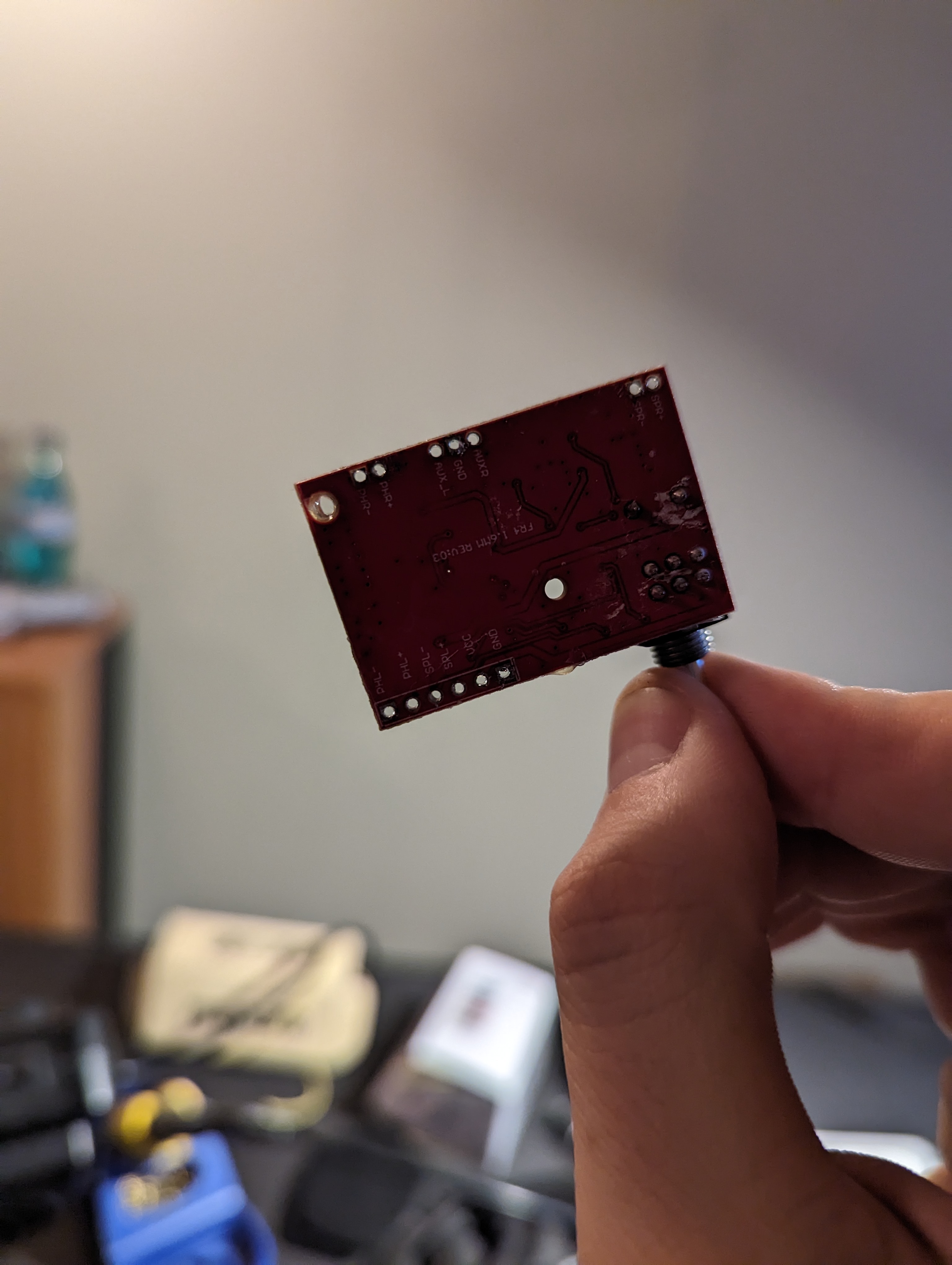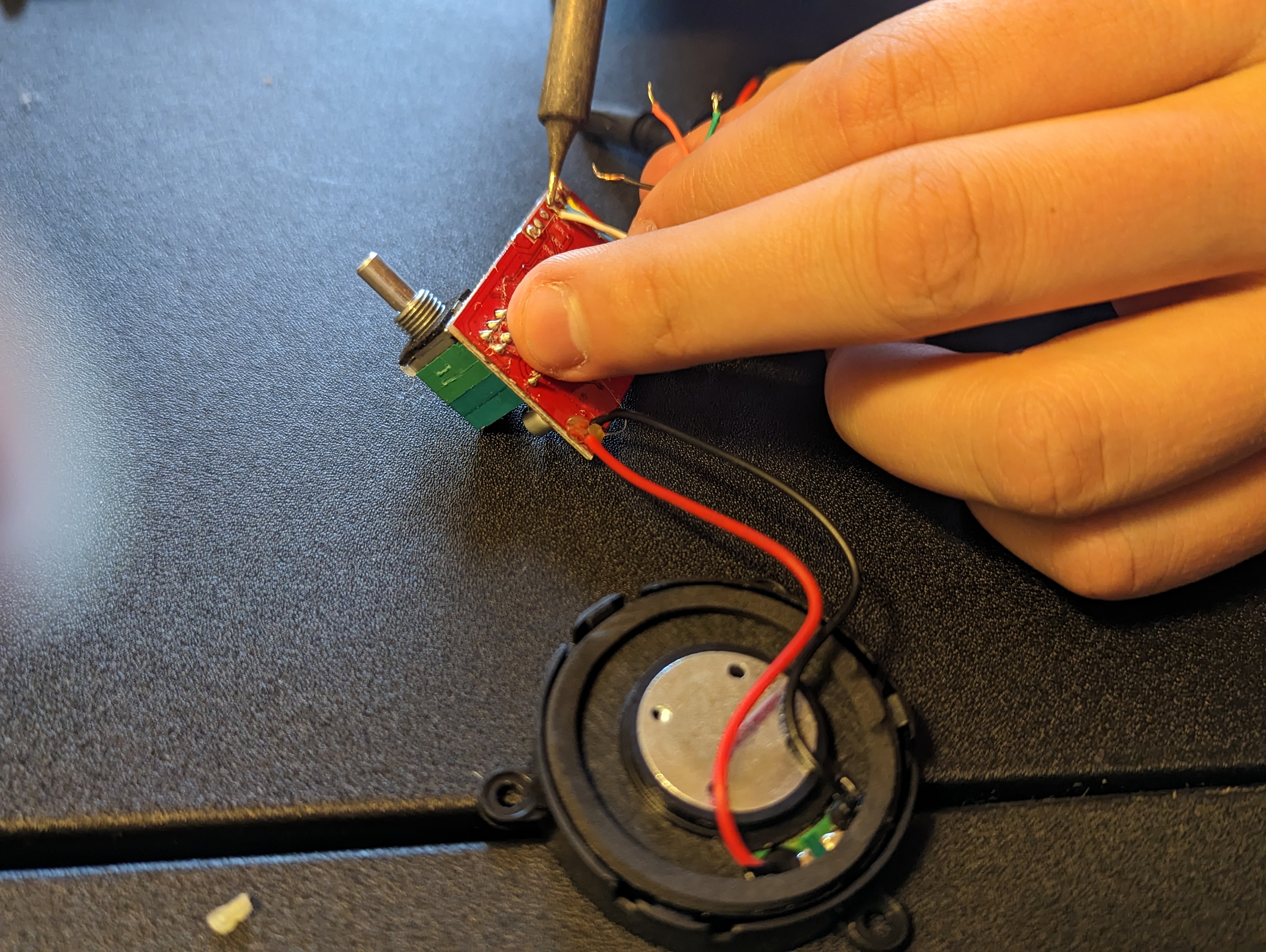 You should now have the following components: PCB, battery holder, 3.5mm jack, 2 microphones, and two speakers. Using a soldering iron and solder sucker (and soldering wick or whatever desoldering tools you prefer, clear out the holes in the PCB where the wiring was attached. This will allow you to pass the wire through before soldering, giving you a sturdier connection than the factory wiring.