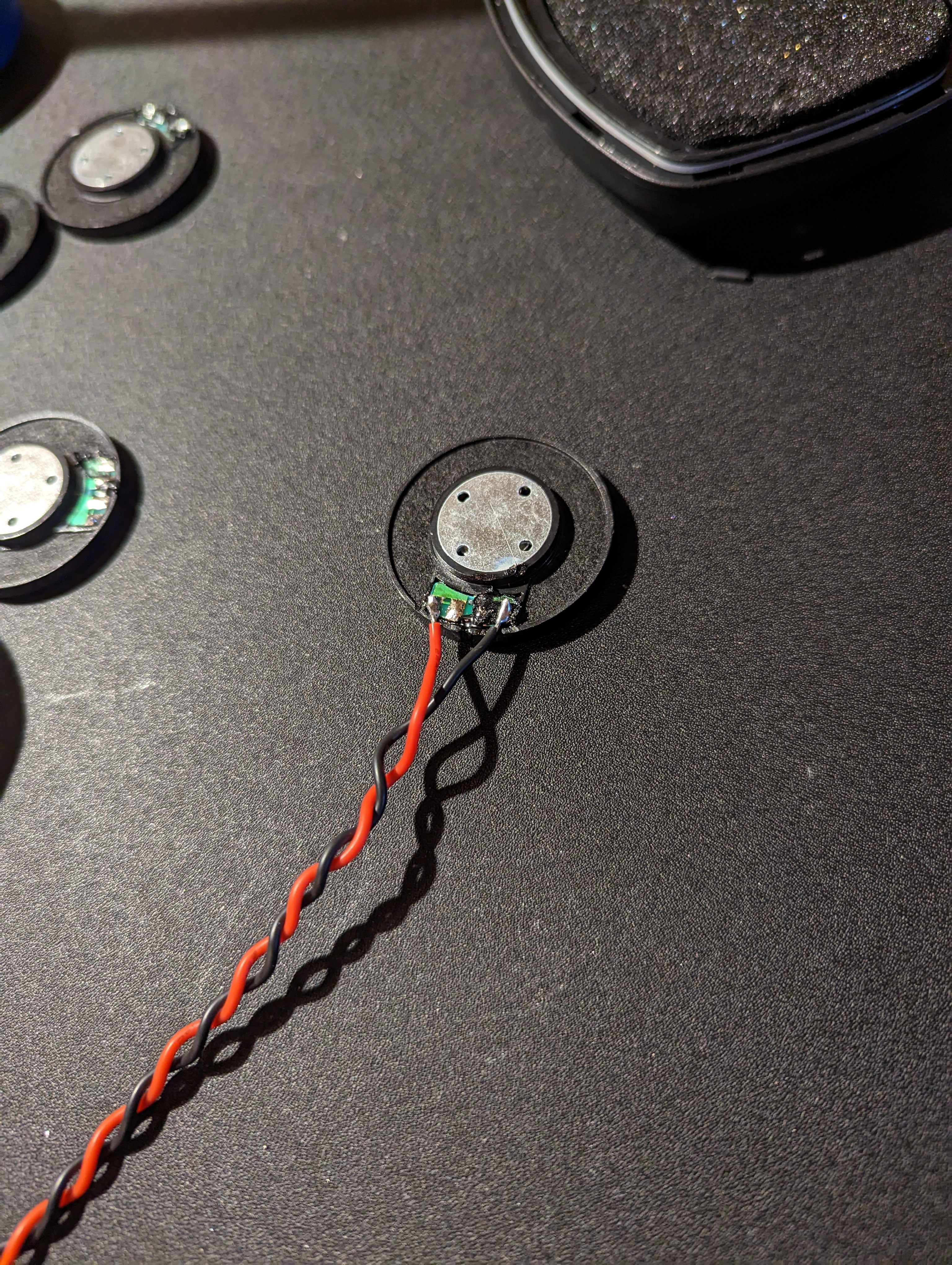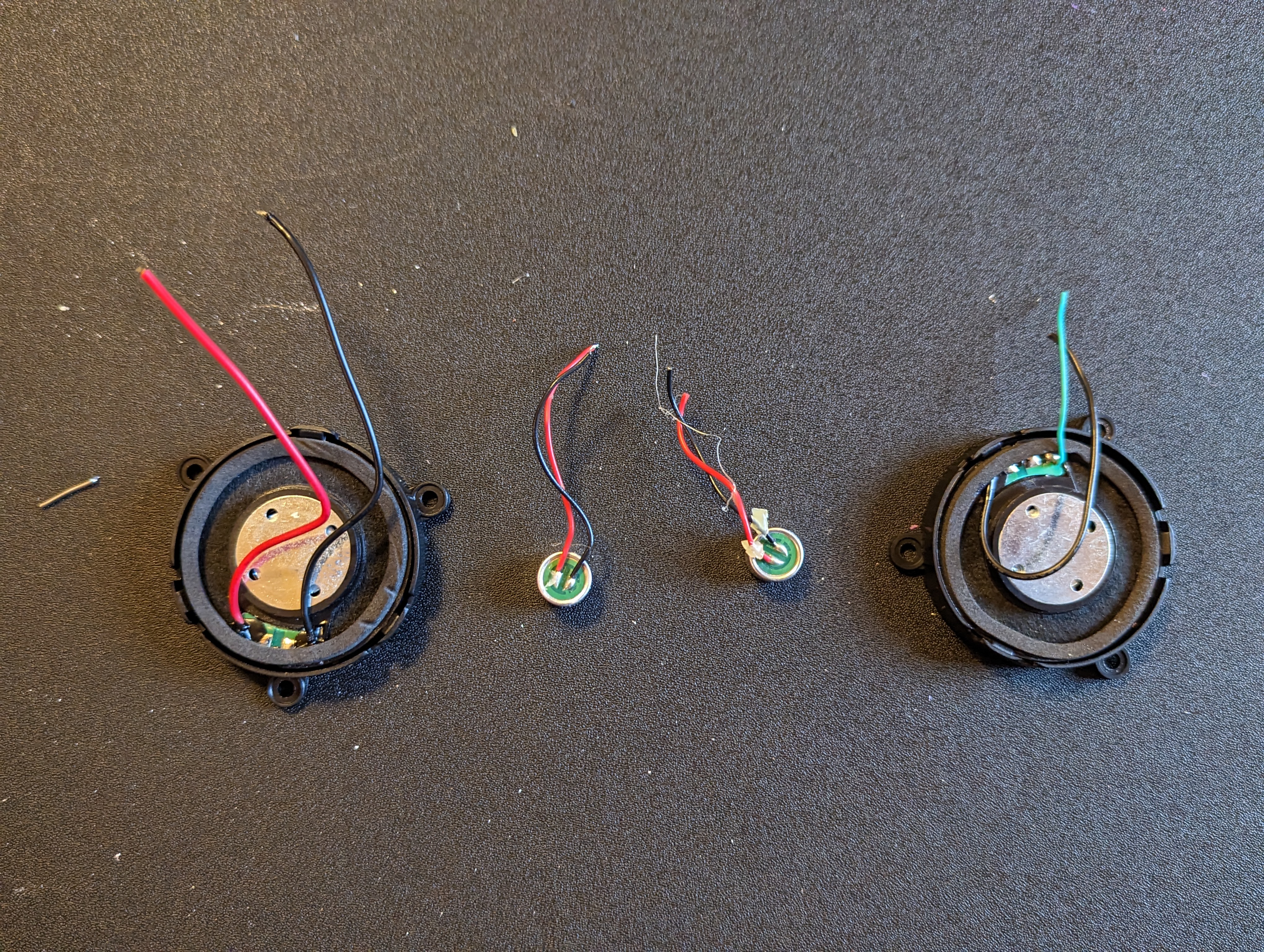 In the same manner as the microphones, cut one set of wire for each speaker. It doesn’t matter which pads you use for positive and negative, so long as you are consistent from speaker to speaker. Otherwise, they will be out of phase (it’ll sound weird, trust me).