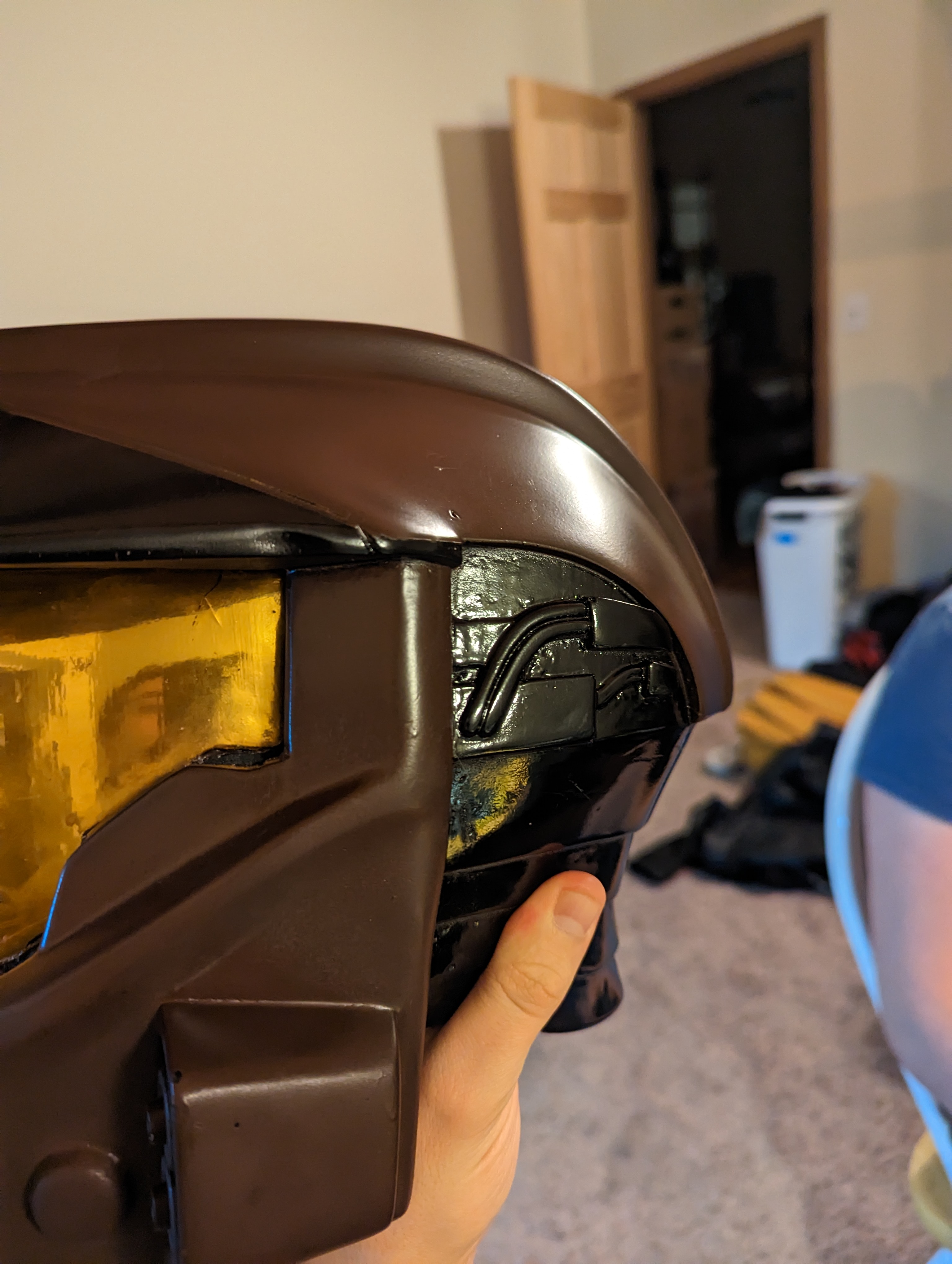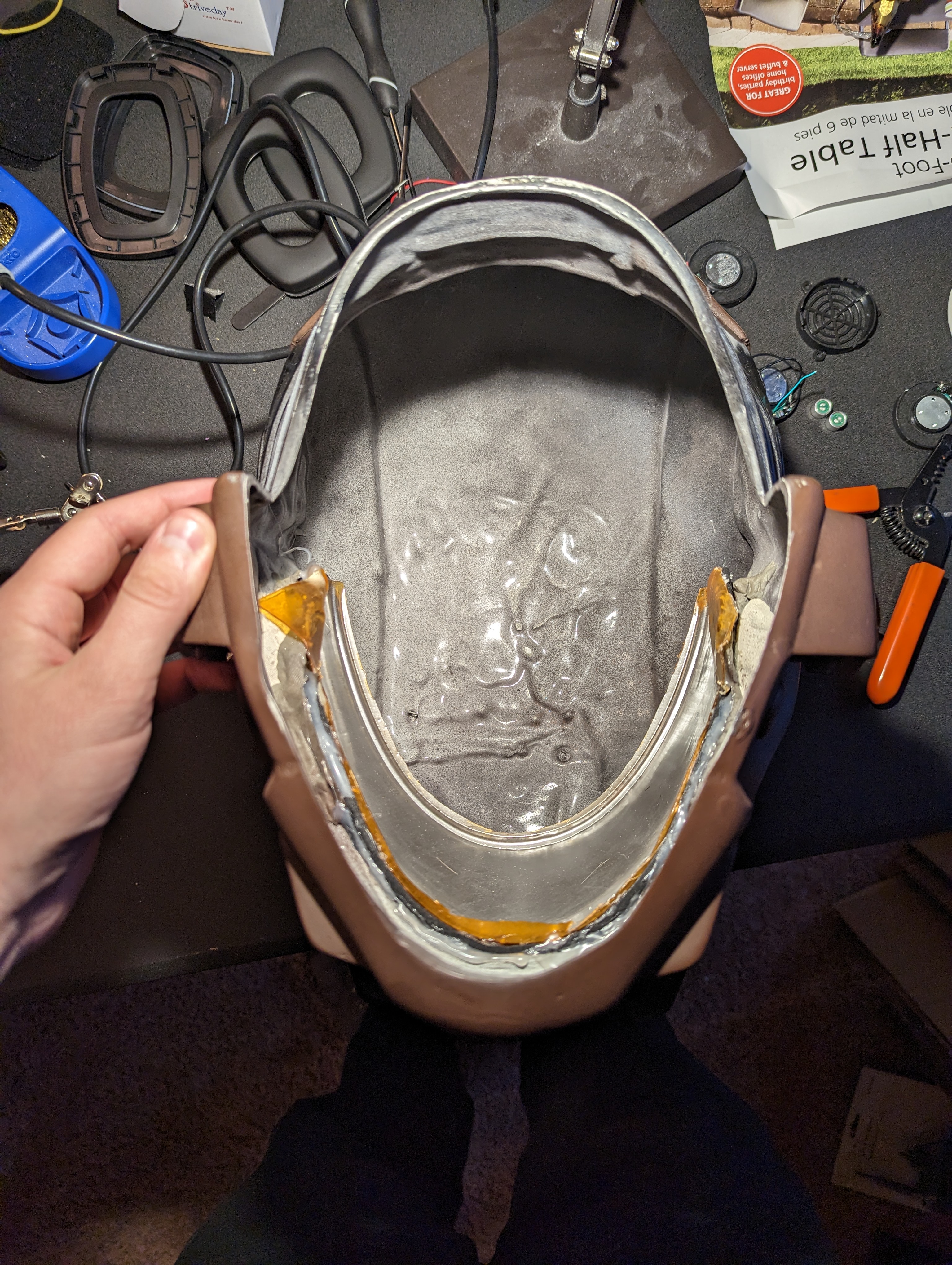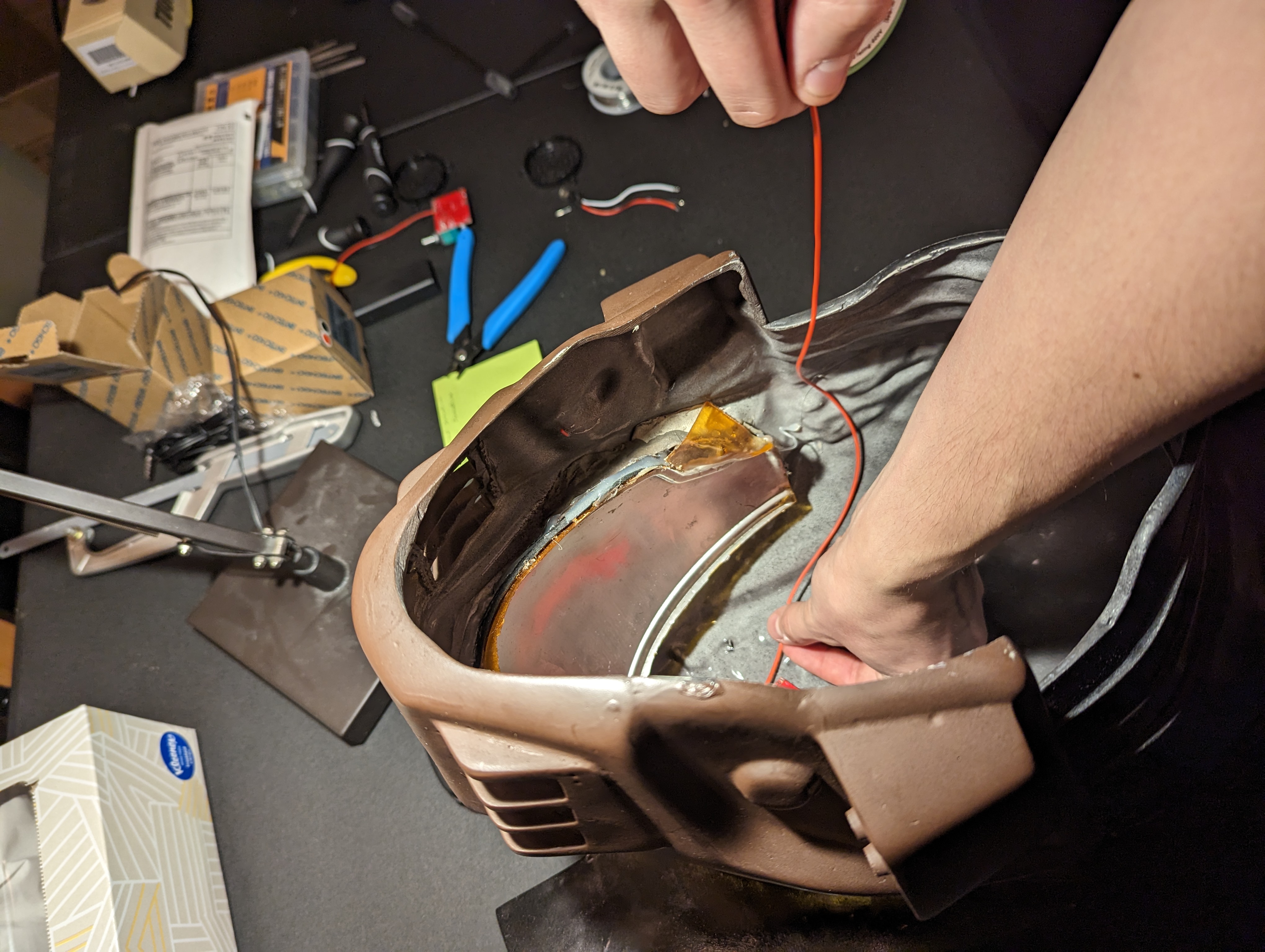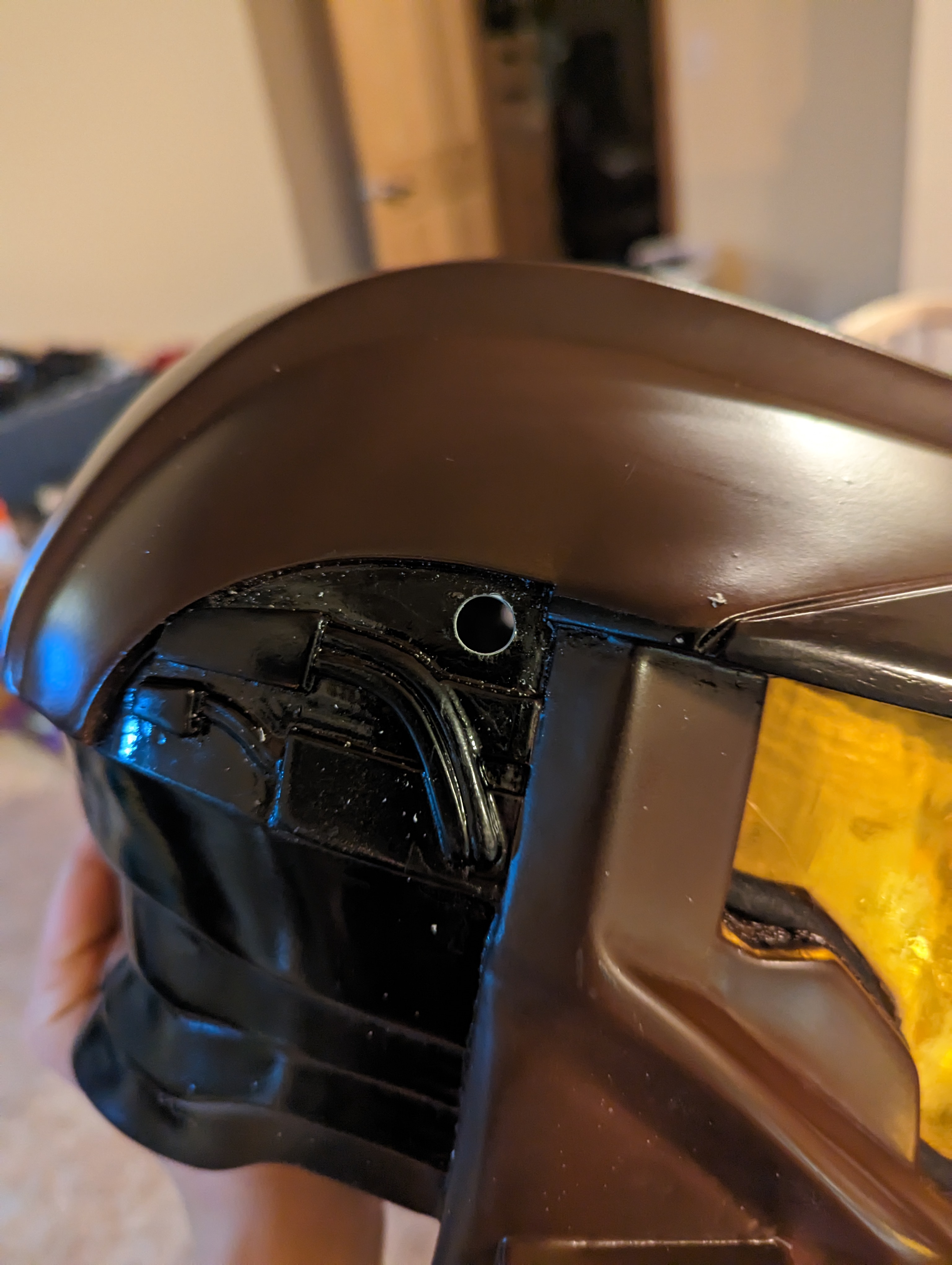 Now that we have the PCB cleaned up we’re going to estimate the length of our wiring. The first thing we’re going to do is decide on a location for our microphones. You want one on either side of the helmet in a location where it won’t be too obvious. On my MK VII (produced by EVAKura if you are looking to source the same helmet), I chose a spot right behind the visor where the helmet was going to be painted black. Take into consideration that you will need to access this location from inside the helmet to insert the microphone. Carefully drill a hole matching the diameter of the microphone.