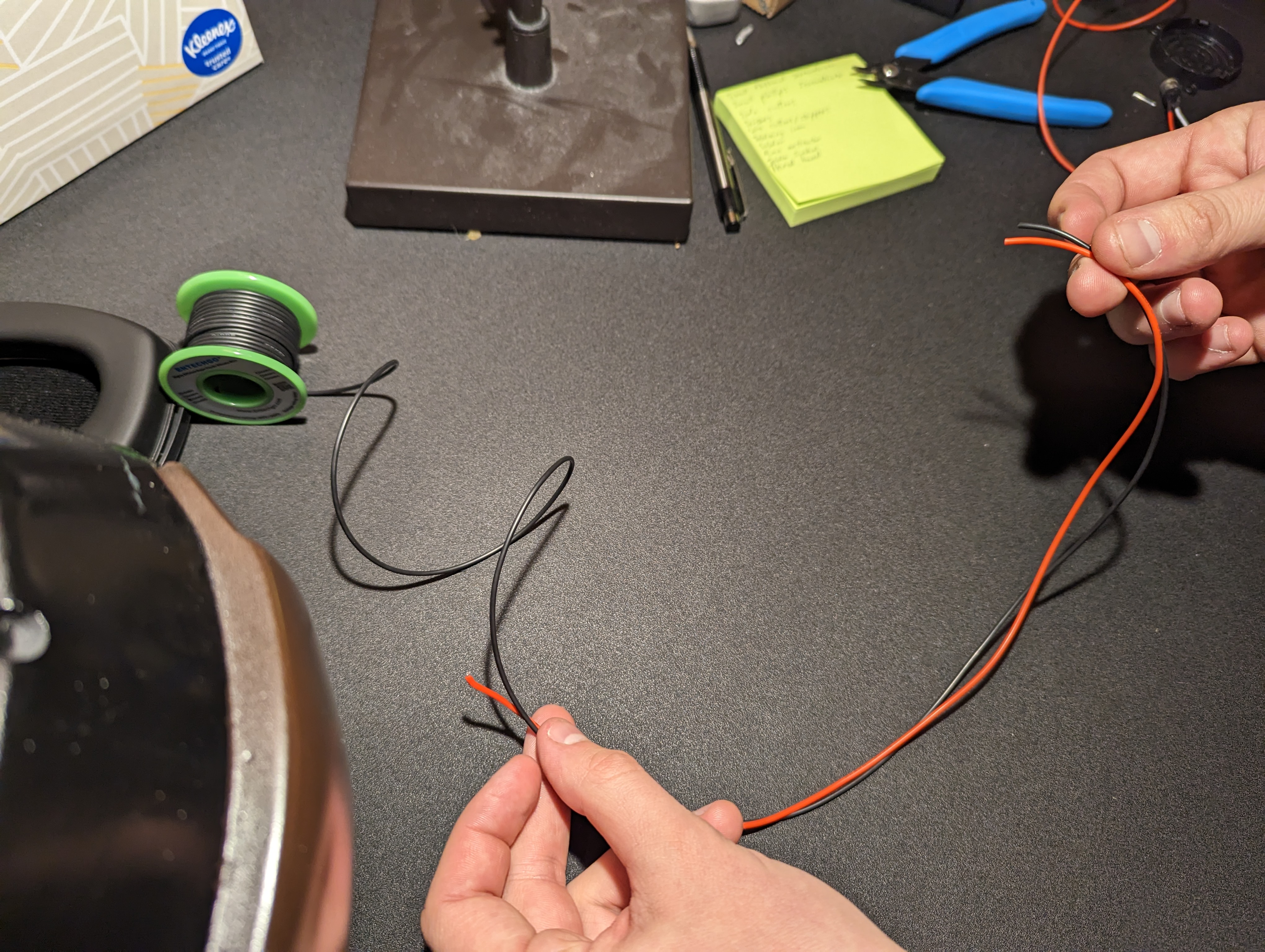 Next, decide where you would like to mount the PCB. From this location, unroll some wire and run it to one of your mic locations, leaving a little extra, and cut. Measure some wire of a different color to the same length and cut. We used red for positive and black for negative, but the idea here is to differentiate positive and negative, so any two colors will do. For a clean look, chuck these wires into a drill and twist them together. If you do so, leave some additional length as the wires will shorten as they twist together.