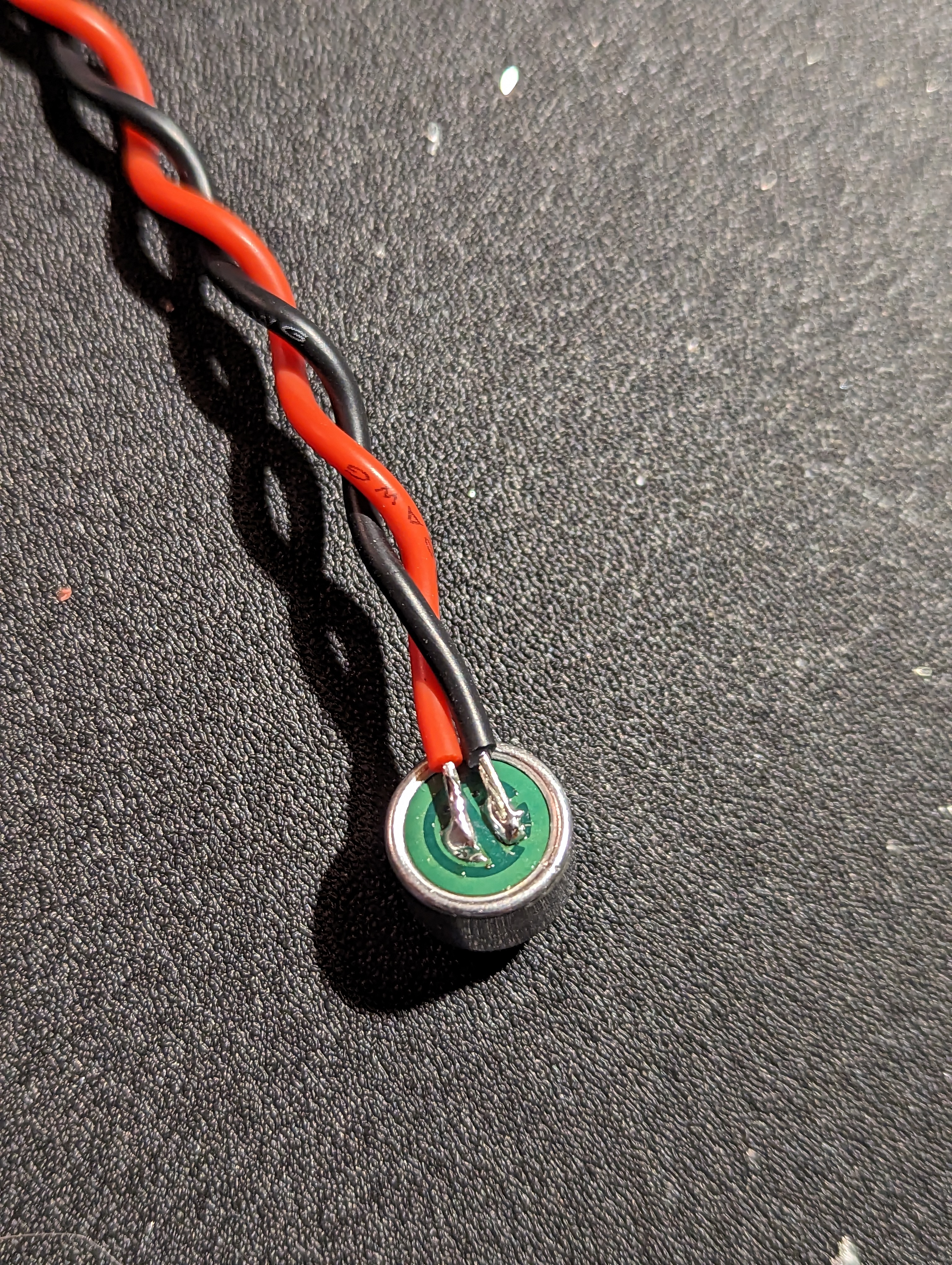 On the back of one electret microphone, solder your negative wire to the pad with traces running to the outer ring and your positive wire to the semicircular pad beside it.