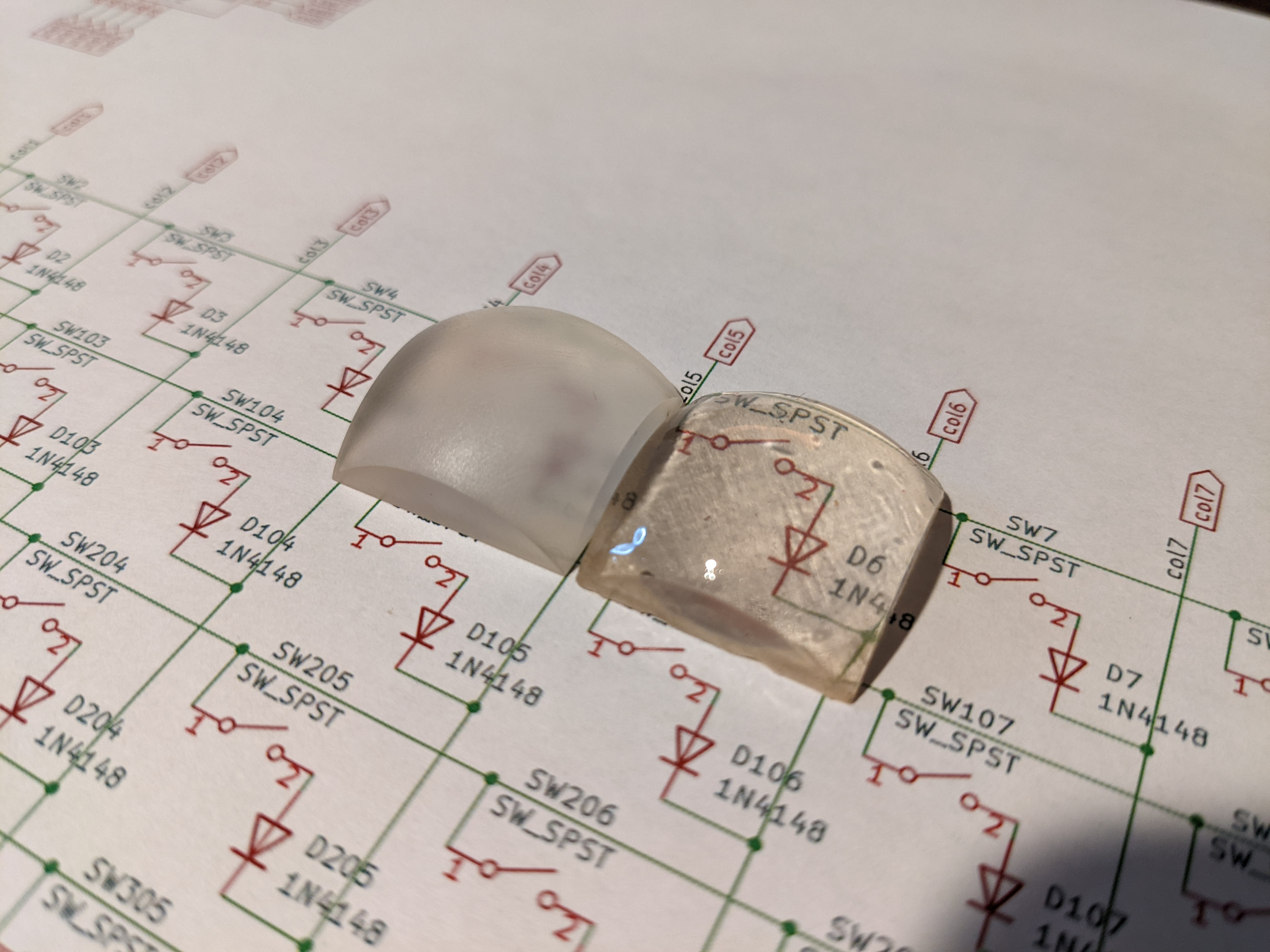 This was 3d printed with clear resin. However, the print has a frosted appearance. This is remedied by coating the lens with a final layer of resin. The raw print is on the left, with the coated lens on the right.