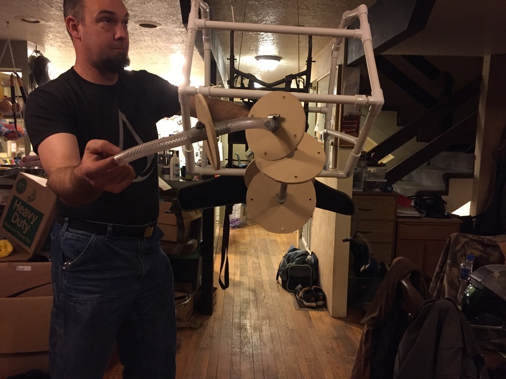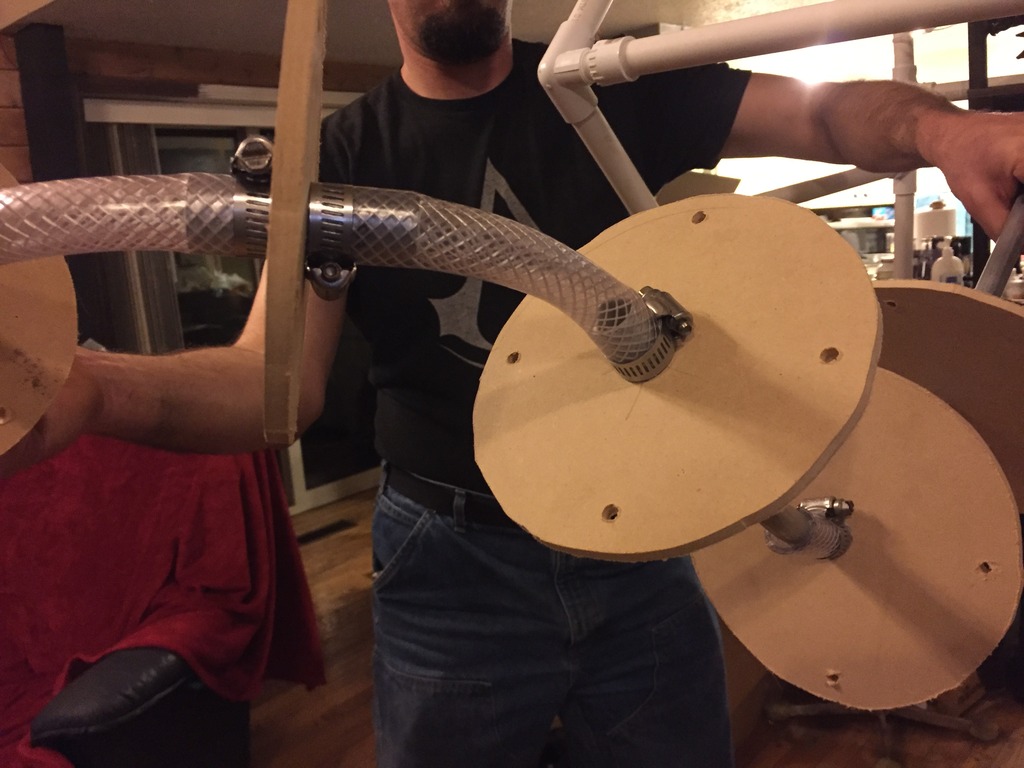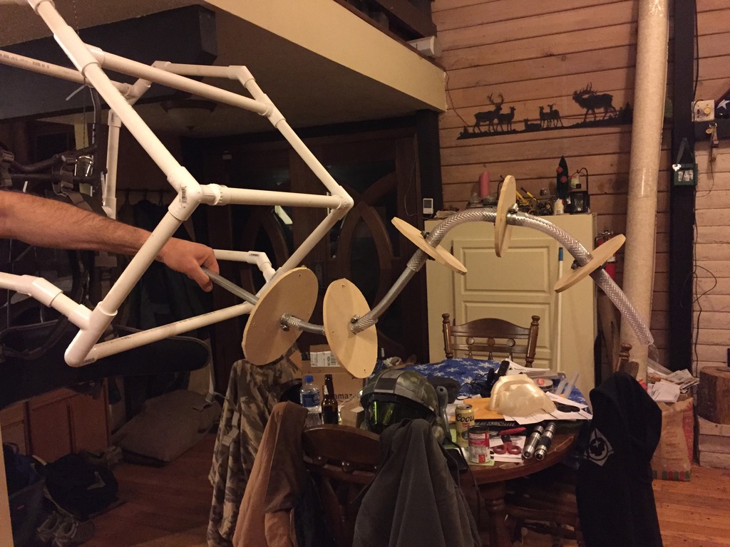 We made the neck skeleton out of electrical conduit, MDF board, rubber hosing, and some hose clamps.