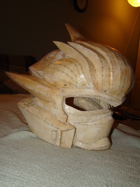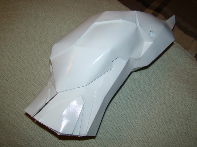 Got the shins painted with their final paint job, still need to paint the black detail stuff and weather them but I'll do that later also need to make the velcro strap things to hold the hinged back parts of the shins shut. Also been working on the helmet, did lots of sanding and bondo work, so far I have 8 hours in sanding and bondo work and still have probably 2 or 3 more hours left of sanding, it all looks smooth and I probably could get away with the way it looks now but I think the Hayabusa helmet is the main focal point on the whole set of armor, so everybody will notice it first so Im going to try and get it close to perfect as I can, so if any of you out there love to sand and get around all the nooks and crannies that the busa helmet has, and forgot to mention the spikes when hardened have a tendency to stab you in the legs when your sanding, then build one of these bad boys It will take care of all your sanding addictions.