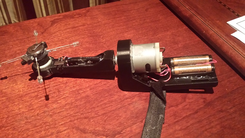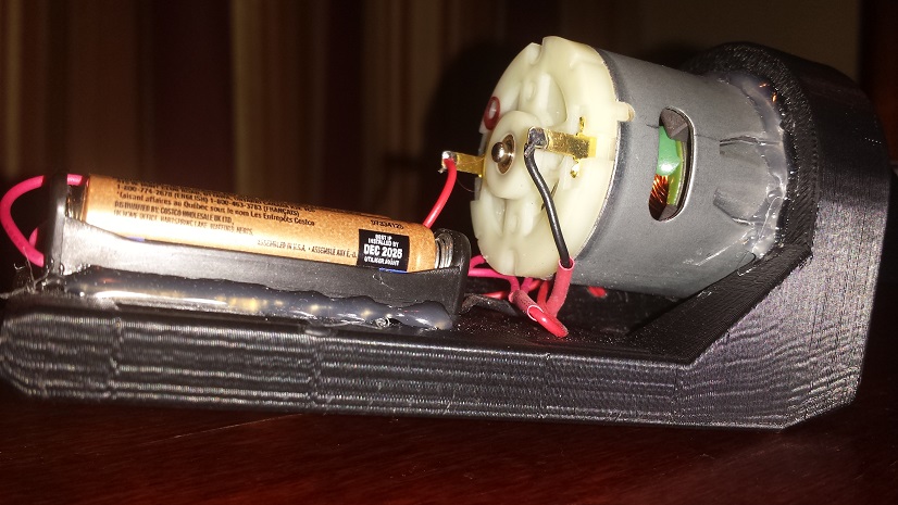 3D Design again. Print out. Start wiring. In the end, I wired the large motor to 2 AAA batteries wired in Parallel to let the motor run longer. It was already powerful enough to spin the small motor housing at 1.6 volts.
