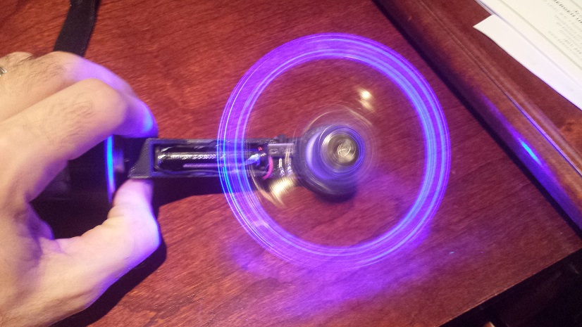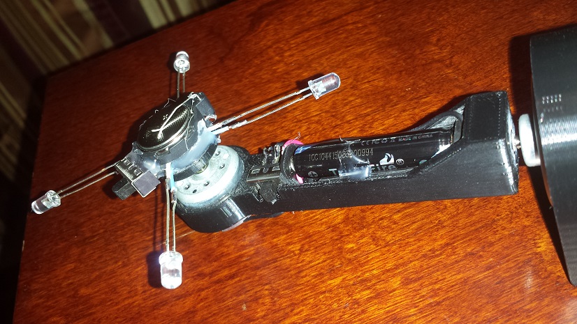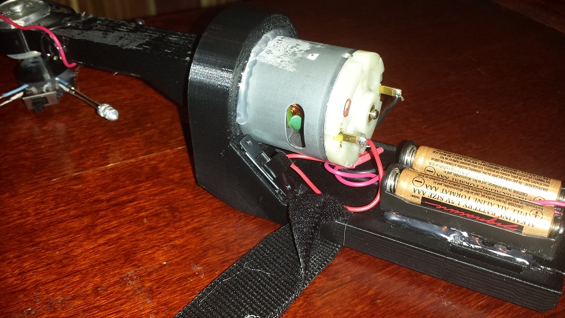 After determining that 1.6 volts was not enough to power the motor effectively during the 2nd axis spin, I modified the aaa battery holder to accommodate a trustfire 3.7 volt motor. Seems to handle nicely.