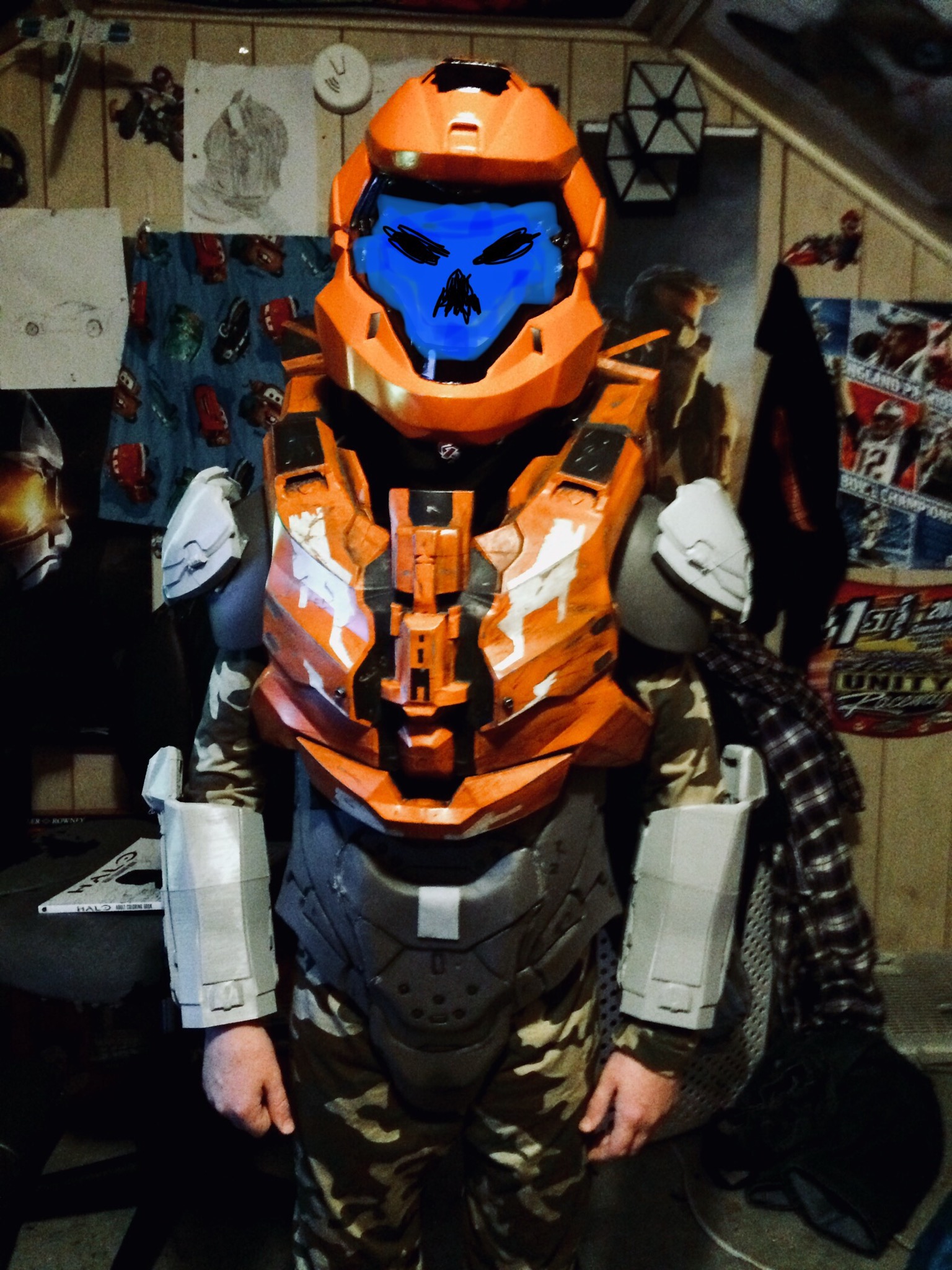 Ok so not really an update but just a notice I guess you could call it. Unfortunately this build is going to be put on hold for a short period of time as we’re looking into selling our house and it’s will require so fixing up to put it on the market. So that puts armor building on the back burner. But here’s some comical iterations of previous pics. Got playing with some photo editing on my phone and here’s what we came up with. As stated earlier the helmet looked a bit wonky when you were able to see his face where the visor would be. I haven’t been able to get into my vacuum forming yet so I got the next best thing. Then the scowl pose for mblackwell1002 What do you guys think? Haha