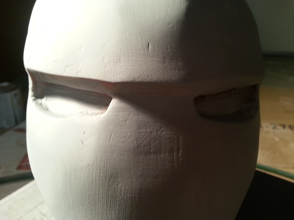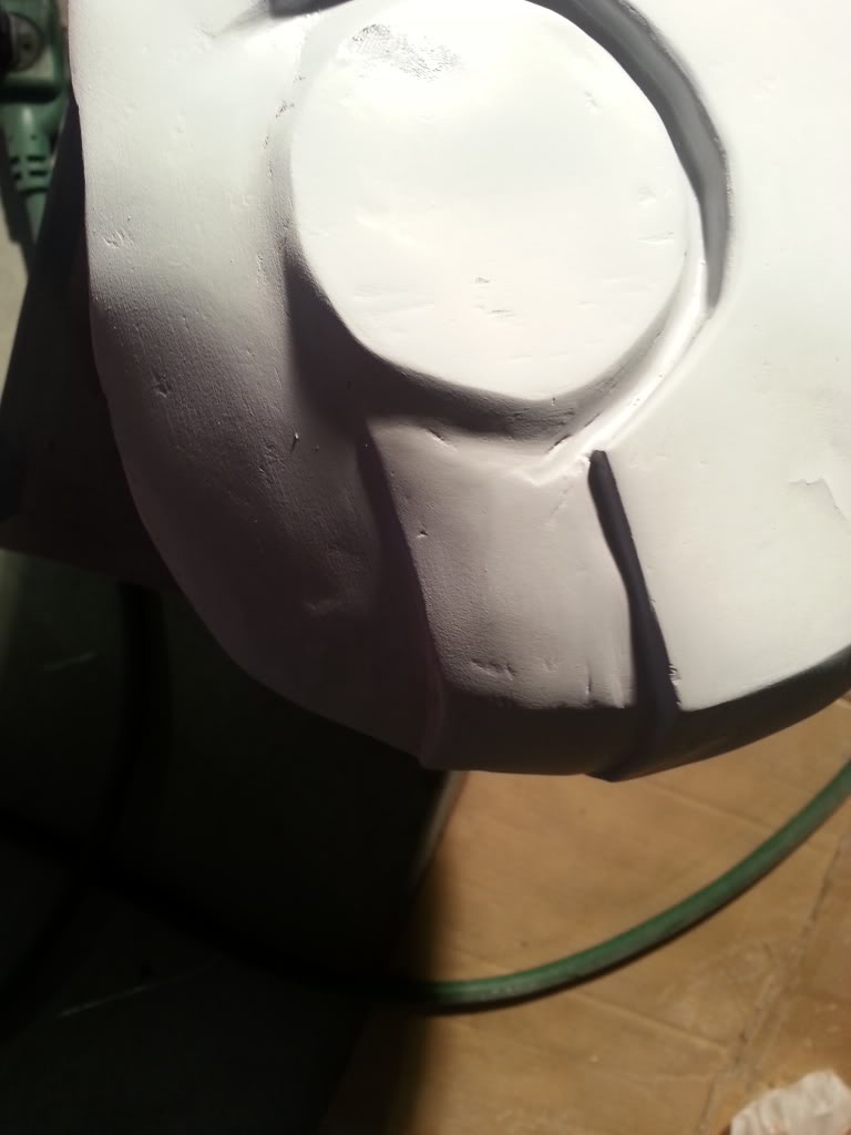 So I threw a light coat of primer onto the helmet today to help show up the flaws in the first layer of bondo. I'll now get to filling the dips with the spot putty, filling some of the deeper mishaps (the sides I knew would need another coat) and sanding down some parts to get them as smooth as possible.