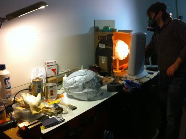 again my helmet (whith a first coat of resin) while emile is cooking his helmet in our "ghetto oven - mark 1 - TM" (curing resin with cold is a big pain)