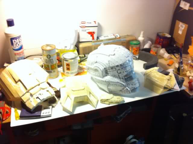 We started with pepakura models (trying to find the most accurate pieces first was the hardest part), then resin, fiberglass, bondo... the same procedure used by alot of people around here...
