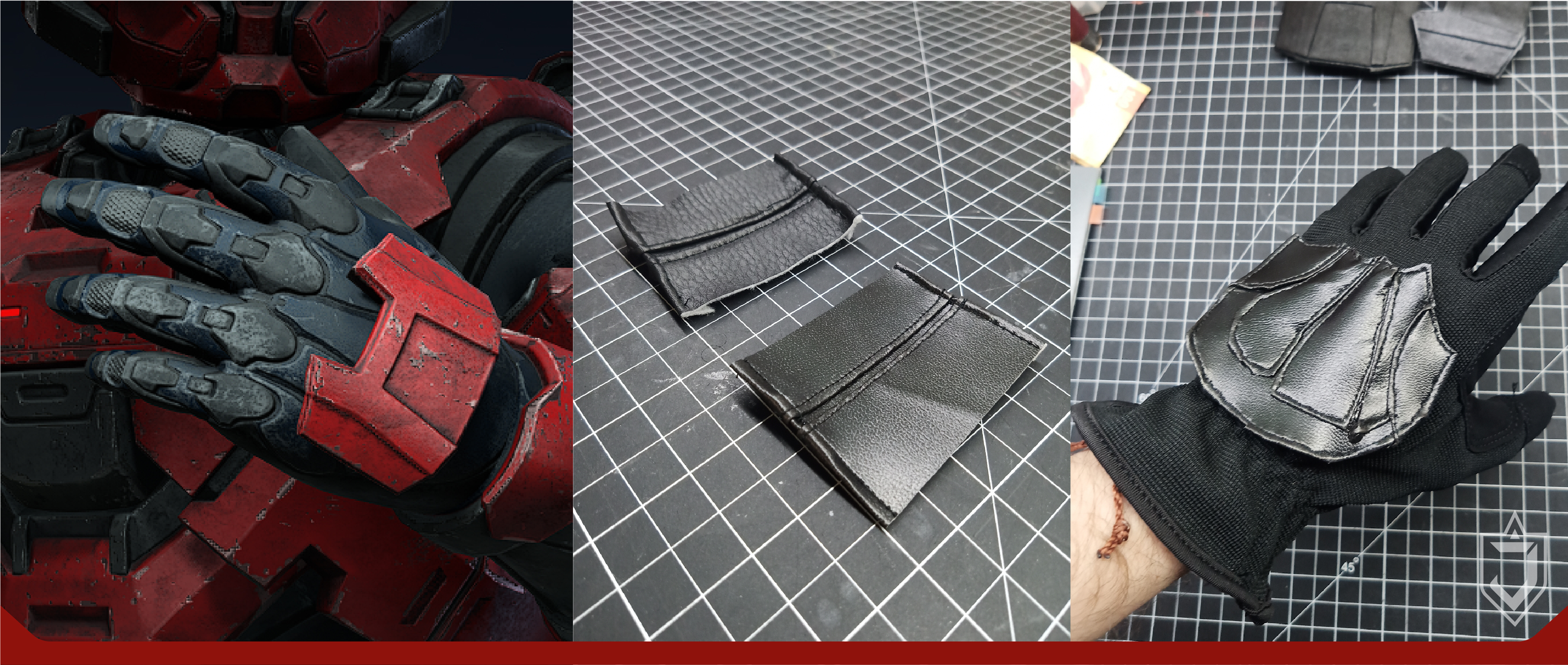 Then, I realized I was missing some details from the top part of the glove on my sketch, so I did some tests in different types of pleather, and did my best to sew that top piece :lol: still, not my greatest sew job, but a nice looking one with the armor pad on the top. (Also, I'm planning to sew the undersuit, and replicate these stitches on it).