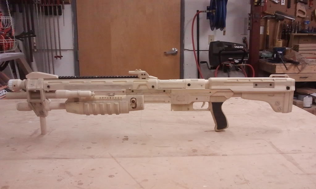 Amazing work man. This is simply a beautiful prop. I can't wait to see it all painted up. How much does the thing weigh right now?