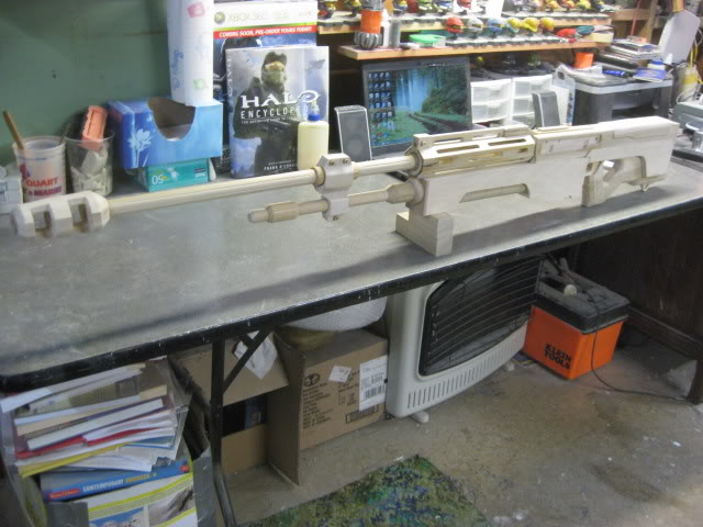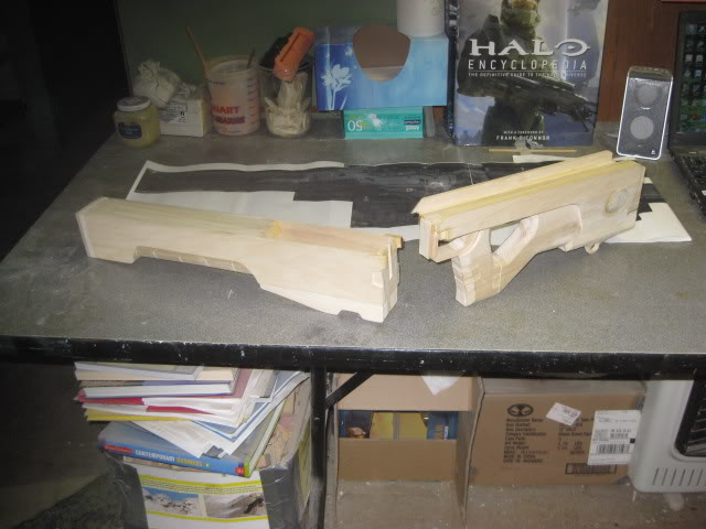 I got the overall length from the Halo Encyclopedia and then my freinds supplied some great screen shots. I cut one side view pic down to just the weapon and blue it up to scale and printed out. You might be able to see it in some of the pics hanging on the wall.
