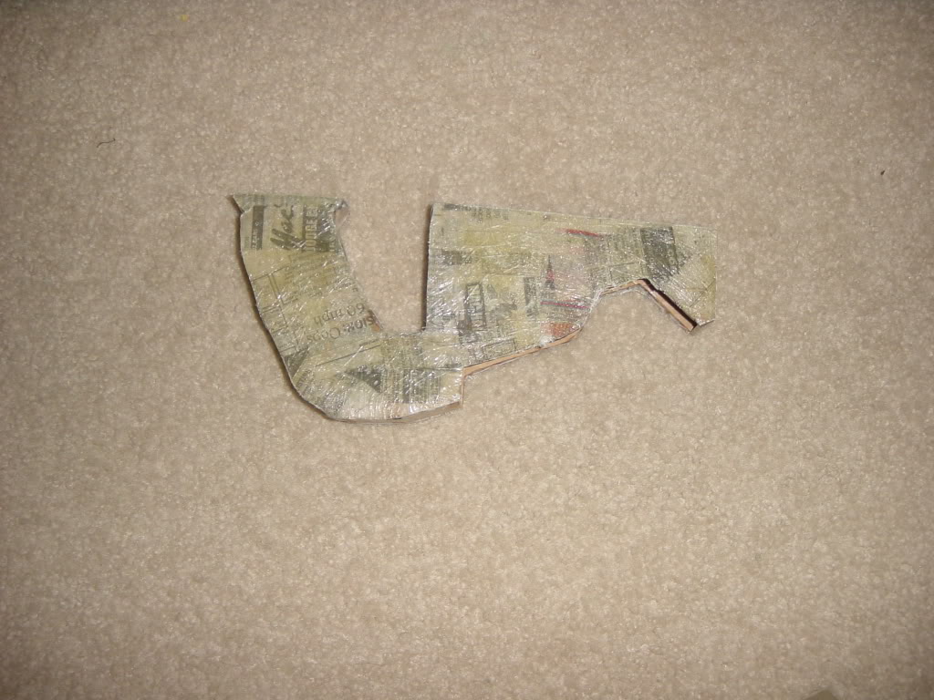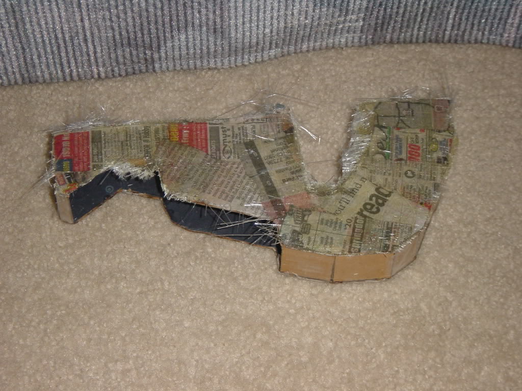 Not an armor update but I started working on the Assault Rifle. I used Wizzard of Flights blueprints. I made the part out of card board, then paper mached it, then fiberglassed it (still have one more side to glass). You can see I still have to do a lot more trimming!