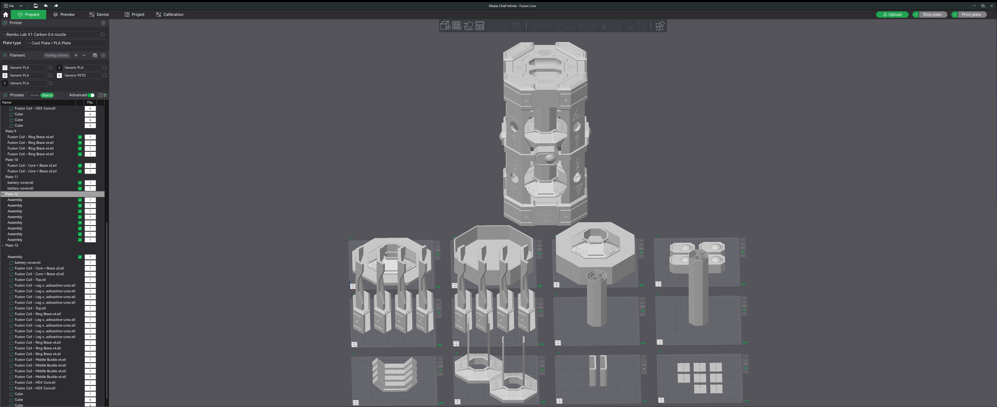 I purchased the original STL model from Halo Fusion Coil | Aguilar Workshop and I heavily modified it to suit my purposes. As you can see I added the engraved 405th logo and a bunch of other labels on it. I printed the max size I could fit on my 3d printer which puts it around 505mm, around 20" tall, which puts it pretty close to real size in the Halo games.
