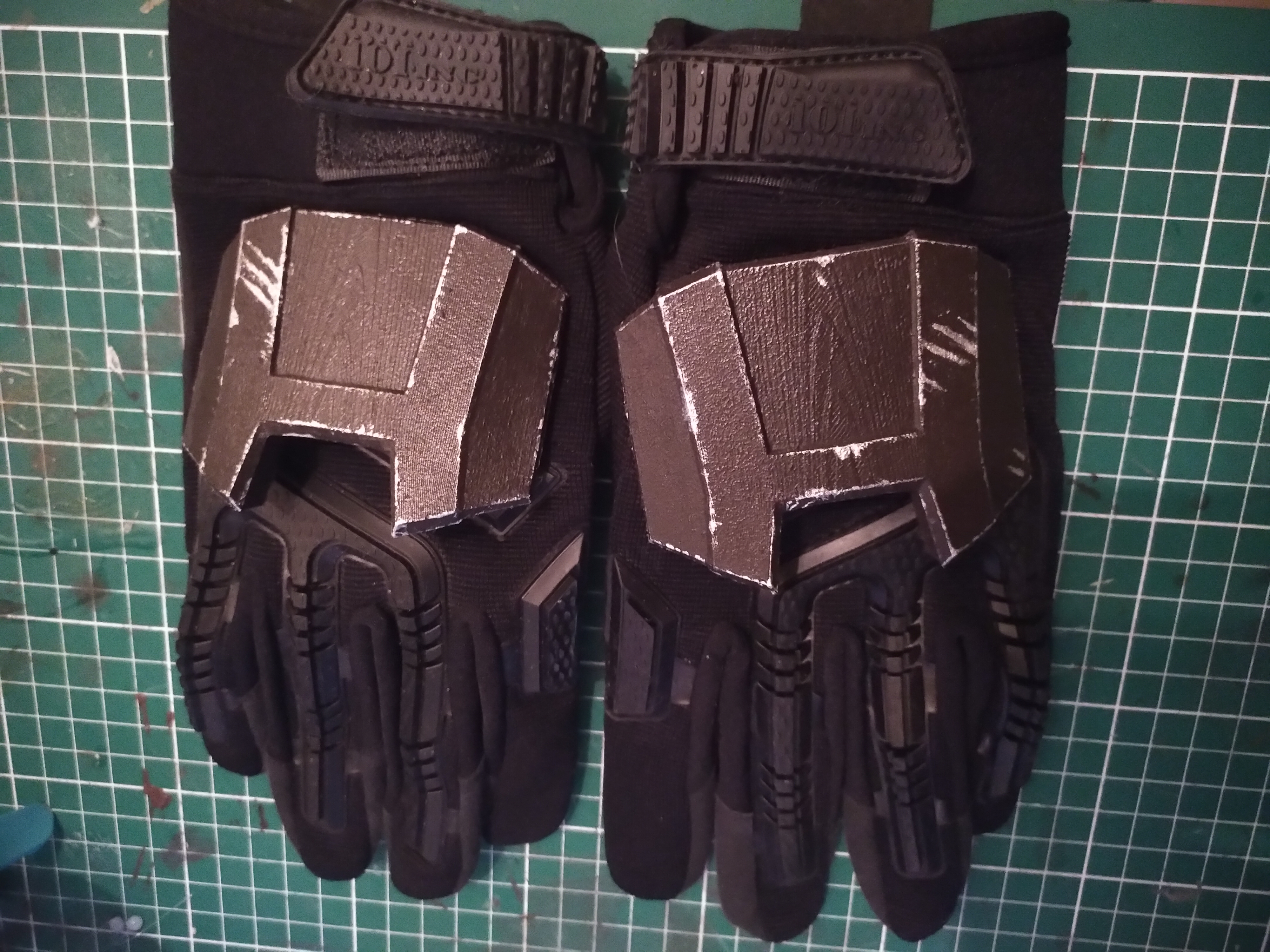 They're 3D printed with PLA (you can see the print lines, I didn't sand them) and attached to the gloves with a copious amount of hot glue.