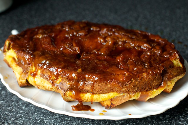 Regardless of baking vessel, place dish in refrigerator and chill until caramel is cold and solid, about 30 minutes. Once chilled, arrange the bread slices. Place the heel of the bread in the center and do what you can to fan the slices around it, overlapping each slightly and knowing with complete confidence that even if your dish doesn’t resemble a blooming rose, nobody will care at all.