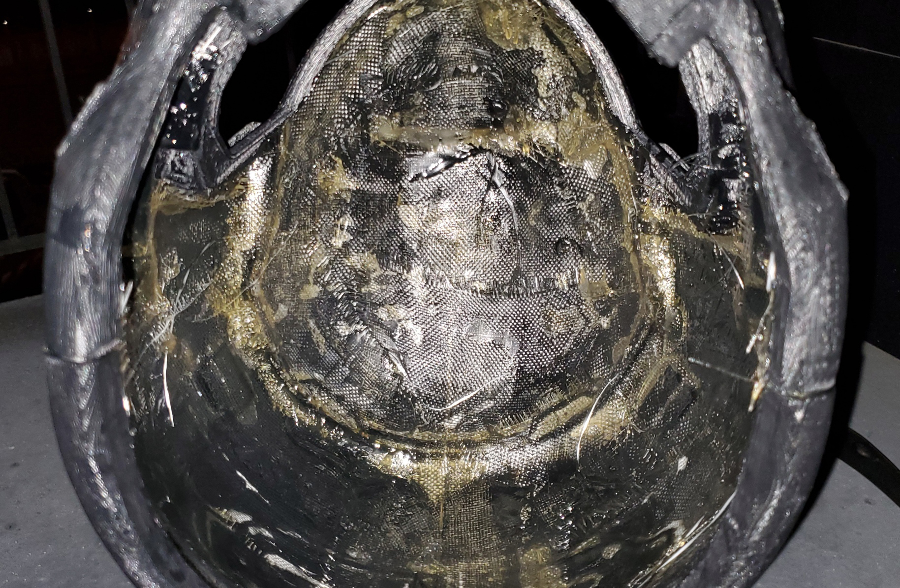 Then you need to decide how you are going to layout your FG mat. With my helmet I started with about 1"strips over the seams as my first layer, kinda like you did with the masking tape on the other side, then a second full coverage layer. Note, this isn't the "proper" way to do this, but it's going to be walking around a convention, not Mars (not yet