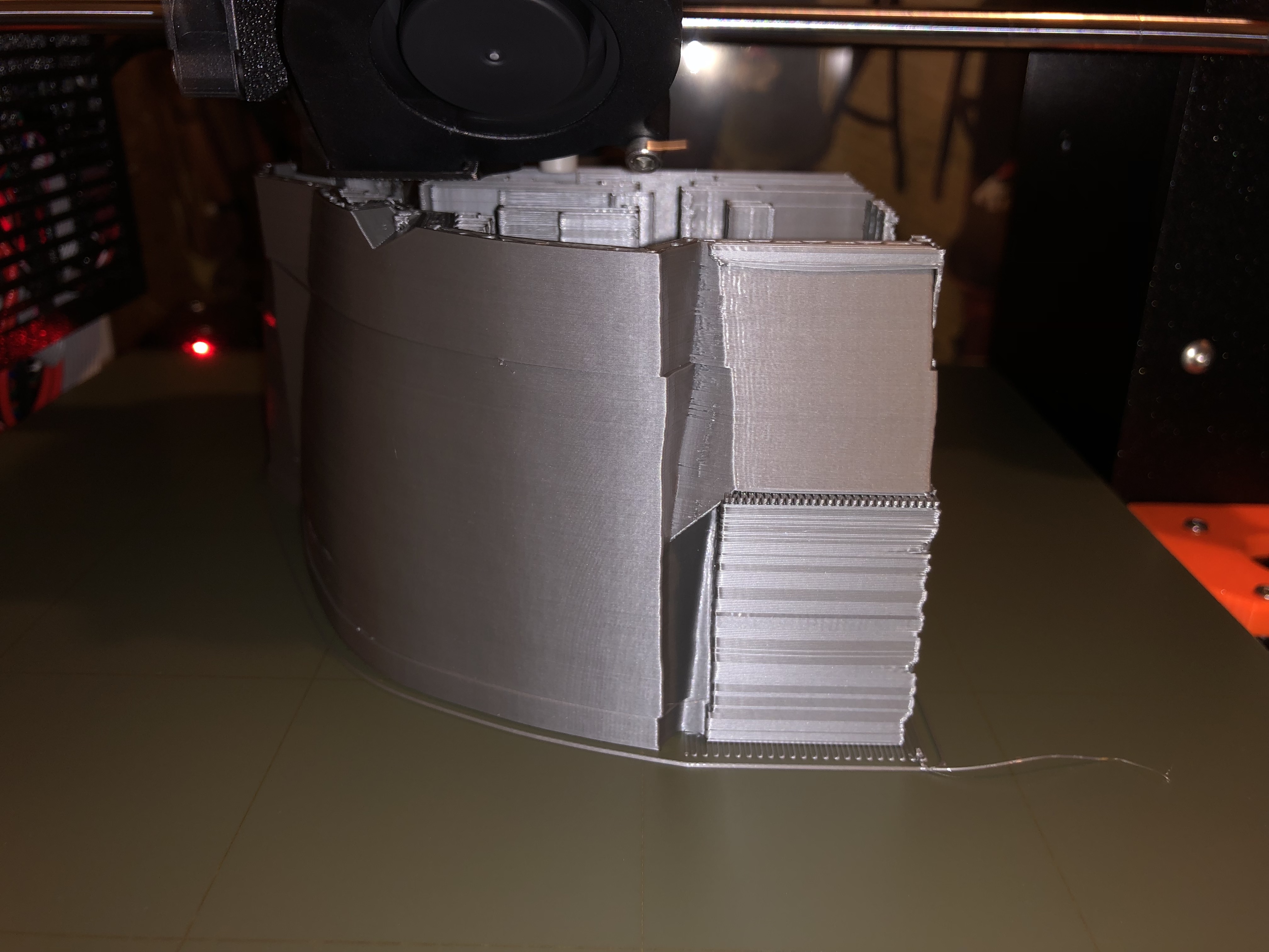First Attempt at printing part of the helmet: (Note the layer shifts since I hadn't dialed in my printer)