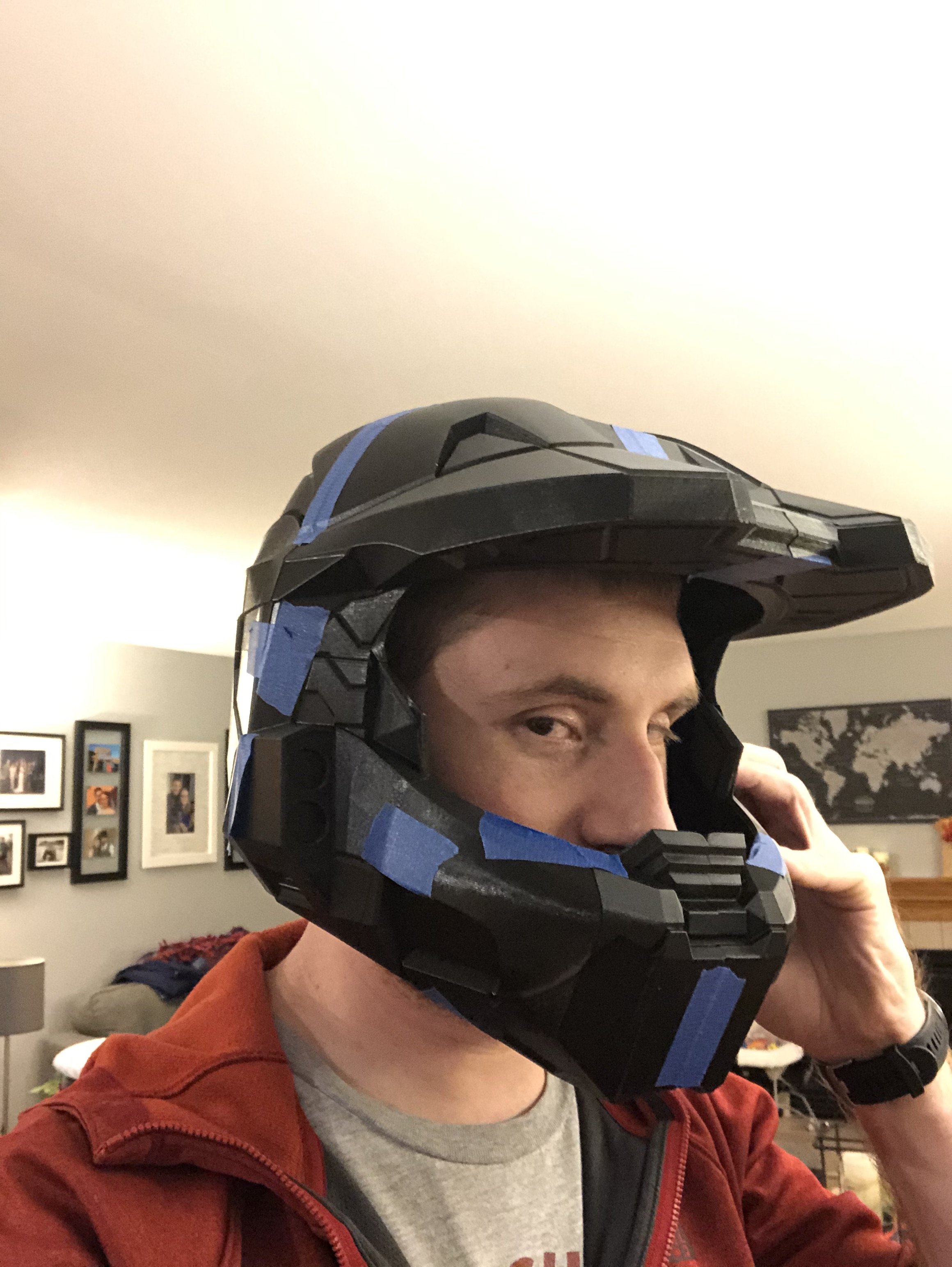 Here is the helmet fully printed (still held together with painters tape). At this point I just had to put it on for a test fit! My wife ended up having to help me take it off since the opening was slightly too small and I couldn't get it off of my head without taking it apart. (there was some harassment about it too)